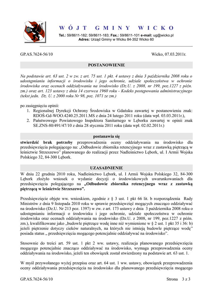 W Ó J T G M I N Y W I C K O Tel.: 59/8611-182; 59/8611-183; Fax.: 59/8611-101 e-mail: [email protected] Adres: Urząd Gminy w Wicku 84-352 Wicko 60 GP.AS.7624-56/10 Wicko, 07.03.2011r. POSTANOWIENIE Na podstawie art. 63 ust. 2 w zw. z art. 75 ust. 1 pkt. 4 ustawy z dnia 3 października 2008 roku o udostępnianiu informacji o środowisku i jego ochronie, udziale społeczeństwa w ochronie środowiska oraz ocenach oddziaływania na środowisko (Dz.U. z 2008, nr 199, poz.1227 z późn. zm.) oraz art. 123 ustawy z dnia 14 czerwca 1960 roku - Kodeks postępowania administracyjnego (tekst jedn. Dz. U. z 2000 roku Nr 98, poz. 1071 ze zm.) po zasięgnięciu opinii: 1. Regionalnej Dyrekcji Ochrony Środowiska w Gdańsku zawartej w postanowieniu znak: RDOŚ-Gd-WOO.4240.25.2011.MS z dnia 24 lutego 2011 roku (data wpł. 03.03.2011r.), 2. Państwowego Powiatowego Inspektora Sanitarnego w Lęborku zawartej w opinii znak SE.ZNS-80/491/47/10 z dnia 28 stycznia 2011 roku (data wpł. 02.02.2011r.) postanawia się stwierdzić brak potrzeby przeprowadzenia oceny oddziaływania na środowisko dla przedsięwzięcia polegającego na: „Odbudowie zbiornika retencyjnego wraz z zastawką piętrzącą w leśnictwie Strzeszewo” planowanego do realizacji przez Nadleśnictwo Lębork, ul. I Armii Wojska Polskiego 32, 84-300 Lębork. UZASADNIENIE W dniu 22 grudnia 2010 roku, Nadleśnictwo Lębork, ul. I Armii Wojska Polskiego 32, 84-300 Lębork złożyło wniosek o wydanie decyzji o środowiskowych uwarunkowaniach dla przedsięwzięcia polegającego na „Odbudowie zbiornika retencyjnego wraz z zastawką piętrzącą w leśnictwie Strzeszewo”. Przedsięwzięcie objęte ww. wnioskiem, zgodnie z § 3 ust. 1 pkt 66 lit. b rozporządzenia Rady Ministrów z dnia 9 listopada 2010 roku w sprawie przedsięwzięć mogących znacząco oddziaływać na środowisko (Dz.U. Nr 213 poz. 1397) w zw. z art. 173 ustawy z dnia 3 października 2008 roku o udostępnianiu informacji o środowisku i jego ochronie, udziale społeczeństwa w ochronie środowiska oraz ocenach oddziaływania na środowisko (Dz.U. z 2008, nr 199, poz.1227 z późn. zm.), kwalifikowane jako „budowle piętrzące wodę inne niż wymienione w § 2 ust. 1 pkt 35 i 36: b) jeżeli piętrzenie dotyczy cieków naturalnych, na których nie istnieją budowle piętrzące wodę” posiada status „ przedsięwzięcia mogącego potencjalnie oddziaływać na środowisko”. Stosownie do treści art. 59 ust. 1 pkt 2 ww. ustawy, realizacja planowanego przedsięwzięcia mogącego potencjalnie znacząco oddziaływać na środowisko, wymaga przeprowadzenia oceny oddziaływania na środowisko, jeżeli ten obowiązek został stwierdzony na podstawie art. 63 ust. 1. W myśl przywołanego wyżej przepisu oraz art. 64 ust. 1 ww. ustawy, obowiązek przeprowadzenia oceny oddziaływania przedsięwzięcia na środowisko dla planowanego przedsięwzięcia mogącego GP.AS.7624-56/10 Strona 3z3 potencjalnie znacząco oddziaływać na środowisko stwierdza, w drodze postanowienia, organ właściwy do wydania decyzji o środowiskowych uwarunkowaniach: – uwzględniając łącznie uwarunkowania określone w art. 63 ust. 1; – po zasięgnięciu opinii: 1) Regionalnego Dyrektora Ochrony Środowiska; 2) organu Państwowej Inspekcji Sanitarnej,o którym mowa w art. 78, w przypadku przedsięwzięć wymagających decyzji, o których mowa w art. 72 ust. 1 pkt. 1-3, 10, 11, 13 i 15. Postanowienie wydaje się również, jeżeli organ nie stwierdzi potrzeby przeprowadzenie oceny oddziaływania przedsięwzięcia na środowisko. Biorąc pod uwagę rodzaj i lokalizację przedsięwzięcia organem właściwym do wydania decyzji w niniejszej sprawie jest zgodnie z art. 75 ust. 1 pkt. 4 ww. ustawy Wójt Gminy Wicko. Działając na podstawie art. 64 ust. 1 Wójt Gminy Wicko pismami znak: GP.AS.7624-56/10 z dnia 28.12.2010r. i znak GP.AS.7624-56/10 z dnia 28.12.2010r. zwrócił się odpowiednio do Regionalnej Dyrekcji Ochrony Środowiska w Gdańsku oraz Państwowego Powiatowego Inspektora Sanitarnego w Lęborku z prośbą o wydanie opinii w przedmiocie konieczności przeprowadzenia oceny oddziaływania przedsięwzięcia na środowisko dla planowanego przedsięwzięcia. Z uzyskanych opinii, wymienionych na wstępie niniejszego postanowienia wynika, że nie istnieje konieczność przeprowadzenia oceny oddziaływania na środowisko. Planowane przedsięwzięcie znajduje się poza obszarami Natura 2000. Najbliżej położone obszary Natura 2000 to ok. 4,6 km na północ „Mierzeja Sarbska” PLH 220018, ok. 8,5 km na południowy wschód „Lasy Lęborskie” PLB 220006 oraz ok. 10 km na południowy zachód „Górkowski Las” PLH 220045. W odległości około 5 km na północ od planowanej inwestycji znajduje się Nadmorski Obszar Chronionego Krajobrazu. Planowana inwestycja nie będzie negatywnie oddziaływać na ww. obszary Natura 2000 oraz pozostałe formy ochrony przyrody. Inwestycja z uwagi na usytuowanie w znacznej odległości od obszarów Natura 2000 i pozostałych form ochrony przyrody, nie spowoduje modyfikacji warunków ekologicznych na ww. obszarach, co mogłoby mieć ewentualne pośrednie oddziaływanie na siedliska przyrodnicze i siedliska gatunków stanowiących przedmiot ochrony w ich granicach. Analizując więc łącznie uwarunkowania określone w art. 63 ust. 1 ww. ustawy oraz informacje zawarte w karcie informacyjnej przedsięwzięcia tut. organ zważył, iż z uwagi na: 1) rodzaj i charakterystykę przedsięwzięcia – planowana inwestycja dotyczy odbudowy istniejącego w przeszłości zbiornika wodnego. W ramach projektu powstanie zbiornik retencyjny o powierzchni 1,10 ha w formie płytkiego, (do 1m), rozlewiska w głębokim obniżeniu terenu. Rozlewisko powstanie na skutek spiętrzenia wody na naturalnym cieku, na którym nie istnieją budowle piętrzące wodę. W ramach zadania przewiduje się wykonanie następujących obiektów: – zastawka – odbudowa istniejącej w tym miejscu zas