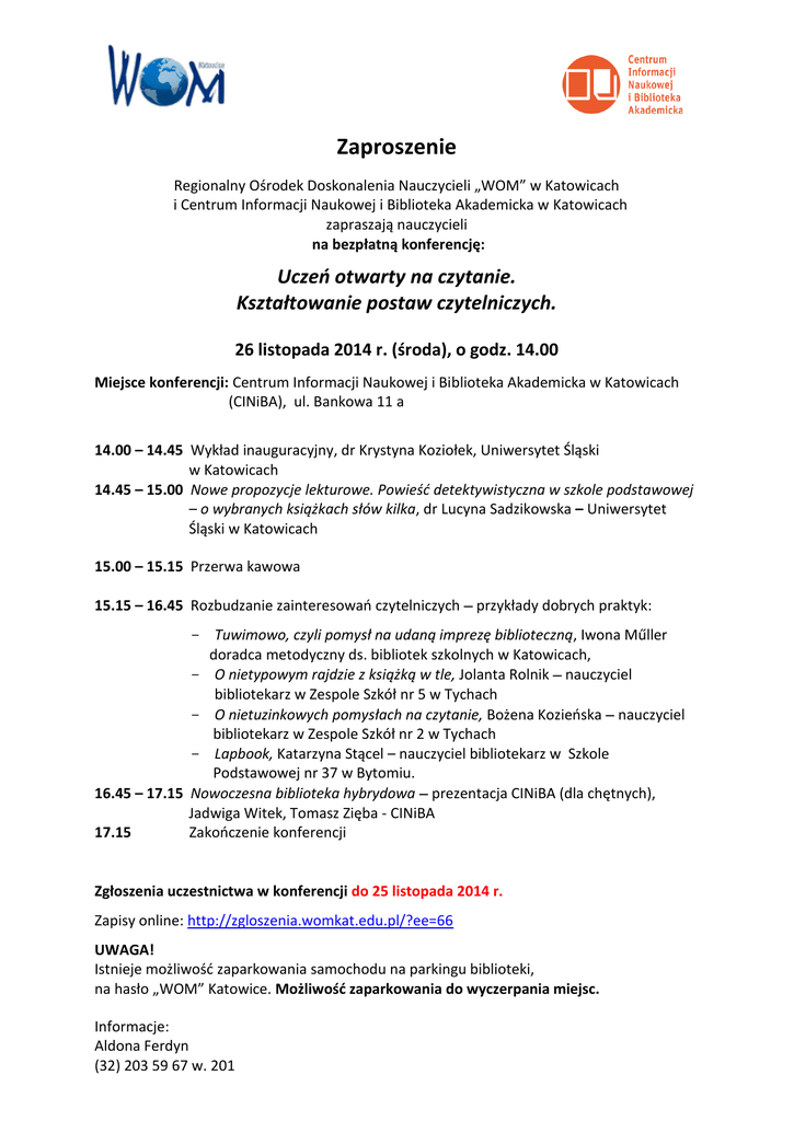Zaproszenie Regionalny Ośrodek Doskonalenia Nauczycieli „WOM” w Katowicach i Centrum Informacji Naukowej i Biblioteka Akademicka w Katowicach zapraszają nauczycieli na bezpłatną konferencję: Uczeń otwarty na czytanie. Kształtowanie postaw czytelniczych. 26 listopada 2014 r. (środa), o godz. 14.00 Miejsce konferencji: Centrum Informacji Naukowej i Biblioteka Akademicka w Katowicach (CINiBA), ul. Bankowa 11 a 14.00 – 14.45 Wykład inauguracyjny, dr Krystyna Koziołek, Uniwersytet Śląski w Katowicach 14.45 – 15.00 Nowe propozycje lekturowe. Powieść detektywistyczna w szkole podstawowej – o wybranych książkach słów kilka, dr Lucyna Sadzikowska – Uniwersytet Śląski w Katowicach 15.00 – 15.15 Przerwa kawowa 15.15 – 16.45 Rozbudzanie zainteresowań czytelniczych przykłady dobrych praktyk: Tuwimowo, czyli pomysł na udaną imprezę biblioteczną, Iwona Műller doradca metodyczny ds. bibliotek szkolnych w Katowicach, O nietypowym rajdzie z książką w tle, Jolanta Rolnik nauczyciel bibliotekarz w Zespole Szkół nr 5 w Tychach O nietuzinkowych pomysłach na czytanie, Bożena Kozieńska nauczyciel bibliotekarz w Zespole Szkół nr 2 w Tychach Lapbook, Katarzyna Stącel – nauczyciel bibliotekarz w Szkole Podstawowej nr 37 w Bytomiu. 16.45 – 17.15 Nowoczesna biblioteka hybrydowa prezentacja CINiBA (dla chętnych), Jadwiga Witek, Tomasz Zięba - CINiBA 17.15 Zakończenie konferencji Zgłoszenia uczestnictwa w konferencji do 25 listopada 2014 r. Zapisy online: http://zgloszenia.womkat.edu.pl/?ee=66 UWAGA! Istnieje możliwość zaparkowania samochodu na parkingu biblioteki, na hasło „WOM” Katowice. Możliwość zaparkowania do wyczerpania miejsc. Informacje: Aldona Ferdyn (32) 203 59 67 w. 201