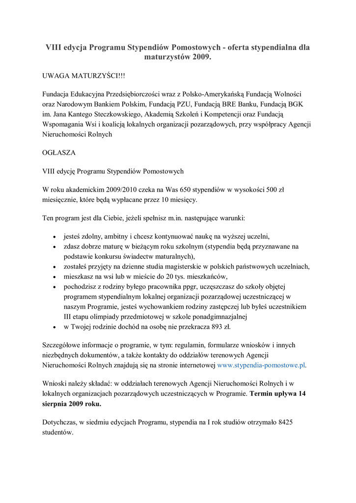 VIII edycja Programu Stypendiów Pomostowych - oferta stypendialna dla maturzystów 2009. UWAGA MATURZY CI!!! Fundacja Edukacyjna Przedsi biorczo ci wraz z Polsko-Ameryka sk Fundacj Wolno ci oraz Narodowym Bankiem Polskim, Fundacj PZU, Fundacj BRE Banku, Fundacj BGK im. Jana Kantego Steczkowskiego, Akademi Szkole i Kompetencji oraz Fundacj Wspomagania Wsi i koalicj lokalnych organizacji pozarz dowych, przy wspó pracy Agencji Nieruchomo ci Rolnych OG ASZA VIII edycj Programu Stypendiów Pomostowych W roku akademickim 2009/2010 czeka na Was 650 stypendiów w wysoko ci 500 z miesi cznie, które b wyp acane przez 10 miesi cy. Ten program jest dla Ciebie, je eli spe nisz m.in. nast puj ce warunki: jeste zdolny, ambitny i chcesz kontynuowa nauk na wy szej uczelni, zdasz dobrze matur w bie cym roku szkolnym (stypendia b przyznawane na podstawie konkursu wiadectw maturalnych), zosta przyj ty na dzienne studia magisterskie w polskich pa stwowych uczelniach, mieszkasz na wsi lub w mie cie do 20 tys. mieszka ców, pochodzisz z rodziny by ego pracownika ppgr, ucz szczasz do szko y obj tej programem stypendialnym lokalnej organizacji pozarz dowej uczestnicz cej w naszym Programie, jeste wychowankiem rodziny zast pczej lub by uczestnikiem III etapu olimpiady przedmiotowej w szkole ponadgimnazjalnej w Twojej rodzinie dochód na osob nie przekracza 893 z . Szczegó owe informacje o programie, w tym: regulamin, formularze wniosków i innych niezb dnych dokumentów, a tak e kontakty do oddzia ów terenowych Agencji Nieruchomo ci Rolnych znajduj si na stronie internetowej www.stypendia-pomostowe.pl. Wnioski nale y sk ada : w oddzia ach terenowych Agencji Nieruchomo ci Rolnych i w lokalnych organizacjach pozarz dowych uczestnicz cych w Programie. Termin up ywa 14 sierpnia 2009 roku. Dotychczas, w siedmiu edycjach Programu, stypendia na I rok studiów otrzyma o 8425 studentów.