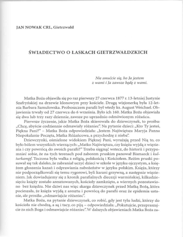 JAN NOWAK CRL, Gietrzwałd ŚWIADECTWO O ŁASKACH GIETRZWAŁDZKICH Nie smućcie się, bo Ja jestem z wami i Ja zawsze będę z wami. Matka Boża objawiła się po raz pierwszy 27 czerwca 1877 r. 13-letniej Justynie Szafryńskiej na drzewie klonowym przy kościele. Drugą wizjonerką była 12-let nia Barbara Samulowska. Proboszczem parafii był wtedy ks. August Weichsel. Ob jawienia trwały od 27 czerwca do 6 września. Było ich 160. Matka Boża objawiała się dwa lub trzy razy dziennie, zawsze po uprzednio odmówionym różańcu. Pierwsze życzenie, jakie Matka Boża skierowała do dziewczynek, to prośba: „Chcę, abyście codziennie odmawiały różaniec”. Na pytanie dzieci: „Kto Ty jesteś, Piękna Pani?” – Matka Boża odpowiedziała: „Jestem Najświętsza Maryja Panna Niepokalanie Poczęta, Matka Różańcowa, a przychodzę z nieba”. Dziewczynki, ośmielone widokiem Pięknej Pani, wyrażają przed Nią to, co było bólem wszystkich wierzących: „Matko Najświętsza, czy księża wyjdą z więzie nia i czy powrócą do swoich parafii?” Trzeba sięgnąć wstecz, do historii i przypo mnieć sobie, że na tych terenach pod zaborem pruskim panował Bismarck i kul turkampf Toczona była walka z religią, polskością i Kościołem. Reżim pruski po suwał się tak daleko, że zabraniał uczyć dzieci w szkole w języku ojczystym, a księ żom głoszenia kazań i odprawiania nabożeństw w języku polskim. Księża, którzy nie podporządkowali się temu rygorowi, byli karani grzywną, a następnie więzie niem. Jak dowiadujemy się z kronik parafialnych diecezji warmińskiej, kilkudzie sięciu księży zostało aresztowanych, kościoły zamknięto, a wiernych pozostawio no bez księdza. Nie dziwi nas więc skarga dziewczynek przed Matką Bożą, która pocieszała, że księża wyjdą z aresztu i powrócą do parafii oraz że epidemia usta nie, ale prosiła: „odmawiajcie różaniec”. Matka Boża, na pytanie dziewczynek, co robić, gdy jest tylu ludzi, którzy do kościoła nie chodzą, a są i tacy, co piją – odpowiedziała: „Pokutujcie, przepraszaj cie za nich Boga i odmawiajcie różaniec”. W dalszych objawieniach Matka Boża za 106 JAN NOWAK CRL chęcała do gorliwości i pobożności, wierności małżeńskiej, skromności, czystości, uczciwości i sprawiedliwości społecznej, łagodności i cierpliwości. 9 lipca Matka Boża prosiła, by obok drzewa klonowego, na którym się obja wiała, wybudować kapliczkę, a w niej umieścić figurę Niepokalanej. 8 września pobłogosławiła źródełko, ok. 300 m od świątyni pod lasem i wy tłumaczyła dlaczego: „Aby chorzy, którzy tu będą przychodzić i czerpać tę wodę, nią się obmywać i pić, mogli otrzymać zdrowie”. Matka Boża prosiła o modlitwę i zaufanie do Boga. W zapowiedziany przez Matkę Bożą dzień 8 września zgro madziło się około 50 tys. wiernych, którzy na klęczkach odmawiali cały różaniec i śpiewali Pod Twoją obronę. Wszyscy zobaczyli w powietrzu piękny obłok, niezna ne światło, a w tym świetle rękę, która błogosławiła. Natomiast Justyna i Basia wi działy Matkę Bożą tak samo jak zawsze przy kościele – na klonie. Matka Boża zna kiem krzyża pobłogosławiła źródełko. 12 września poświęcono wybudowaną obok drzewa klonowego kapliczkę i fi gurę przywiezioną z Monachium. Po poświęceniu Matka Boża skierowała do dziew czynek drugą prośbę: „Aby chorzy, którzy tu będą przychodzić, przynosili ze sobą lniane płótna i wykładali je na kapliczkę, żeby się modlili i ufali Bogu, a następnie te płócienka zabierali ze sobą i przykładali na chore miejsca, a będą uzdrowieni”. 16 września 1877 r. miało miejsce ostatnie spotkanie dzieci z Matką Bożą, któ ra wypowiedziała takie słowa: „Nie smućcie się, bo Ja jestem z wami i Ja zawsze będę z wami”. Jakież miłe i pełne nadziei dla każdego są słowa Matki Bożej. Nale ży zaznaczyć, że przyrzeczenia, które Matka Boża wypowiedziała 125 lat temu w Gietrzwałdzie, spełniają się po dzień dzisiejszy. Maryja jest tu w szczególny spo sób obecna i pomaga wszystkim, którzy się do Niej zwracają z zaufaniem i proszą Ją o przyczynę, wstawiennictwo i pomoc. Świadczą o tym wota, zawieszone na ścianach prezbiterium świątyni (cho ciaż to jest tylko mała część) na znak wdzięczności i podziękowania za otrzymane łaski, świadczą opisy cudownych uzdrowień duszy i ciała, spisane pod przysięgą i potwierdzone orzeczeniami komisji lekarskich. 45 cudownych uzdrowień dokonało się w mojej obecności, jestem ich naocz nym świadkiem. Pragnę powiedzieć o trzech z nich. Pierwsze miało miejsce w 1967 r., w dniu uroczystości koronacji cudami i ła skami słynącego XVI-wiecznego obrazu Matki Bożej Gietrzwałdzkiej. Głównym koronatorem obrazu był Prymas Polski kard. Stefan Wyszyński, a współkoronatorem – obecny Ojciec Święty, a wtedy metropolita krakowski kard. Karol Wojtyła. Na uroczystość koronacji obrazu do Gietrzwałdu przybyło z róż nych stron Polski i zagranicy około 200 tys. wiernych. Przyjechali Księża Kanoni cy Regularni Laterańscy z różnych placówek w Polsce. Podczas triduum, dwa dni przed uroczystością koronacji, zauważyłem pa nią, która towarzyszyła młodszemu panu. Jak się później okazało, to był jej 18-let ŚWIADECTWO O ŁASKACH GIETRZWAŁDZKICH 107 ni syn, zupełnie niewidomy, którego prowadziła pod ramię. Bardzo pobożnie się modlili, odmawiali różaniec, odprawiali Drogę Krzyżową naokoło kościoła. Wi działem ich leżących krzyżem na posadzce przed Cudownym Obrazem w kościele i przy kapliczce objawień. Po skończonych uroczystościach koronacyjnych, wier ni się rozchodzili, niektórzy cisnęli się jeszcze do źródełka, by choć trochę wody zabrać ze sobą. Pamiętam, była godzina 15.00, pilnowałem porządku przy źródełku i zauwa żyłem, jak matka zbliżała się ze swym syn