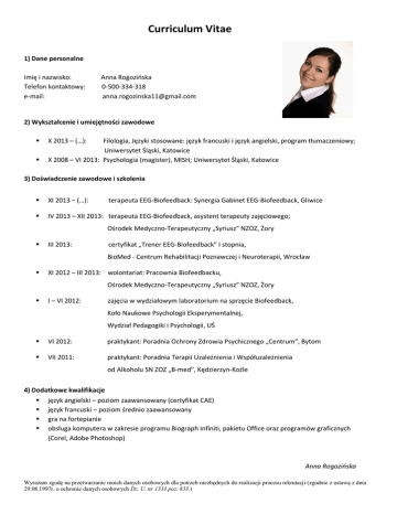 Curriculum Vitae 1) Dane personalne Imię i nazwisko: Telefon kontaktowy: e-mail: Anna Rogozińska 0-500-334-318 [email protected] 2) Wykształcenie i umiejętności zawodowe X 2013 – (…): Filologia, Języki stosowane: język francuski i język angielski, program tłumaczeniowy; Uniwersytet Śląski, Katowice X 2008 – VI 2013: Psychologia (magister), MISH; Uniwersytet Śląski, Katowice 3) Doświadczenie zawodowe i szkolenia XI 2013 – (…): IV 2013 – XII 2013: terapeuta EEG-Biofeedback, asystent terapeuty zajęciowego; terapeuta EEG-Biofeedback: Synergia Gabinet EEG-Biofeedback, Gliwice Ośrodek Medyczno-Terapeutyczny „Syriusz” NZOZ, Żory III 2013: certyfikat „Trener EEG-Biofeedback” I stopnia, BioMed - Centrum Rehabilitacji Poznawczej i Neuroterapii, Wrocław XI 2012 – III 2013: wolontariat: Pracownia Biofeedbacku, Ośrodek Medyczno-Terapeutyczny „Syriusz” NZOZ, Żory I – VI 2012: zajęcia w wydziałowym laboratorium na sprzęcie Biofeedback, Koło Naukowe Psychologii Eksperymentalnej, Wydział Pedagogiki i Psychologii, UŚ VI 2012: praktykant: Poradnia Ochrony Zdrowia Psychicznego „Centrum”, Bytom VII 2011: praktykant: Poradnia Terapii Uzależnienia i Współuzależnienia od Alkoholu SN ZOZ „B-med”, Kędzierzyn-Koźle 4) Dodatkowe kwalifikacje język angielski – poziom zaawansowany (certyfikat CAE) język francuski – poziom średnio zaawansowany gra na fortepianie obsługa komputera w zakresie programu Biograph Infiniti, pakietu Office oraz programów graficznych (Corel, Adobe Photoshop) Anna Rogozińska Wyrażam zgodę na przetwarzanie moich danych osobowych dla potrzeb niezbędnych do realizacji procesu rekrutacji (zgodnie z ustawą z dnia 29.08.1997r. o ochronie danych osobowych Dz. U. nr 1333 poz. 833.)