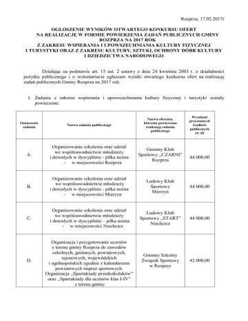 Rozprza, 17.02.2017r OGŁOSZENIE WYNIKÓW OTWARTEGO KONKURSU OFERT NA REALIZACJĘ W FORMIE POWIERZENIA ZADAŃ PUBLICZNYCH GMINY ROZPRZA NA 2017 ROK Z ZAKRESU WSPIERANIA I UPOWSZECHNIANIA KULTURY FIZYCZNEJ I TURYSTYKI ORAZ Z ZAKRESU KULTURY, SZTUKI, OCHRONY DÓBR KULTURY I DZIEDZICTWA NARODOWEGO Działając na podstawie art. 15 ust. 2 ustawy z dnia 24 kwietnia 2003 r. o działalności pożytku publicznego i o wolontariacie ogłaszam wyniki otwartego konkursu ofert na realizację zadań publicznych Gminy Rozprza na 2017 rok: I. Zadania z zakresu wspierania i upowszechniania kultury fizycznej i turystyki zostały powierzone: Wysokość przyznanych środków publicznych (w zł) Oznaczenie zadania Nazwa zadania publicznego Nazwa oferenta, któremu powierzono realizację zadania publicznego A. Organizowanie szkolenia oraz udział we współzawodnictwie młodzieży i dorosłych w dyscyplinie - piłka nożna - w miejscowości Rozprza Gminny Klub Sportowy ,,CZARNI” Rozprza B. Organizowanie szkolenia oraz udział we współzawodnictwie młodzieży i dorosłych w dyscyplinie - piłka nożna - w miejscowości Mierzyn Ludowy Klub Sportowy Mierzyn 44 000,00 C. Organizowanie szkolenia oraz udział we współzawodnictwie młodzieży i dorosłych w dyscyplinie – piłka nożna - w miejscowości Niechcice Ludowy Klub Sportowy ,,START” Niechcice 44 000,00 D. Organizacja i przygotowanie uczniów z terenu gminy Rozprza do zawodów szkolnych, gminnych, powiatowych, rejonowych, wojewódzkich i ogólnopolskich zgodnie z kalendarzem powiatowych imprez sportowych. Organizacja ,,Spartakiady przedszkolaków” oraz ,,Spartakiady dla uczniów klas I-IV” z terenu gminy Gminny Szkolny Związek Sportowy w Rozprzy 42 000,00 44 000,00 E. Organizowanie szkolenia oraz udział we współzawodnictwie młodzieży z terenu gminy Rozprza w dyscyplinie – piłka siatkowa. Organizacja obozu sportowego dla szkolonej młodzieży Ludowy Uczniowski Międzyszkolny Klub Sportowy ,,KASZTELAN” F. Organizowanie szkolenia, przygotowanie uczniów do współzawodnictwa sportowego i udział w rozgrywkach w dyscyplinie piłka nożna dla dzieci do lat 15 z terenu gminy Uczniowski Klub Sportowy GMINA ROZPRZA 20 000,00 G. Organizowanie imprez sportoworekreacyjnych dla lokalnej społeczności na terenie Gminy Rozprza. Uczestnictwo lokalnej społeczności w zawodach, turniejach i rozgrywkach sportowych o różnym zasięgu Gminne Zrzeszenie Ludowe Zespoły Sportowe w Rozprzy 36 000,00 H. Organizacji turystyczno-wypoczynkowego wyjazdu dzieci i młodzieży z terenu Gminy Rozprza Związek Harcerstwa Polskiego Hufiec ZHP Piotrków Tryb 20 000,00 42 000,00 RAZEM 292 000,00 II. Zadania publiczne z zakresu kultury, sztuki, ochrony dóbr kultury i dziedzictwa narodowego zostały powierzone: Wysokość przyznanych środków publicznych (w zł) Oznaczenie zadania Nazwa zadania publicznego Nazwa oferenta, któremu powierzono realizację zadania publicznego H. Prowadzenie zajęć mających na celu podniesienie umiejętności muzycznych młodzieży i dorosłych oraz przygotowanie jej do występów w miejscowości Longinówka Ochotnicza Straż Pożarna w Longinówce 19 000,00 I. Prowadzenie zajęć mających na celu podniesienie umiejętności muzycznych młodzieży i dorosłych oraz przygotowanie jej do występów w miejscowości Mierzyn Ochotnicza Straż Pożarna w Mierzynie 16 500,00 J. Prowadzenie zajęć mających na celu podniesienie umiejętności muzycznych młodzieży i dorosłych oraz przygotowanie jej do występów w miejscowości Rozprza Stowarzyszenie Kulturalno- Społeczne „KASZTELANIA SWING BAND” 16 500,00 K. Rozpowszechnianie tradycji lokalnych i regionalnych oraz organizowanie i przygotowanie dla mieszkańców Gminy Rozprza wystaw i imprez kulturalnych podtrzymujących tradycje lokalne RAZEM Stowarzyszenie Gospodyń Gminy Rozprza 20 000,00 72 000,00