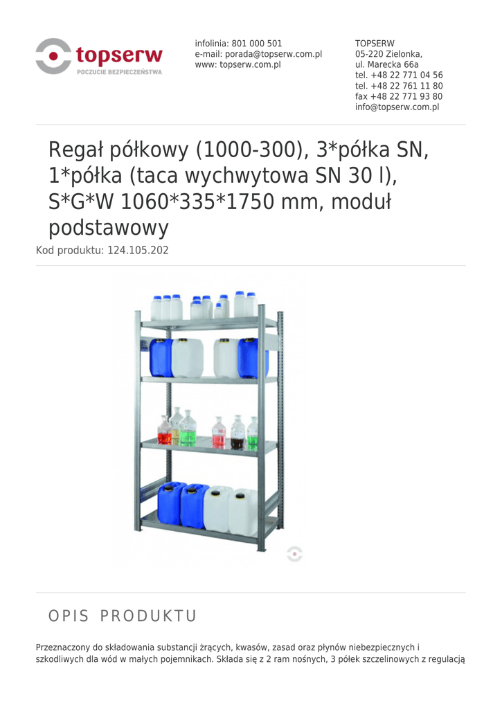 infolinia: 801 000 501 e-mail: [email protected] www: topserw.com.pl TOPSERW 05-220 Zielonka, ul. Marecka 66a tel. +48 22 771 04 56 tel. +48 22 761 11 80 fax +48 22 771 93 80 [email protected] Regał półkowy (1000-300), 3*półka SN, 1*półka (taca wychwytowa SN 30 l), S*G*W 1060*335*1750 mm, moduł podstawowy Kod produktu: 124.105.202 OPIS PRODUKTU Przeznaczony do składowania substancji żrących, kwasów, zasad oraz płynów niebezpiecznych i szkodliwych dla wód w małych pojemnikach. Składa się z 2 ram nośnych, 3 półek szczelinowych z regulacją wysokości co 25 mm oraz 1 półki dolnej w formie tacy wychwytowej (30 l). Posiada wzmocnienia boczne, które poprawiają stabilność i wytrzymałość regału. Wszystko w wykonaniu ze stali nierdzewnej (SN 1.4301). Szczególnie przydatny do stosowania w laboratoriach, szpitalach, przemyśle spożywczym i branży HORECA. Umożliwia optymalne wykorzystanie przestrzeni magazynowej. Pozwala na składowanie mniejszych pojemników w pozycji stojącej. Przez zastosowanie modułu dodatkowego (opcja), znacząco zwiększa się powierzchnia składowania. Regał dostarczany w postaci niezmontowanej (niższe koszty dostawy), do złożenia na miejscu ustawienia przez użytkownika. Wymiary W*S*G 1750*1060*330 mm, nośność półki przy równomiernie rozłożonym obciążeniu 150 kg. DANE TECHNICZNE Przeznaczenie Na pojemniki Wymiary S*G*W 1060*335*1750 mm Ilość półek 3 AKCESORIA Regał półkowy (1000-300), 3*półka SN, 1*półka (taca wychwytowa SN 30 l), S*G*W 1060*335*1750 mm, moduł dodatkowy 124.105.203 CERTYFIKATY POWIĄZANE Produkt Przeznaczenie Rodzaj półek Ilość półek Pojemność wanny wychwytowej [l] Regał półkowy (1000-300), 3*półka SN, 1*półka (taca wychwytowa SN 30 l), S*G*W 1060*335*1750 mm, moduł podstawowy Na pojemniki -- 3 -- Regał półkowy (1000-300), 3*półka SN, 1*półka (taca wychwytowa SN 30 l), S*G*W 1060*335*1750 mm, moduł dodatkowy Na pojemniki -- 3 --