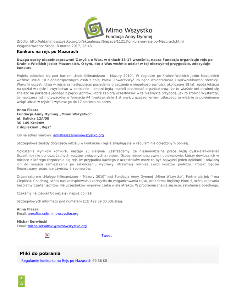 Źródło: http://old.mimowszystko.org/pl/aktualnosci/biezace/1121,Konkurs-na-rejs-po-Mazurach.html Wygenerowano: Środa, 8 marca 2017, 12:48 Konkurs na rejs po Mazurach Uwaga osoby niepełnosprawne! Z myślą o Was, w dniach 13-17 września, nasza Fundacja organizuje rejs po Krainie Wielkich Jezior Mazurskich. O tym, kto z Was weźmie udział w tej niezwykłej przygodzie, zdecyduje konkurs. Projekt odbędzie się pod hasłem „Małe Kilimandżaro – Mazury 2010”. W żegludze po Krainie Wielkich Jezior Mazurskich weźmie udział 10 niepełnosprawnych osób z całej Polski. Towarzyszyć im będą wolontariusze i wykwalifikowani sternicy. Warunki uczestnictwa w rejsie są następujące: posiadanie orzeczenia o niepełnosprawności, ukończone 18 lat, zgoda lekarza na udział w rejsie i zwycięstwo w konkursie – chętni będą musieli przekonać organizatorów, że to właśnie oni powinni się znaleźć na pokładzie jednego z pięciu jachtów, które zabiorą uczestników w tę niezwykłą przygodę. Jak to zrobić? Wystarczy, że napiszesz list motywacyjny w formacie A4 (maksymalnie 3 strony), z uzasadnieniem „dlaczego to właśnie ja powinienem wziąć udział w rejsie” i wyślesz go do 17 sierpnia na adres Anna Flasza Fundacja Anny Dymnej „Mimo Wszystko” ul. Balicka 12A/5B 30-149 Kraków z dopiskiem „Rejs” lub na adres mailowy: [email protected] Szczegółowe zasady dotyczące udziału w konkursie i rejsie znajdują się w regulaminie dołączonym poniżej. Ogłoszenie wyników konkursu nastąpi 23 sierpnia. Zastrzegamy, że niesamodzielne prace będą dyskwalifikowane! Uczestnicy nie ponoszą żadnych kosztów związanych z rejsem. Osoby niepełnosprawne i opiekunowie, którzy dowiozą ich w miejsce z którego rozpocznie się rejs (w przypadku każdego z uczestników może to być najwyżej jeden opiekun) i odwiozą ich do miejsca zamieszkania po zakończeniu wyprawy, otrzymają również zwrot kosztów podróży. Projekt będzie finansowany przez darczyńców i sponsorów. Organizatorem „Małego Kilimandżaro – Mazury 2010” jest Fundacja Anny Dymnej „Mimo Wszystko”. Partnerują jej: firma Ciepliński Coaching, która nas zainspirowała i zachęciła do zorganizowania rejsu, oraz firma Błękitny Piotruś, która zapewnia bezpłatny czarter jachtów. Na uczestników wyprawy czeka wiele atrakcji. W programie znajdą się m.in. szkolenia z coachingu. Czekamy na Ciebie! Odważ się i napisz do nas! Szczegółowych informacji pod numerem (12) 422 69 03 udzielają: Anna Flasza Email: [email protected] Michał Serwiński Email: [email protected] Tweet Pliki do pobrania Regulamin konkursu na Rejs po Mazurach 69.38 KB
