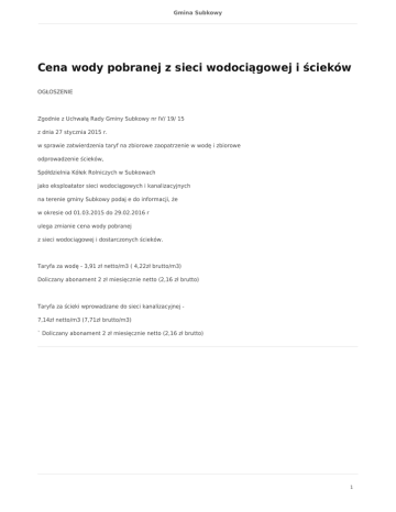 Gmina Subkowy Cena wody pobranej z sieci wodociągowej i ścieków OGŁOSZENIE Zgodnie z Uchwałą Rady Gminy Subkowy nr IV/ 19/ 15 z dnia 27 stycznia 2015 r. w sprawie zatwierdzenia taryf na zbiorowe zaopatrzenie w wodę i zbiorowe odprowadzenie ścieków, Spółdzielnia Kółek Rolniczych w Subkowach jako eksploatator sieci wodociągowych i kanalizacyjnych na terenie gminy Subkowy podaj e do informacji, że w okresie od 01.03.2015 do 29.02.2016 r ulega zmianie cena wody pobranej z sieci wodociągowej i dostarczonych ścieków. Taryfa za wodę - 3,91 zł netto/m3 ( 4,22zł brutto/m3) Doliczany abonament 2 zł miesięcznie netto (2,16 zł brutto) Taryfa za ścieki wprowadzane do sieci kanalizacyjnej 7,14zł netto/m3 (7,71zł brutto/m3) ` Doliczany abonament 2 zł miesięcznie netto (2,16 zł brutto) 1