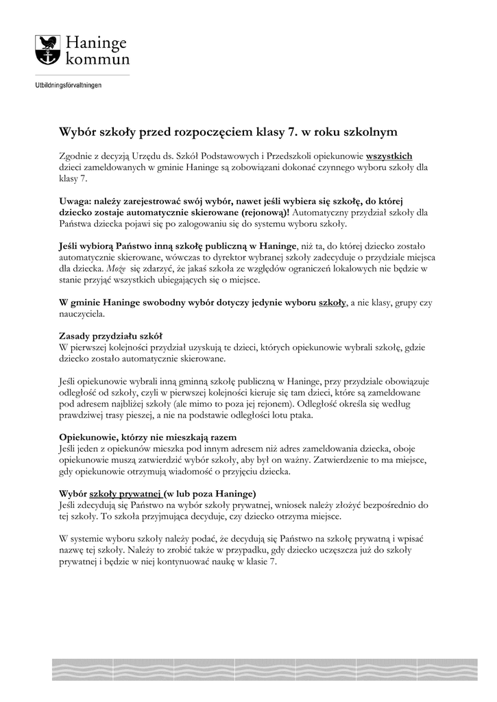 Wybór szkoły przed rozpoczęciem klasy 7. w roku szkolnym Zgodnie z decyzją Urzędu ds. Szkół Podstawowych i Przedszkoli opiekunowie wszystkich dzieci zameldowanych w gminie Haninge są zobowiązani dokonać czynnego wyboru szkoły dla klasy 7. Uwaga: należy zarejestrować swój wybór, nawet jeśli wybiera się szkołę, do której dziecko zostaje automatycznie skierowane (rejonową)! Automatyczny przydział szkoły dla Państwa dziecka pojawi się po zalogowaniu się do systemu wyboru szkoły. Jeśli wybiorą Państwo inną szkołę publiczną w Haninge, niż ta, do której dziecko zostało automatycznie skierowane, wówczas to dyrektor wybranej szkoły zadecyduje o przydziale miejsca dla dziecka. Może się zdarzyć, że jakaś szkoła ze względów ograniczeń lokalowych nie będzie w stanie przyjąć wszystkich ubiegających się o miejsce. W gminie Haninge swobodny wybór dotyczy jedynie wyboru szkoły, a nie klasy, grupy czy nauczyciela. Zasady przydziału szkół W pierwszej kolejności przydział uzyskują te dzieci, których opiekunowie wybrali szkołę, gdzie dziecko zostało automatycznie skierowane. Jeśli opiekunowie wybrali inną gminną szkołę publiczną w Haninge, przy przydziale obowiązuje odległość od szkoły, czyli w pierwszej kolejności kieruje się tam dzieci, które są zameldowane pod adresem najbliżej szkoły (ale mimo to poza jej rejonem). Odległość określa się według prawdziwej trasy pieszej, a nie na podstawie odległości lotu ptaka. Opiekunowie, którzy nie mieszkają razem Jeśli jeden z opiekunów mieszka pod innym adresem niż adres zameldowania dziecka, oboje opiekunowie muszą zatwierdzić wybór szkoły, aby był on ważny. Zatwierdzenie to ma miejsce, gdy opiekunowie otrzymują wiadomość o przyjęciu dziecka. Wybór szkoły prywatnej (w lub poza Haninge) Jeśli zdecydują się Państwo na wybór szkoły prywatnej, wniosek należy złożyć bezpośrednio do tej szkoły. To szkoła przyjmująca decyduje, czy dziecko otrzyma miejsce. W systemie wyboru szkoły należy podać, że decydują się Państwo na szkołę prywatną i wpisać nazwę tej szkoły. Należy to zrobić także w przypadku, gdy dziecko uczęszcza już do szkoły prywatnej i będzie w niej kontynuować naukę w klasie 7. 2 (2) Wybór szkoły publicznej w innej gminie Jeśli chcą Państwo posłać dziecko do szkoły publicznej poza gminą Haninge, wniosek należy złożyć bezpośrednio do tej szkoły. To szkoła przyjmująca decyduje, czy dziecko otrzyma miejsce. W systemie wyboru szkoły należy podać, że decydują się Państwo na szkołę w innej gminie i wpisać nazwę tej szkoły. Należy to zrobić także w przypadku, gdy dziecko uczęszcza już do szkoły w innej gminie i będzie w niej kontynuować naukę w klasie 7. Należy pamiętać, że gmina Haninge nie odpowiada za przyjęcia do szkół prywatnych lub szkół w innych gminach!! Język ojczysty Jeśli opiekunowie uczniów mówią innym językiem ojczystym niż język szwedzki i jeśli język ten jest używany codziennie w domu, uczniowie ci mają prawo do edukacji w języku ojczystym. Język ojczysty wybiera się z użyciem specjalnego formularza dostępnego na stronie haninge.se/forskola-och-skola/modersmal. Transport szkolny Uczniowie, którzy uczęszczają do innej szkoły szkoła rejonowa automatycznego przydziału, mają ograniczone możliwości korzystania z bezpłatnego transportu szkolnego. Uczniowie uprawnieni do bezpłatnego transportu do szkoły rejonowej automatycznego przydziału mogą mieć prawo do bezpłatnego transportu do wybranej szkoły, jeśli transport do tej szkoły nie pociąga za sobą dodatkowych kosztów dla gminy w stosunku do kosztów dowozu do szkoły rejonowej. Bezpłatny transport szkolny obejmuje przejazdy środkami komunikacji zbiorowej (bilet SL) oraz przewozy zlecone innym przewoźnikom (autobusem szkolnym, taksówką, jednostką pływającą). Ustawa o ochronie danych osobowych (PuL) Zgodnie z § 10 Ustawy o ochronie danych osobowych, gmina może przetwarzać dane osobowe, jeśli jest to konieczne do realizacji odpowiednich zadań związanych ze sprawowaniem władzy publicznej. Dane osobowe przetwarzane w ramach e-usługi „Wybór szkoły” zostaną zarejestrowane zgodnie z Ustawą o ochronie danych osobowych (PuL). Celem przetwarzania danych osobowych jest zarządzanie wyborem szkoły w gminie Haninge. Informacje o języku ojczystym są niezbędne, by zapewnić odpowiednie świadczenia, gdyż w niektórych przypadkach uczniowie mają prawo do nauki w języku ojczystym, a gmina ma obowiązek upewnić się, że dysponuje odpowiednimi środkami dostępnymi na ten cel. Odbiorcami danych osobowych są przedmiotowe szkoły. Zarządca danych osobowych jest zobowiązany przekazać raz w roku kalendarzowym, bezpłatnie każdemu, kto się o to ubiega, informacje o danych osobowych dotyczących wnioskodawcy, niezależnie od tego, czy są one przetwarzane czy nie (§ 26 PuL). Zarządca danych osobowych jest ponadto zobowiązany, na żądanie wnioskodawcy, bezzwłocznie skorygować, zablokować lub usunąć dane osobowe, które nie zostały przetworzone zgodnie z przepisami niniejszej ustawy lub odpowiednio wydanych rozporządzeń (§ 28 PuL). Urząd ds. Szkół Podstawowych i Przedszkoli wyznaczył specjalnego pełnomocnika ds. danych osobowych, do którego można zwrócić się po wsparcie i pomoc. W razie pytań, prosimy o kontakt: [email protected].