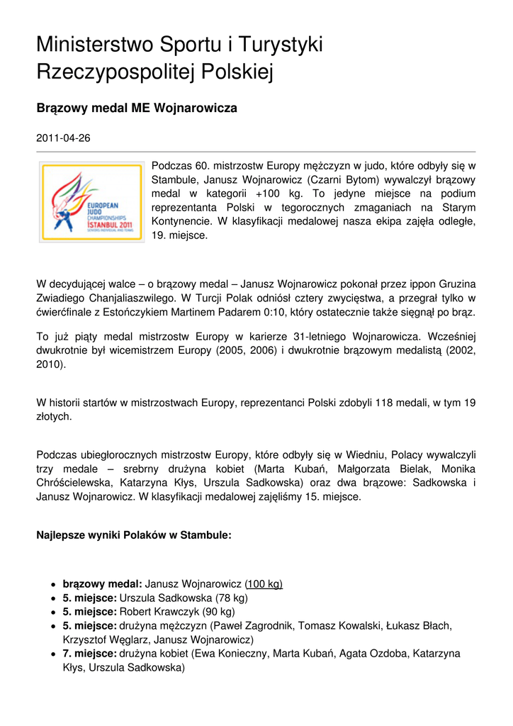 Ministerstwo Sportu i Turystyki Rzeczypospolitej Polskiej Brązowy medal ME Wojnarowicza 2011-04-26 Podczas 60. mistrzostw Europy mężczyzn w judo, które odbyły się w Stambule, Janusz Wojnarowicz (Czarni Bytom) wywalczył brązowy medal w kategorii +100 kg. To jedyne miejsce na podium reprezentanta Polski w tegorocznych zmaganiach na Starym Kontynencie. W klasyfikacji medalowej nasza ekipa zajęła odległe, 19. miejsce. W decydującej walce – o brązowy medal – Janusz Wojnarowicz pokonał przez ippon Gruzina Zwiadiego Chanjaliaszwilego. W Turcji Polak odniósł cztery zwycięstwa, a przegrał tylko w ćwierćfinale z Estończykiem Martinem Padarem 0:10, który ostatecznie także sięgnął po brąz. To już piąty medal mistrzostw Europy w karierze 31-letniego Wojnarowicza. Wcześniej dwukrotnie był wicemistrzem Europy (2005, 2006) i dwukrotnie brązowym medalistą (2002, 2010). W historii startów w mistrzostwach Europy, reprezentanci Polski zdobyli 118 medali, w tym 19 złotych. Podczas ubiegłorocznych mistrzostw Europy, które odbyły się w Wiedniu, Polacy wywalczyli trzy medale – srebrny drużyna kobiet (Marta Kubań, Małgorzata Bielak, Monika Chróścielewska, Katarzyna Kłys, Urszula Sadkowska) oraz dwa brązowe: Sadkowska i Janusz Wojnarowicz. W klasyfikacji medalowej zajęliśmy 15. miejsce. Najlepsze wyniki Polaków w Stambule: brązowy medal: Janusz Wojnarowicz (100 kg) 5. miejsce: Urszula Sadkowska (78 kg) 5. miejsce: Robert Krawczyk (90 kg) 5. miejsce: drużyna mężczyzn (Paweł Zagrodnik, Tomasz Kowalski, Łukasz Błach, Krzysztof Węglarz, Janusz Wojnarowicz) 7. miejsce: drużyna kobiet (Ewa Konieczny, Marta Kubań, Agata Ozdoba, Katarzyna Kłys, Urszula Sadkowska) Klasyfikacja medalowe 60. mistrzostw Europy mężczyzn i 37. mistrzostw Europy kobiet w judo: 1. Francja 5 złotych – 3 srebrne – 3 brązowe;RAZEM: 11 2. Ukraina 2 złote – 0 srebrnych – 1 brązowy;RAZEM: 3 3. Rosja 1 złoty – 2 srebrne – 5 brązowych; RAZEM: 8 4. Portugalia 1 złoty – 2 srebrne – 0 brązowych;RAZEM: 3 Węgry 1 złoty – 2 srebrne – 0 brązowych; RAZEM: 3 6. Azerbejdżan 1 złoty – 1 srebrny – 0 brązowych;RAZEM: 2 Holandia 1 złoty – 1 srebrny – 0 brązowych; RAZEM: 2 8. Austria 1 złoty – 0 srebrnych – 1 brązowy; RAZEM: 2 Rumunia 1 złoty – 0 srebrnych – 1 brązowy; RAZEM: 2 10. Bośnia i Hercegowina 1 złoty – 0 srebrnych – 0 brązowych;RAZEM: 1 Grecja 1 złoty – 0 srebrnych – 0 brązowych; RAZEM: 1 11. Gruzja 0 złotych – 2 srebrne – 3 brązowe; RAZEM: 5 12. Niemcy 0 złotych – 1 srebrny – 2 brązowe;RAZEM: 3 13. Hiszpania 0 złotych – 1 srebrny – 1 brązowy;RAZEM: 2 14. Mołdawia 0 złotych – 1 srebrny – 0 brązowych; RAZEM: 1 15. Słowenia 0 złotych – 0 srebrnych – 3 brązowe; RAZEM: 3 16. Turcja 0 złotych – 0 srebrnych – 2 brązowe;RAZEM: 2 W. Brytania 0 złotych – 0 srebrnych – 2 brązowe; RAZEM: 2 Włochy 0 złotych – 0 srebrnych – 2 brązowe; RAZEM: 2 19. POLSKA 0 złotych – 0 srebrnych – 1 brązowy;RAZEM: 1 Czechy 0 złotych – 0 srebrnych – 1 brązowy; RAZEM: 1 Estonia 0 złotych – 0 srebrnych – 1 brązowy; RAZEM: 1 Łotwa 0 złotych – 0 srebrnych – 1 brązowy; RAZEM: 1 Szwecja 0 złotych – 0 srebrnych – 1 brązowy; RAZEM: 1
