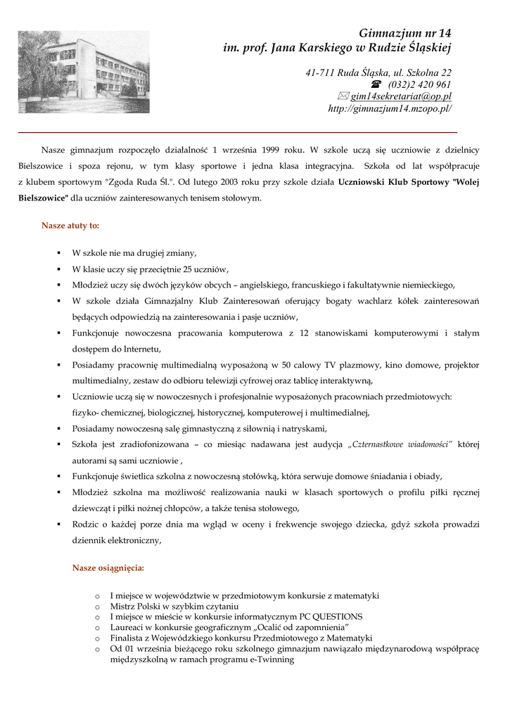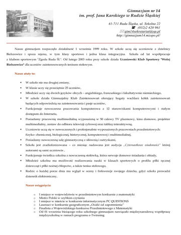 Gimnazjum nr 14 im. prof. Jana Karskiego w Rudzie Śląskiej 41-711 Ruda Śląska, ul. Szkolna 22 (032)2 420 961 [email protected] http://gimnazjum14.mzopo.pl/ Nasze gimnazjum rozpoczęło działalność 1 września 1999 roku. W szkole uczą się uczniowie z dzielnicy Bielszowice i spoza rejonu, w tym klasy sportowe i jedna klasa integracyjna. Szkoła od lat współpracuje z klubem sportowym "Zgoda Ruda Śl.". Od lutego 2003 roku przy szkole działa Uczniowski Klub Sportowy "Wolej Bielszowice" dla uczniów zainteresowanych tenisem stołowym. Nasze atuty to: W szkole nie ma drugiej zmiany, W klasie uczy się przeciętnie 25 uczniów, Młodzież uczy się dwóch języków obcych – angielskiego, francuskiego i fakultatywnie niemieckiego, W szkole działa Gimnazjalny Klub Zainteresowań oferujący bogaty wachlarz kółek zainteresowań będących odpowiedzią na zainteresowania i pasje uczniów, Funkcjonuje nowoczesna pracowania komputerowa z 12 stanowiskami komputerowymi i stałym dostępem do Internetu, Posiadamy pracownię multimedialną wyposażoną w 50 calowy TV plazmowy, kino domowe, projektor multimedialny, zestaw do odbioru telewizji cyfrowej oraz tablicę interaktywną, Uczniowie uczą się w nowoczesnych i profesjonalnie wyposażonych pracowniach przedmiotowych: fizyko- chemicznej, biologicznej, historycznej, komputerowej i multimedialnej, Posiadamy nowoczesną salę gimnastyczną z siłownią i natryskami, Szkoła jest zradiofonizowana – co miesiąc nadawana jest audycja „Czternastkowe wiadomości” której autorami są sami uczniowie , Funkcjonuje świetlica szkolna z nowoczesną stołówką, która serwuje domowe śniadania i obiady, Młodzież szkolna ma możliwość realizowania nauki w klasach sportowych o profilu piłki ręcznej dziewcząt i piłki nożnej chłopców, a także tenisa stołowego, Rodzic o każdej porze dnia ma wgląd w oceny i frekwencje swojego dziecka, gdyż szkoła prowadzi dziennik elektroniczny, Nasze osiągnięcia: o o o o o o I miejsce w województwie w przedmiotowym konkursie z matematyki Mistrz Polski w szybkim czytaniu I miejsce w mieście w konkursie informatycznym PC QUESTIONS Laureaci w konkursie geograficznym „Ocalić od zapomnienia” Finalista z Wojewódzkiego konkursu Przedmiotowego z Matematyki Od 01 września bieżącego roku szkolnego gimnazjum nawiązało międzynarodową współpracę międzyszkolną w ramach programu e-Twinning TERMIN SKŁADANIA PODAŃ DO KLAS PIERWSZYCH W ROKU SZKOLNYM 2009/2010 USTALONY JEST OD 04 MAJA 2010 R. DO 10 CZERWCA 2010 R. ...................................................................... Ruda Śląska dn. .......................... Nazwisko i imię ucznia ...................................................................... Data urodzenia ..................................................................... ..................................................................... Adres zamieszkania (kod poczt., miasto, ulica, nr domu, nr mieszkania) ...................................................................... Tel. Kontaktowy Dyrektor Gimnazjum nr 14 im. prof. Jana Karskiego w Rudzie Śląskiej ul. Szkolna 22 41-711 Ruda Śląska Proszę o przyjęcie mnie do klasy pierwszej Waszego Gimnazjum w roku szkolnym 2009/2010. Jestem absolwentem Szkoły Podstawowej nr .............. w ........................................ W okresie dotychczasowej nauki uczyłem(am) się języka angielskiego / niemieckiego / francuskiego (podkreślić właściwe). Osiągam bardzo dobre / dobre / dostateczne (wybrać właściwe) wyniki w nauce. Interesuję się ...................................................................................................................................... i chciałbym/chciałabym rozwijać te zainteresowania w gimnazjum. ............................................... podpis ucznia .............................................. podpis rodzica Do podania załączam: 1. zgłoszenie absolwenta 2. zaświadczenie o sprawdzianie 3. świadectwo ukończenia Szkoły Podstawowej 4. świadectwo zdrowia (przekazuje pielęgniarka szkolna) 5. 2 zdjęcia (aktualne, opisane z tyłu: nazwisko i imię, data urodzenia, adres)