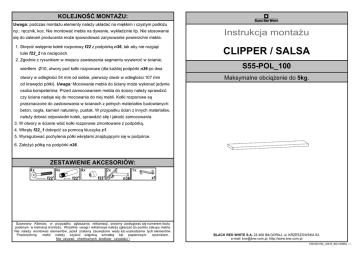 KOLEJNOÚà MONTAÝU: Uwaga: podczas monta¿u elementy nale¿y ukùadaã na miêkkim i czystym podùo¿u np.: rêcznik, koc. Nie montowaã mebla na dywanie, wykùadzinie itp. Nie stosowanie siê do zaleceñ producenta mo¿e spowodowaã zarysowanie powierzchni mebla. 1. Skrêciã wstêpnie koùek rozporowy f22 z podpórk¹ n36, tak aby nie rozgi¹ã tulei f22_2 na naciêciach. 2. Zgodnie z rysunkiem w miejscu zawieszenia segmentu wywierciã w œcianie, wiertùem n10, otwory pod koùki rozporowe (dla ka¿dej podpórki n36 po dwa otwory w odlegùoœci 54 mm od siebie, pierwszy otwór w odlegùoœci 107 mm od krawêdzi póùki). Uwaga: Mocowanie mebla do œciany mo¿e wykonaã jedynie Instrukcja monta¿u CLIPPER / SALSA S55-POL_100 Maksymalne obci¹¿enie do 5kg. osoba kompetentna. Przed zamocowaniem mebla do œciany nale¿y sprawdziã czy œciana nadaje siê do mocowania do niej mebli. Koùki rozporowe s¹ przeznaczone do zastosowania w œcianach z peùnych materiaùów budowlanych: beton, cegùa, kamieñ naturalny, pustak. W przypadku œcian z innych materiaùów, nale¿y dobraã odpowiedni koùek, sprawdziã siùê i jakoœã zamocowania. 3. W otwory w œcianie wbiã koùki rozporowe zmontowane z podpórk¹. 4. Wkrêty f22_1 dokrêciã za pomoc¹ kluczyka z1. 5. Wyregulowaã pochylenia póùki wkrêtami znajduj¹cymi siê w podpórce. 6. Zaùo¿yã póùkê na podpórki n36. ZESTAWIENIE AKCESORIÓW: 4x 4x 4x 2x 1x Szanowny Kliencie, w przypadku zgùaszania reklamacji, prosimy posùugiwaã siê numerem kodu podanym w instrukcji monta¿u. Wszelkie uwagi i reklamacje nale¿y zgùaszaã do punktu zakupu mebla. Nie nale¿y montowaã elementów, je¿eli zostan¹ zauwa¿one wady lub uszkodzenia tych elementów. mebli nale¿y czyœciã wilgotn¹ szmatk¹ lub papierowym rêcznikiem. Powierzchniê Nie u¿ywaã chemicznych œrodków czystoœci ! BLACK RED WHITE S.A. 23-400 BI£GORAJ, ul. KRZESZOWSKA 63, e-mail: [email protected], http://www.brw.com.pl P28-S55-POL_100-M_IN21-KOR01.idw .idw Symbol elementu Kod 1 S55-337 Wymiary 972 240 mm 4 5 0m 65 54 1 m mm mm 7 0 1 Regulacja póùki P28-S55-POL_100-M_IN21-KOR01.idw .idw