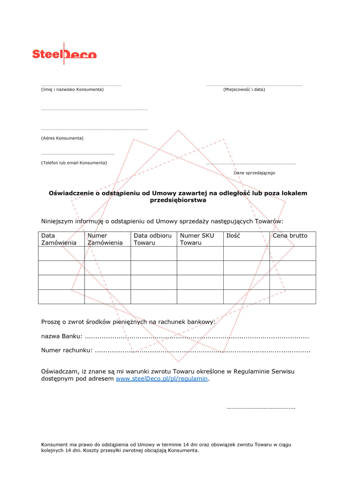 ……………………………………………………………… (Imię i nazwisko Konsumenta) …………………………………………………………………………… (Miejscowość i data) …………………………………………………………………………………… …………………………………………………………………………………… (Adres Konsumenta) ………………………………………………………… (Telefon lub email Konsumenta) ……………………………………………………………………… Dane sprzedającego Oświadczenie o odstąpieniu od Umowy zawartej na odległość lub poza lokalem przedsiębiorstwa Niniejszym informuję o odstąpieniu od Umowy sprzedaży następujących Towarów: Data Zamówienia Numer Zamówienia Data odbioru Towaru Numer SKU Towaru Ilość Cena brutto Proszę o zwrot środków pieniężnych na rachunek bankowy: nazwa Banku: .......................................................................................................... Numer rachunku: ...................................................................................................... Oświadczam, iż znane są mi warunki zwrotu Towaru określone w Regulaminie Serwisu dostępnym pod adresem www.steelDeco.pl/pl/regulamin. ……………………………………. Konsument ma prawo do odstąpienia od Umowy w terminie 14 dni oraz obowiązek zwrotu Towaru w ciągu kolejnych 14 dni. Koszty przesyłki zwrotnej obciążają Konsumenta.