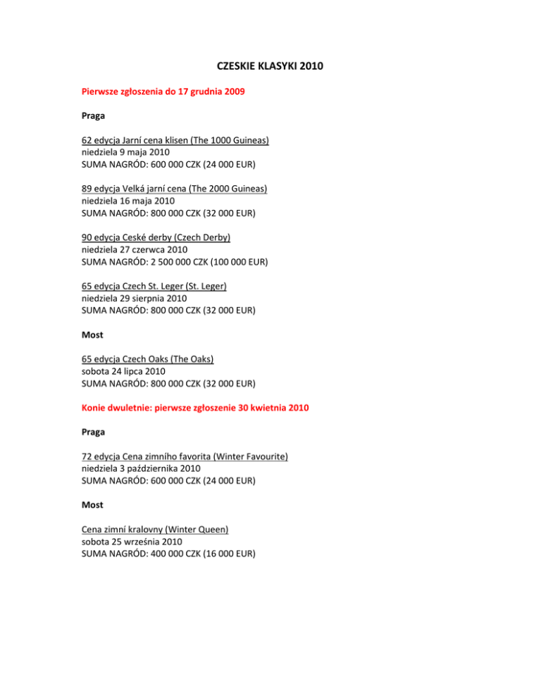 CZESKIE KLASYKI 2010 Pierwsze zgłoszenia do 17 grudnia 2009 Praga 62 edycja Jarní cena klisen (The 1000 Guineas) niedziela 9 maja 2010 SUMA NAGRÓD: 600 000 CZK (24 000 EUR) 89 edycja Velká jarní cena (The 2000 Guineas) niedziela 16 maja 2010 SUMA NAGRÓD: 800 000 CZK (32 000 EUR) 90 edycja Ceské derby (Czech Derby) niedziela 27 czerwca 2010 SUMA NAGRÓD: 2 500 000 CZK (100 000 EUR) 65 edycja Czech St. Leger (St. Leger) niedziela 29 sierpnia 2010 SUMA NAGRÓD: 800 000 CZK (32 000 EUR) Most 65 edycja Czech Oaks (The Oaks) sobota 24 lipca 2010 SUMA NAGRÓD: 800 000 CZK (32 000 EUR) Konie dwuletnie: pierwsze zgłoszenie 30 kwietnia 2010 Praga 72 edycja Cena zimního favorita (Winter Favourite) niedziela 3 października 2010 SUMA NAGRÓD: 600 000 CZK (24 000 EUR) Most Cena zimní kralovny (Winter Queen) sobota 25 września 2010 SUMA NAGRÓD: 400 000 CZK (16 000 EUR) Niedziela 9 maja 2010 - Praga 62. Jarní cena klisen (The 1000 Guineas) LISTED 1600 m 600000 CZK (240000 - 132000 - 60000 - 42000 – 56000 – 24000 - 18000) Premia 50000 CZK dla właściciela najlepszej klaczy czeskiej hodowli (do 7 miejsca). Dla 3-letnich klaczy. Waga: 58 kg. Parada przed gonitwą. Zgłoszenie I termin: czwartek 17 grudnia 2009 godz. 12.00. 300 CZK + VAT Potwierdzenie zgłoszenia: czwartek 25 lutego 2010 godz. 12.00. 1200 CZK + VAT Potwierdzenie zgłoszenia: czwartek 25 marca 2010 godz. 12.00. 3000 CZK + VAT Potwierdzenie zgłoszenia: czwartek 29 kwietnia 2010 godz. 12.00. 4500 CZK + VAT Zgłoszenie II termin: czwartek 25 lutego 2010 godz. 12.00. 3300 CZK + VAT Zgłoszenie III termin: czwartek 25 marca 2010 godz. 12.00. 13500 CZK + VAT Zgłoszenie IV termin: czwartek 29 kwietnia 2010 godz. 12.00. 36000 CZK + VAT Potwierdzenie zapisu: wtorek 4 maja 2010 godz. 10.00. 12000 CZK + VAT Zgłoszenie jeźdźców: wtorek 4 maja 2010 godz. 15.00. Niedziela 16 maja 2010 - Praga 89. Velká jarní cena (The 2000 Guineas) LISTED 1600 m 800000 CZK (320000 - 176000 - 112000 - 80000 – 56000 – 32000 - 24000) Premia 50000 CZK dla właściciela najlepszego konia czeskiej hodowli (do 7 miejsca). Dla 3-letnich koni. Wagi: ogiery i wałachy 58 kg, klacze 56,5 kg. Parada przed gonitwą. Zgłoszenie I termin: czwartek 17 grudnia 2009 godz. 12.00. 400 CZK + VAT Potwierdzenie zgłoszenia: czwartek 25 lutego 2009 godz. 12.00. 1600 CZK + VAT Potwierdzenie zgłoszenia: czwartek 25 marca 2010 godz. 12.00. 4000 CZK + VAT Potwierdzenie zgłoszenia: czwartek 6 maja 2010 godz. 12.00. 6000 CZK + VAT Zgłoszenie II termin: czwartek 25 lutego 2010 godz. 12.00. 4400 CZK + VAT Zgłoszenie III termin: czwartek 25 marca 2010 godz. 12.00. 18000 CZK + VAT Zgłoszenie IV termin: czwartek 5 maja 2010 godz. 12.00. 48000 CZK + VAT Potwierdzenie zapisu: wtorek 11 maja 2010 godz. 10.00. 16000 CZK + VAT Zgłoszenie jeźdźców: wtorek 11 maja 2010 godz. 15.00. Niedziela 27 czerwca 2010 - Praga 90. Ceské derby (Czech Derby) GRADED-3 2400 m 2500000 CZK (1000000 - 550000 - 350000 - 250000 – 175000 – 100000 - 75000) Premia 50000 CZK dla właściciela najlepszego konia czeskiej hodowli (do 7 miejsca). Dla 3-letnich koni. Wagi: ogiery i wałachy 58 kg, klacze 56,5 kg. Parada przed gonitwą. Zgłoszenie I termin: czwartek 17 grudnia 2009 godz. 12.00. 1250 CZK + VAT Potwierdzenie zgłoszenia: czwartek 25 lutego 2010 godz. 12.00. 5000 CZK + VAT Potwierdzenie zgłoszenia: czwartek 20 maja 2010 godz. 12.00. 12500 CZK + VAT Potwierdzenie zgłoszenia: czwartek 17 czerwca 2010 godz. 12.00. 18750 CZK + VAT Zgłoszenie II termin: czwartek 25 lutego 2010 godz. 12.00. 13750 CZK + VAT Zgłoszenie III termin: czwartek 20 maja 2010 godz. 12.00. 56250 CZK + VAT Zgłoszenie IV termin: czwartek 17 czerwca 2010 godz. 12.00. 150000 CZK + VAT Potwierdzenie zapisu: poniedziałek 21 czerwca 2010 godz. 10.00. 50000 CZK + VAT Zgłoszenie jeźdźców: poniedziałek 21 czerwca 2010 godz. 15.00. Sobota 24 lipca 2010 - Most Oaks LISTED 2400 m (ONE AND HALF MILE) 800000 CZK (320000 - 176000 - 112000 - 80000 –56000 – 32000 - 24000) Premia 50000 CZK dla właściciela najlepszej klaczy czeskiej hodowli (do 7 miejsca). Dla 3-letnich klaczy. Waga: 58 kg. Parada przed gonitwą. Zgłoszenie I termin: czwartek 17 grudnia 2009 godz. 12.00. 400 CZK + VAT Potwierdzenie zgłoszenia: czwartek 20 maja 2010 godz. 12.00. 1600 CZK + VAT Potwierdzenie zgłoszenia: czwartek 1 lipca 2010 godz. 12.00. 4000 CZK + VAT Potwierdzenie zgłoszenia: czwartek 15 lipca 2010 godz. 12.00. 6000 CZK + VAT Zgłoszenie II termin: czwartek 20 maja 2010 godz. 12.00. 4400 CZK + VAT Zgłoszenie III termin: czwartek 1 lipca 2010 godz. 12.00. 18000 CZK + VAT Zgłoszenie IV termin: czwartek 15 lipca 2010 godz. 12.00. 48000 CZK + VAT Potwierdzenie zapisu: wtorek 20 lipca 2010 godz. 10.00. 16000 CZK + VAT Zgłoszenie jeźdźców: wtorek 20 lipca 2010 godz. 15.00. Niedziela 29 sierpnia 2010 - Praga 65. St. Leger LISTED 2800 m (ONE MILE AND SIX FURLONGS) 800000 CZK (320000 - 176000 - 112000 - 80000 –56000 – 32000 - 24000) Premia 50000 CZK dla właściciela najlepszego konia czeskiej hodowli (do 7 miejsca). Dla 3-letnich koni. Wagi: ogiery i wałachy 58 kg, klacze 56,5 kg. Parada przed gonitwą. Zgłoszenie I termin: czwartek 17 grudnia 2009 godz. 12.00. 400 CZK + VAT Potwierdzenie zgłoszenia: czwartek 20 maja 2010 godz. 12.00. 1600 CZK + VAT Potwierdzenie zgłoszenia: czwartek 1 lipca 2010 godz. 12.00. 4000 CZK + VAT Potwierdzenie zgłoszenia: czwartek 19 sierpnia 2009 godz. 12.00. 6000 CZK + VAT Zgłoszenie II termin: czwartek 20 maja 2010 godz. 12.00. 4400 CZK + VAT Zgłoszenie III termin: czwartek 1 lipca 2010 godz. 12.00. 18000 CZK + VAT Zgłoszenie IV termin: czwartek 19 sierpnia 2010 godz. 12.00. 48000 CZK + VAT Potwierdzenie zapisu: wtorek 24 sierpnia 2010 godz. 10.00. 16000 CZK + VAT Zgłoszenie jeźdźców: wtorek 24 sierpnia 2010 godz. 15.00. Sobota 25 września 2010 - Most Cena zimní kralovny (Winter Queen) LISTED 1600 m (ONE MILE) 400000 CZK (160000 - 88000 - 56000 - 40000 –28000 – 16000 - 12000) Premi