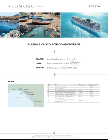OFERTA ALASKA Z VANCOUVER DO ANCHORAGE STATEK: Seven Seas Mariner LINIA: Regent Seven Seas Cruises TERMIN: 27 LIPCA 2016 – 03 SIERPNIA 2016 TRASA Dzień 1 2 3 4 5 6 7 8 Port Vancouver, Kanada dzień na morzu Ketchikan/Alska, Stany Zjednoczone Juneau/Alska, Stany Zjednoczone Skagway/Alska, Stany Zjednoczone Sitka/Alska, Stany Zjednoczone dzień na morzu Seward (Anchorage), Alska, Stany Zjednoczone Wpłynięcie 08:00 13:00 07:00 08:00 - Wypłynięcie 18:00 16:00 23:00 17:00 17:00 - 06:00 - SONRISO | Lipiński Passage | Al. Jero zo limskie 61 | 00-697 Warszawa tel. +48 22 206 45 00 | fax. +48 22 100 14 61 | e-mail: biuro @so nriso .pl | web: www.so nriso .pl OFERTA CENA Typ kabiny Cena z osobę Deluxe Suite od 4 459 EUR Concierge Suite od 5 259 EUR Penthouse Suite od 6 619 EUR CENA ZAWIERA DOTATKOWE OPŁATY zakwaterowanie w 2 - os apartamencie wybranej kategorii pełne wyżywienie: 3 posiłki, przekąski między posiłakmi, bufet o północy korzystanie z restauracji tematycznych open bar: wybrane wina i szampany, alkohole premium, różnorodne kawy i herbaty, woda butelkowana, napoje bezalkoholowe oraz soki dostępne w barach i restauracjach korzystanie z mini baru w apartamencie serwis bagażowy podczas wejścia i zejścia ze statku obsługa kamerdynerska (dostępna w apartamentach od kategorii C) 24 godzinny serwis kabinowy korzystanie z urządzeń sportowo - rekreacyjnych dostępnych na pokładzie (baseny, jacuzzi, boiska sportowe, itp.) udział we wszystkich imprezach organizowanych na pokładzie (przedstawienia, pokazy, aukcje, animacje i inne) opłatę serwisową (napiwki) dla obsługi statku obowiązkowe opłaty portowe wybrane wycieczki fakultatywne dojazd/przelot do portu rozpoczęcia i zakończenia rejsu transfery (lotnisko - port - lotnisko) ewentualne noclegi przed lub po rejsie wycieczki fakultatywne korzystanie z usług typu: SPA, salon piękności, pralnia itp. wydatki osobiste tj. zakupy w butikach, internet, kasyno itp. obowiązkowe ubezpieczenie turystyczne koszt wymaganych wiz ewentualna opłata paliwowa (linia w momencie wzrotu cen ropy zastrzega sobie prawo do dodania oplaty paliwowej do każdej rezerwacji) Na życzenie świadczymy dodatkowo usługi: rezerwacje hotelowe na całym świecie rezerwacje biletów lotniczych, trasferów oraz parkingu w porcie rezerwacje wycieczek fakultatywnych i innych atrakcji SONRISO | Lipiński Passage | Al. Jero zo limskie 61 | 00-697 Warszawa tel. +48 22 206 45 00 | fax. +48 22 100 14 61 | e-mail: biuro @so nriso .pl | web: www.so nriso .pl