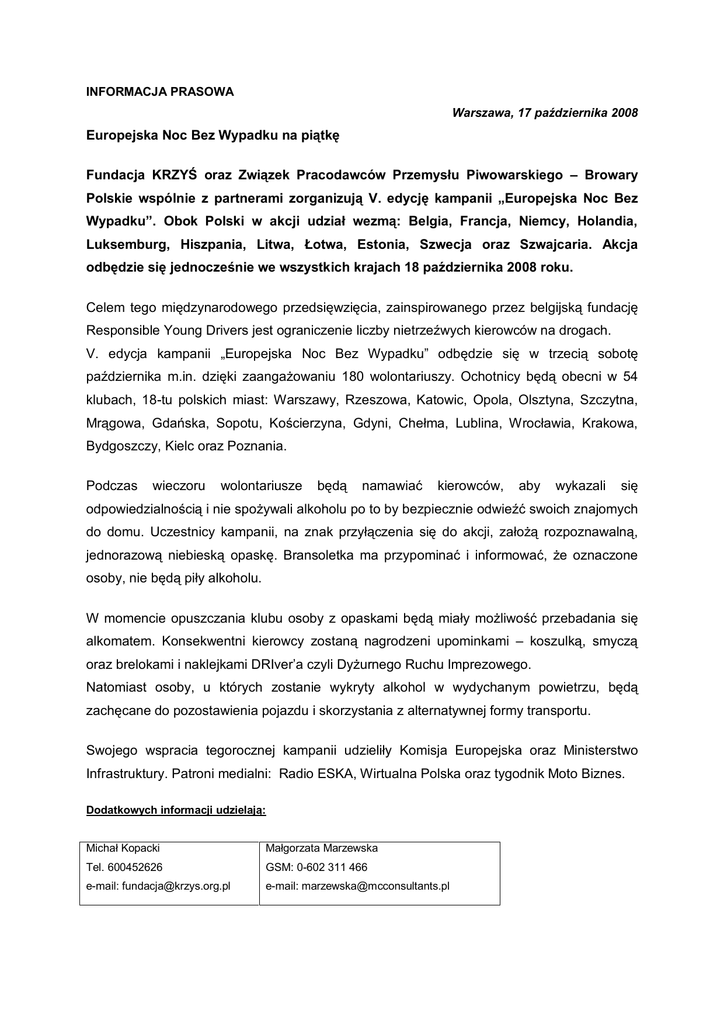 INFORMACJA PRASOWA Warszawa, 17 października 2008 Europejska Noc Bez Wypadku na piątkę Fundacja KRZYŚ oraz Związek Pracodawców Przemysłu Piwowarskiego – Browary Polskie wspólnie z partnerami zorganizują V. edycję kampanii „Europejska Noc Bez Wypadku”. Obok Polski w akcji udział wezmą: Belgia, Francja, Niemcy, Holandia, Luksemburg, Hiszpania, Litwa, Łotwa, Estonia, Szwecja oraz Szwajcaria. Akcja odbędzie się jednocześnie we wszystkich krajach 18 października 2008 roku. Celem tego międzynarodowego przedsięwzięcia, zainspirowanego przez belgijską fundację Responsible Young Drivers jest ograniczenie liczby nietrzeźwych kierowców na drogach. V. edycja kampanii „Europejska Noc Bez Wypadku” odbędzie się w trzecią sobotę października m.in. dzięki zaangażowaniu 180 wolontariuszy. Ochotnicy będą obecni w 54 klubach, 18-tu polskich miast: Warszawy, Rzeszowa, Katowic, Opola, Olsztyna, Szczytna, Mrągowa, Gdańska, Sopotu, Kościerzyna, Gdyni, Chełma, Lublina, Wrocławia, Krakowa, Bydgoszczy, Kielc oraz Poznania. Podczas wieczoru wolontariusze będą namawiać kierowców, aby wykazali się odpowiedzialnością i nie spożywali alkoholu po to by bezpiecznie odwieźć swoich znajomych do domu. Uczestnicy kampanii, na znak przyłączenia się do akcji, założą rozpoznawalną, jednorazową niebieską opaskę. Bransoletka ma przypominać i informować, że oznaczone osoby, nie będą piły alkoholu. W momencie opuszczania klubu osoby z opaskami będą miały możliwość przebadania się alkomatem. Konsekwentni kierowcy zostaną nagrodzeni upominkami – koszulką, smyczą oraz brelokami i naklejkami DRIver’a czyli Dyżurnego Ruchu Imprezowego. Natomiast osoby, u których zostanie wykryty alkohol w wydychanym powietrzu, będą zachęcane do pozostawienia pojazdu i skorzystania z alternatywnej formy transportu. Swojego wspracia tegorocznej kampanii udzieliły Komisja Europejska oraz Ministerstwo Infrastruktury. Patroni medialni: Radio ESKA, Wirtualna Polska oraz tygodnik Moto Biznes. Dodatkowych informacji udzielają: Michał Kopacki Małgorzata Marzewska Tel. 600452626 GSM: 0-602 311 466 e-mail: [email protected] e-mail: [email protected]
