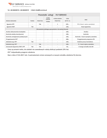 Tel. +48 696590737, +48 696500737 E-Mail: [email protected] Pozostałe usługi LICZBA GODZIN RODZAJ SZKOLENIA TEORIA PRAKTYKA Egzamin KTP - Tak Egzamin KWT Tak - FLY SERVICE LICZBA GODZIN CENA PRAKTYKA NETTO ZŁ - 1 160 ,- FI + ( koszt najmu samolotu) - - 120,- Koszt egzaminu TEORIA INNE Wznawianie jednego uprawnienia do ważnej licencji. Analiza dokumentów kandydata 100,- Analiza Kontrola wiedzy teoretycznej 100,- kontrola Kontrola umiejętności praktycznych 160,- Kontrola + koszt wynajmu samolotu Przygotowanie IPS* - - - - 580,- Przygotowanie programu IPS Szkolenie wg. IPS* Tak - - - 120,- Godzina pracy Instruktora - Tak - - 160,- FI + koszt najmu samolotu Tak Tak - - 44,- Z innego ośrodka lub LKE Szkolenie wg. IPS* Uznawanie Egzaminu KWT, KTP Ceny są cenami netto, do szkoleń nie zawodowych należy doliczyć podatek 23% Vat. IPS* indywidualny program szkolenia. Stan z dnia 17.01.2017 rok. Z zastrzeżeniem zmian cenowych w naszym ośrodku szkolenia Fly Service.