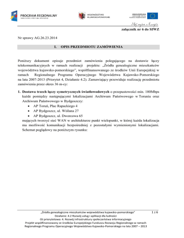 załącznik nr 6 do SIWZ Nr sprawy AG.26.23.2014 I. OPIS PRZEDMIOTU ZAMÓWIENIA Poniższy dokument opisuje przedmiot zamówienia polegającego na dostawie łączy telekomunikacyjnych w ramach realizacji projektu: „Źródła genealogiczne mieszkańców województwa kujawsko-pomorskiego”, współfinansowanego ze środków Unii Europejskiej w ramach Regionalnego Programu Operacyjnego Województwa Kujawsko-Pomorskiego na lata 2007-2013 (Priorytet 4, Działanie 4.2). Zamawiający przewiduje realizację przedmiotu zamówienia przez okres 36 m-cy: 1. Dostawa trzech łączy symetrycznych światłowodowych o przepustowości min. 100Mbps każde pomiędzy następującymi lokalizacjami Archiwum Państwowego w Toruniu oraz Archiwum Państwowego w Bydgoszczy: AP Toruń, Plac Rapackiego 4 AP Bydgoszcz, ul. Wiślana 27 AP Bydgoszcz, ul. Dworcowa 65 mających tworzyć sieć WAN w architekturze punkt wielopunkt, w której każda lokalizacja ma możliwość komunikacji bezpośredniej z pozostałymi wymienionymi lokalizacjami. Schemat poglądowy na poniższym rysunku: „Źródła genealogiczne mieszkańców województwa kujawsko-pomorskiego” Działanie: 4.2 Rozwój usług i aplikacji dla ludności Oś priorytetowa: 4. Rozwój infrastruktury społeczeństwa informacyjnego Projekt współfinansowany ze środków Europejskiego Funduszu Rozwoju Regionalnego w ramach Regionalnego Programu Operacyjnego Województwa Kujawsko-Pomorskiego na lata 2007 – 2013 1z6 1.1 Łącza powinny być zakończone w pomieszczeniach przeznaczonych do utrzymywania zasobów informatycznych archiwów Data Center interfejsem Ethernet min. 100Mbps w każdej w/w lokalizacji. 1.2 Ze względu na zakładane parametry budowanego systemu informatycznego Zamawiający zakłada dopuszczalne opóźnienie budowanej sieci WAN na poziomie maksymalnie 10ms pomiędzy lokalizacjami. 1.3 Łącza powinny tworzyć wydzieloną i separowaną strukturę bez dostępu do innych sieci, w tym sieci Internet. 1.4 Zamawiający zakłada utworzenie własnej adresacji IP w sieci WAN. 1.5 Zamawiający posiada własne urządzenia klasy UTM, w oparciu o które zapewni routing i bezpieczeństwo transmisji pomiędzy lokalizacjami. 2. Dostawa dwóch symetrycznych łączy dostępowych do Internetu o przepustowości min. 20 Mbps każde, doprowadzonych do lokalizacji AP Bydgoszcz ul. Dworcowa 65 oraz AP Toruń Plac Rapackiego 4. „Źródła genealogiczne mieszkańców województwa kujawsko-pomorskiego” Działanie: 4.2 Rozwój usług i aplikacji dla ludności Oś priorytetowa: 4. Rozwój infrastruktury społeczeństwa informacyjnego Projekt współfinansowany ze środków Europejskiego Funduszu Rozwoju Regionalnego w ramach Regionalnego Programu Operacyjnego Województwa Kujawsko-Pomorskiego na lata 2007 – 2013 2z6 2.1. Wraz z dostawą łączy internetowych Wykonawca powinien umożliwić korzystanie z min. 8 adresów IP ver. 4 publicznych w każdej lokalizacji, w której przewidziany jest dostęp do sieci Internet w celu publikacji zasobów archiwum w sieci Internet. 2.2. Wykonawca powinien na własnym serwerze DNS utrzymywać domenę Archiwum przeznaczoną do publikacji zasobów archiwalnych oraz domenę odwrotną dla przyznanych adresów IP przez cały czas trwania projektu, tj. 36 miesięcy. Wykonawca umożliwi aktualizację domeny dowolną ilość razy, w czasie maksymalnie 48h od momentu zgłoszenia takiej potrzeby w dni robocze. 3. SLA 3.1. Zamawiający wymaga, by usługa SLA świadczona była w sposób ciągły tj. przez 24 godziny na dobę, 7 dni w tygodniu przy zachowaniu stałych parametrów technicznych. 3.2. Prace konserwacyjne prowadzone przez Wykonawcę mogą odbywać się w godzinach 24:00 – 4:00, nie częściej niż raz w miesiącu kalendarzowym. Wykonawca o chęci prowadzenia prac musi zawiadomić Zamawiającego nie później niż 14 dni kalendarzowych przed planowanym terminem. 3.3. Zamawiający określa wymaganą sumaryczną miesięczną dostępność usługi SLA na poziomie 99,5%, bez wliczania planowanych prac konserwacyjnych Wykonawcy. Jako dostępność usługi rozumie się niezakłóconą możliwość obustronnej komunikacji za pomocą łącza z zachowaniem wymaganych parametrów technicznych. 3.4. Usunięcie awarii łączy WAN w dni robocze nie powinno być dłuższe niż 8 godzin od momentu zgłoszenia przez Zamawiającego. 3.5. Awaria łączy sieci WAN w dni wolne powinna być usunięta pierwszego dnia roboczego następującego po dniu wolnym – punkt 3.4. 3.6. Zamawiający wymaga, aby opóźnienie pomiędzy lokalizacjami sieci WAN nie było większe niż 10 ms. 3.7. Opóźnienie większe niż 10 ms będzie uważane za błąd w działaniu łącza WAN i jako takie powinno być naprawione w czasie nie dłuższym niż 24 h od momentu zgłoszenia przez Zamawiającego. 3.8. Usunięcie awarii łączy internetowych w dni robocze nie powinno być dłuższe niż 8 godzin od momentu zgłoszenia przez Zamawiającego. 3.9. Awaria łączy internetowych w dni wolne powinna być usunięta pierwszego dnia roboczego następującego po dniu wolnym – punkt 3.8 4. Harmonogram wdrażania usług 4.1 Poszczególne łącza muszą być uruchomione w taki sposób, by umożliwiały przetestowanie pełnej docelowej funkcjonalności budowanej sieci w nieprzekraczalnych terminach liczonych od dnia zawarcia Umowy, tj. : „Źródła genealogiczne mieszkańców województwa kujawsko-pomorskiego” Działanie: 4.2 Rozwój usług i aplikacji dla ludności Oś priorytetowa: 4. Rozwój infrastruktury społeczeństwa informacyjnego Projekt współfinansowany ze środków Europejskiego Funduszu Rozwoju Regionalnego w ramach Regionalnego Programu Operacyjnego Województwa Kujawsko-Pomorskiego na lata 2007 – 2013 3z6 • Łącza WAN – 100 Mbps między 3 lokalizacjami do 30 dni od dnia zawarcia umowy, w przypadku wystąpienia okresu przejściowego opisanego w pkt. 4.2 okres ten zwiększa się do 60 dni od dnia zawarcia umowy, • Łącza internetowe – 20 Mbps do 60 d