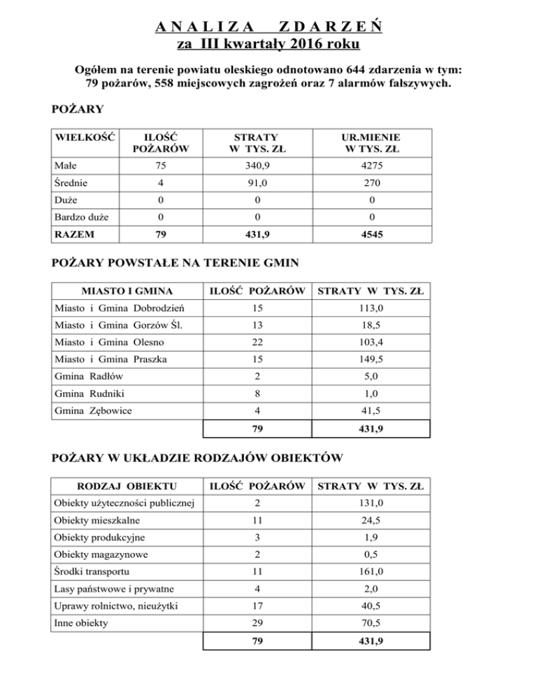 ANALIZA ZDARZEŃ za III kwartały 2016 roku Ogółem na terenie powiatu oleskiego odnotowano 644 zdarzenia w tym: 79 pożarów, 558 miejscowych zagrożeń oraz 7 alarmów fałszywych. POŻARY WIELKOŚĆ ILOŚĆ POŻARÓW STRATY W TYS. ZŁ UR.MIENIE W TYS. ZŁ Małe 75 340,9 4275 Średnie 4 91,0 270 Duże 0 0 0 Bardzo duże 0 0 0 RAZEM 79 431,9 4545 POŻARY POWSTAŁE NA TERENIE GMIN MIASTO I GMINA ILOŚĆ POŻARÓW STRATY W TYS. ZŁ Miasto i Gmina Dobrodzień 15 113,0 Miasto i Gmina Gorzów Śl. 13 18,5 Miasto i Gmina Olesno 22 103,4 Miasto i Gmina Praszka 15 149,5 Gmina Radłów 2 5,0 Gmina Rudniki 8 1,0 Gmina Zębowice 4 41,5 79 431,9 POŻARY W UKŁADZIE RODZAJÓW OBIEKTÓW RODZAJ OBIEKTU ILOŚĆ POŻARÓW STRATY W TYS. ZŁ Obiekty użyteczności publicznej 2 131,0 Obiekty mieszkalne 11 24,5 Obiekty produkcyjne 3 1,9 Obiekty magazynowe 2 0,5 Środki transportu 11 161,0 Lasy państwowe i prywatne 4 2,0 Uprawy rolnictwo, nieużytki 17 40,5 Inne obiekty 29 70,5 79 431,9 POŻARY W UKŁADZIE DZIAŁÓW GOSPODARCZYCH DZIAŁ GOSPODARCZY ILOŚĆ POŻARÓW Budynki handlowo- usługowe 1 Budynki widowiskowo-rozrywkowe i sportowe 1 Bud. jednorodzinne w tym bliźniaki, zabudowa szeregowa 8 Budynki wielorodzinne 1 Budynki mieszkalne w gospodarstwach rolnych 2 Budynki produkcyjne 1 Budynki gospodarcze ( w tym wiaty, bez garażu) 2 Magazyny 1 Samochody ciężarowe, maszyny drogowe, cysterny, przyczepy do samochodów ciężarowych 1 Samochody osobowe, przyczepy samochodów osobowych 10 Lasy – młodniki 1 Lasy - drzewostany III i powyżej klasy wieku 1 Inne powierzchnie w obszarach leśnych 2 Nieużytkowane powierzchnie rolnicze 8 Uprawy rolne oraz łąki, rżyska i pożary powstałe podczas zbiorów tych upraw 4 Maszyny rolnicze, traktory i inne środki transportu związane z rolnictwem 2 Budynki inwentarskie, hodowlane, magazynowe ( stodoły), szklarnie 3 Śmietniki wolno stojące, wysypiska śmieci 8 Kanały wentylacyjne, dymowe, dylatacje, palne elewacje lub okładziny ścian zewnętrznych 3 Garaże, warsztaty samochodowe poza budynkami w tym kompleksy garażowe 1 Garaże, warsztaty samochodowe wewnątrz budynków mieszkalnych 1 Obiekty lub grupa obiektów przyrody naturalnej np. pojedyncze drzewa 5 Trawy, trawniki na terenach nierolniczych, pobocza dróg i szlaków, ulic 11 79 PRZYCZYNY POWSTANIA POŻARÓW PRZYCZYNA POŻARU ILOŚĆ POŻARÓW Nieostrożność osób dorosłych przy posługiwaniu się otwartym ogniem, w tym papierosy, zapałki 25 Nieostrożność osób dorosłych przy wypalaniu pozostałości roślinnych na polach 1 Nieostrożność osób dorosłych przy posługiwaniu się substancjami łatwopalnymi i pirotechnicznymi 2 Nieostrożność osób dorosłych przy prowadzeniu prac pożarowoniebezpiecznych 1 Nieostrożność osób dorosłych w pozostałych przypadkach 1 Nieostrożność osób nieletnich przy posługiwaniu się otwartym ogniem, w tym papierosy, zapałki 1 Wady urządzeń i instalacji elektrycznych (przewody, osprzęt oświetlenia, odbiorniki bez urządzeń ogrzewczych) 6 Wady elektrycznych urządzeń grzewczych (piece, grzałki, kuchnie, czajniki itp.) 1 Wady urządzeń ogrzewczych na paliwo stałe 2 Nieprawidłowa eksploatacja urządzeń grzewczych na paliwo stałe 8 Nieprawidłowa eksploatacja urządzeń grzewczych na paliwo ciekłe 1 Wady urządzeń mechanicznych 1 Nieprawidłowa eksploatacja urządzeń mechanicznych 1 Wady środków transportu 8 Samozapalenia biologiczne 1 Samozapalenie chemiczne 1 Wady konstrukcji budowlanych 1 Podpalenia ( umyślne) w tym akty terroru 6 Inne przyczyny 6 Nieustalone 5 79 UDZIAŁ SIŁ I ŚRODKÓW PRZY POŻARACH PSP JRG OSP Z KSRG INNE OSP Samochody/ osoby Samochody/ osoby Samochody/ osoby 69/259 123/679 24/130 ZSP ZSR Samochody/ Samochody/ osoby osoby 0/0 0/0 INNE JEDNOSTKI Samochody/ osoby 0/0 MIEJSCOWE ZAGROŻENIA WIELKOŚĆ MZ ILOŚĆ MZ STRATY W TYS. ZŁ Małe 54 21,0 Lokalne 504 942,1 Średnie 0 0 Duże 0 0 Gigantyczne lub klęski żyw. 0 0 558 963,1 RAZEM MIEJSCOWE ZAGROŻENIA W UKŁADZIE RODZAJÓW OBIEKTÓW RODZAJ OBIEKTU ILOŚĆ MIEJSCOWYCH ZAGROŻEŃ STRATY W TYS. ZŁ. Obiekty użyteczności publicznej 35 0,2 Obiekty mieszkalne 143 57,1 Obiekty produkcyjne 13 0 Obiekty magazynowe 4 5,0 Środki transportu 88 828,3 Lasy państwowe i prywatne 9 0 Uprawy rolnictwo 27 51,0 Inne obiekty 239 21,5 558 963,1 MIEJSCOWE ZAGROŻENIA POWSTAŁE NA TERENIE GMIN MIASTO I GMINA ILOŚĆ MIEJSCOWYCH ZAGROŻEŃ STRATY W TYS. ZŁ. Miasto i Gmina Dobrodzień 104 231,7 Miasto i Gmina Gorzów Śl. 67 68,5 Miasto i Gmina Olesno 163 315,8 Miasto i Gmina Praszka 88 103,6 Gmina Radłów 36 14,5 Gmina Rudniki 48 198,0 Gmina Zębowice 52 31,0 558 963,1 MIEJSCOWE ZAGROŻENIA W UKŁADZIE DZIAŁÓW GOSPODARCZYCH DZIAŁ GOSPODARCZY ILOŚĆ MZ Bud. admin.-biurowe, banki 7 Budynki oświaty i nauki 3 Budynki służby zdrowia 6 Budynki handlowo- usługowe 6 Budynki widowiskowo-rozrywkowe i sportowe 4 Budynki kultu religijnego i sakralne 7 Inne obiekty użyteczności publicznej 2 Internaty, domy studenckie 1 Domy emerytów 1 Domy wczasowe, pensjonaty 92 Bud. jednorodzinne w tym bliźniaki, zabudowa szeregowa 35 Budynki wielorodzinne 11 Budynki mieszkalne w gospodarstwach rolnych 3 Inne obiekty mieszkalne (altanki, barakowozy itp.) 2 Budynki produkcyjne 10 Budynki gospodarcze ( w tym wiaty, bez garażu) 1 Magazyny 3 Zbiorniki składowe stałe 1 Samochody ciężarowe, maszyny drogowe, cysterny, przyczepy do samochodów ciężarowych 16 Samochody osobowe, przyczepy samochodów osobowych 66 Kolejowe 1 Lasy - uprawy leśne 1 Lasy - drzewostany II klasy wieku 1 Lasy - drzewostany III i powyżej klasy wieku 3 Inne powierzchnie w obszarach leśnych 2 Powierzchnie zalesione na obszarach nieleśnych np. parki, lasy miejskie 2 Uprawy rolne oraz łąki, rżyska i pożary powstałe podczas zbiorów tych upraw 1 Maszyny rolnicze, traktory i inne środki transportu związane z rolnictwem 2 Budynki inwentarskie, hodowlane, magazynowe ( stodoły), szklarnie 5 Budynki gospodarcze ( szo