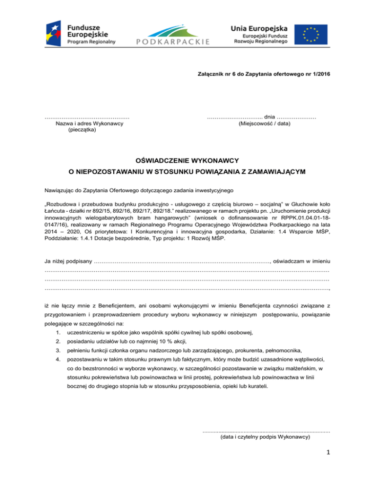 Załącznik nr 6 do Zapytania ofertowego nr 1/2016 ……………………………………… Nazwa i adres Wykonawcy (pieczątka) ………….…………….. dnia ………………… (Miejscowość / data) OŚWIADCZENIE WYKONAWCY O NIEPOZOSTAWANIU W STOSUNKU POWIĄZANIA Z ZAMAWIAJĄCYM Nawiązując do Zapytania Ofertowego dotyczącego zadania inwestycyjnego „Rozbudowa i przebudowa budynku produkcyjno - usługowego z częścią biurowo – socjalną” w Głuchowie koło Łańcuta - działki nr 892/15, 892/16, 892/17, 892/18.” realizowanego w ramach projektu pn. „Uruchomienie produkcji innowacyjnych wielogabarytowych bram hangarowych” (wniosek o dofinansowanie nr RPPK.01.04.01-180147/16), realizowany w ramach Regionalnego Programu Operacyjnego Województwa Podkarpackiego na lata 2014 – 2020, Oś priorytetowa: I Konkurencyjna i innowacyjna gospodarka, Działanie: 1.4 Wsparcie MŚP, Poddziałanie: 1.4.1 Dotacje bezpośrednie, Typ projektu: 1 Rozwój MŚP. Ja niżej podpisany …………………………………………………………………………………, oświadczam w imieniu ……………………………………………………………………………….…………………………………………………… …………………………………………………………………………………………………………………….……………… ……………………………………………………………….…………….…………………………………………..…………, iż nie łączy mnie z Beneficjentem, ani osobami wykonującymi w imieniu Beneficjenta czynności związane z przygotowaniem i przeprowadzeniem procedury wyboru wykonawcy w niniejszym postępowaniu, powiązanie polegające w szczególności na: 1. uczestniczeniu w spółce jako wspólnik spółki cywilnej lub spółki osobowej, 2. posiadaniu udziałów lub co najmniej 10 % akcji, 3. pełnieniu funkcji członka organu nadzorczego lub zarządzającego, prokurenta, pełnomocnika, 4. pozostawaniu w takim stosunku prawnym lub faktycznym, który może budzić uzasadnione wątpliwości, co do bezstronności w wyborze wykonawcy, w szczególności pozostawanie w związku małżeńskim, w stosunku pokrewieństwa lub powinowactwa w linii prostej, pokrewieństwa lub powinowactwa w linii bocznej do drugiego stopnia lub w stosunku przysposobienia, opieki lub kurateli. ................................................................................. (data i czytelny podpis Wykonawcy) 1