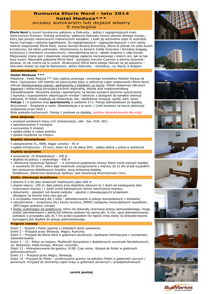 Rumunia Eforie Nord - lato 2014 hotel Meduza*** wczasy autokarem lub dojazd własny 9 noclegów Eforie Nord to kurort turystyczny położony w Dobrudży - jednej z najpiękniejszych krain historycznych Rumunii. Granicę zachodnią i północną Dobrudży tworzy odcinek dolnego Dunaju, który jest pocięty niezliczonymi malowniczymi kanałami, z kolei jej wschodnia część to wybrzeże Morza Czarnego z wieloma kąpieliskami. Do najpiękniejszych i najpopularniejszych z nich należy właśnie miejscowość Eforie Nord, zwana również Riwierą Rumuńską. Eforie to jednak nie tylko kurort turystyczny, ale także uzdrowisko, zlokalizowane tu bowiem źródła mineralne i termalne ściągają kuracjuszy z chorobami reumatycznymi, niewydolnością serca i układu krążenia z całej Europy. Miejscowość znana jest z doskonale rozwiniętego zaplecza rozrywkowego i niskich cen, jak na tak duży kurort. Niezwykłe położenie Eforie Nord - pomiędzy morzem Czarnym a dwoma jeziorami sprawia, że nie można się tu nudzić. Atrakcyjność Eforie Nord polega również na jej położeniu – nietrudno dostać się stąd do Bukaresztu, stolicy Dobrudży – Konstanty, czy Warny w Bułgarii. Zakwaterowanie Hotel Meduza *** Położenie : Hotel Meduza *** jest częścią uznanego i cenionego kompleksu Hotelier Steaua de Mare. Usytuowany 100 metrów od piaszczystej plaży w północnej części miejscowości Eforie Nord, oferuje klimatyzowane pokoje i apartamenty z widokiem na morze. Obiekt dysponuje odkrytym basenem i restauracją serwującą kuchnie regionalną, włoską oraz międzynarodową. Zakwaterowanie. Wszystkie pokoje i apartamenty na bardzo wysokim poziomie wykończenia, z łazienką i wyposażeniem obejmującym minibar i telewizor z dostępem do kanałów telewizji kablowej. W hotelu znajdują się restauracja, bar, całodobowa recepcja, ogród/ park, taras. Pokoje 2 i 3 osobowe oraz apartamenty w systemie 2+2. Pokoje jednoosobowe za dopłatą. Wyżywienie : Śniadanie w cenie. Obiadokolacje a la carte. ( Limit kwotowy na karcie płatniczej wydawanej przez hotel ) Brak aneksów kuchennych. Pokoje 1 osobowe za dopłatą, możliwe dokwaterowanie dla singli. Cena obejmuje • • • • • przejazd autokarem klasy LUX (klimatyzacja, cafe - bar, DVD, WC) zakwaterowanie 9 noclegów wyżywienie 9 śniadań opieka pilota w czasie podróży opieka rezydenta na miejscu Dopłaty obowiązkowe • ubezpieczenie KL, NNW, bagaż (utrata) - 45 zł • opłata klimatyczna - 10 euro, dzieci do 12 lat płacą 50% - opłata płatna u pilota w autokarze Dopłaty opcjonalne • wyżywienie: (9 obiadokolacji) – 350 zł • dopłata do pokoju 1-osobowego - 450 zł • „Słoneczna Gwarancja Spokoju” – w momencie podpisania umowy Klient może wykupić dopłatę w wysokości 50 zł/os., która daje możliwość zrezygnowania z imprezy do 21 dni przed wyjazdem bez ponoszenia dodatkowych kosztów, poza wniesioną dopłatą. Dodatkowo „Słoneczna Gwarancja Spokoju” jest Gwarancją Niezmienności Ceny. Zniżki, informacje dodatkowe • dziecko 0-2 lat (bez świadczeń hotelowych) płaci 400 zł • dojazd własny -150 zł; daty pobytu przy dojeździe własnym to 1 dzień od katalogowej daty rozpoczęcia imprezy i 1 dzień przed katalogowym dniem zakończenia imprezy, • dokumenty - paszport lub dowód osobisty - zgodnie z obowiązującymi przepisami (dostępne na stronie www.msz.gov.pl) • w przypadku rezerwacji dla 3 osób - zakwaterowanie w pokoju dwuosobowym z dostawką • ubezpieczenie – oznaczenia [KL] koszty leczenia, [NNW] następstw nieszczęśliwych wypadków, [BP] bagaż podróżny (utrata) • Osoby wybierające się pojedynczo, które nie dokonały rezerwacji pokoju jednoosobowego, mogą zostać zakwaterowane z jedną lub kilkoma osobami tej samej płci, w tzw. opcji dokwaterowania, jednakże w przypadku gdy do 7 dni przed wyjazdem nie będzie innej osoby na dokwaterowanie wymagana jest dopłata do pokoju jednoosobowego. Program ramowy Dzień 1 - Wyjazd z Polski zgodnie z rozkładem jazdy autokarów. Dzień 2 – Przejazd przez Słowację, Węgry, Rumunię. Dzień 3 – Przyjazd do Eforie Nord w godzinach porannych. Spotkanie informacyjne z rezydentem. Zakwaterowanie. Dzień 3 – 12 - Pobyt na miejscu. Możliwość korzystania z dodatkowych wycieczek fakultatywnych, np. Bukareszt, Delta Dunaju, Wieczór rumuński. Dzień 12 - Wykwaterowanie do godziny 10.00. Czas wolny. Wyjazd do Polski w godzinach późnowieczornych. Dzień 13 – Przejazd przez Węgry, Słowację. Dzień 14 - Przyjazd do Polski – przekroczenie granicy na południu Polski w godzinach nocnych / porannych. Przyjazd do centralnej części kraju w godzinach porannych / przedpołudniowych. cennik poniżej Turnusy i ceny dostępność miejsc i ceny zawsze na potwierdzenie ! turnusy 9 noclegów 2014-06-03 2014-06-12 2014-06-21 2014-06-30 2014-07-09 2014-07-18 2014-07-27 2014-08-05 2014-08-14 2014-08-23 2014-09-01 2014-09-10 2014-09-19 2014-09-28 2014-10-07 - 2014-06-16 2014-06-25 2014-07-04 2014-07-13 2014-07-22 2014-07-31 2014-08-09 2014-08-18 2014-08-27 2014-09-05 2014-09-14 2014-09-23 2014-10-02 2014-10-11 2014-10-20 ceny katalogowe za 1 osobę: 1297 1397 1397 1497 1627 1627 1627 1627 1627 1497 1497 1297 1297 1297 1297 Informacje transportowe wczasy Eforie Nord Miasto Skarżysko-Kamienna* Piotrków Tryb. Opole Częstochowa Kraków Gliwice Katowice Tychy Pszczyna Czechowice-Dziedzice Bielsko-Biała Cieszyn Gdynia* Szczecin* Koszalin* Gdańsk* Szczecinek* Gorzów Wlkp. Tczew* Starograd Gdański* Piła* Grudziądz* Lublin* Świecie* Zielona Góra* Poznań Bydgoszcz* Nowa Sól* Września* Polkowice* Toruń* Lubin Kłodzko Leszno Warszawa Legnica* Rawicz Włocławek* Radom* Wrocław Łódź Kielce* Adres Dworzec PKP Stacja Statoil koło McDonald`s na trasie Łódź - Katowice Stacja Orlen, ul. Wrocławska w okolicy C.H. Karolinka Stacja BP koło McDonalds na trasie Łódź - Katowice Plac Matejki przy barze Glonojad stacja Shell
