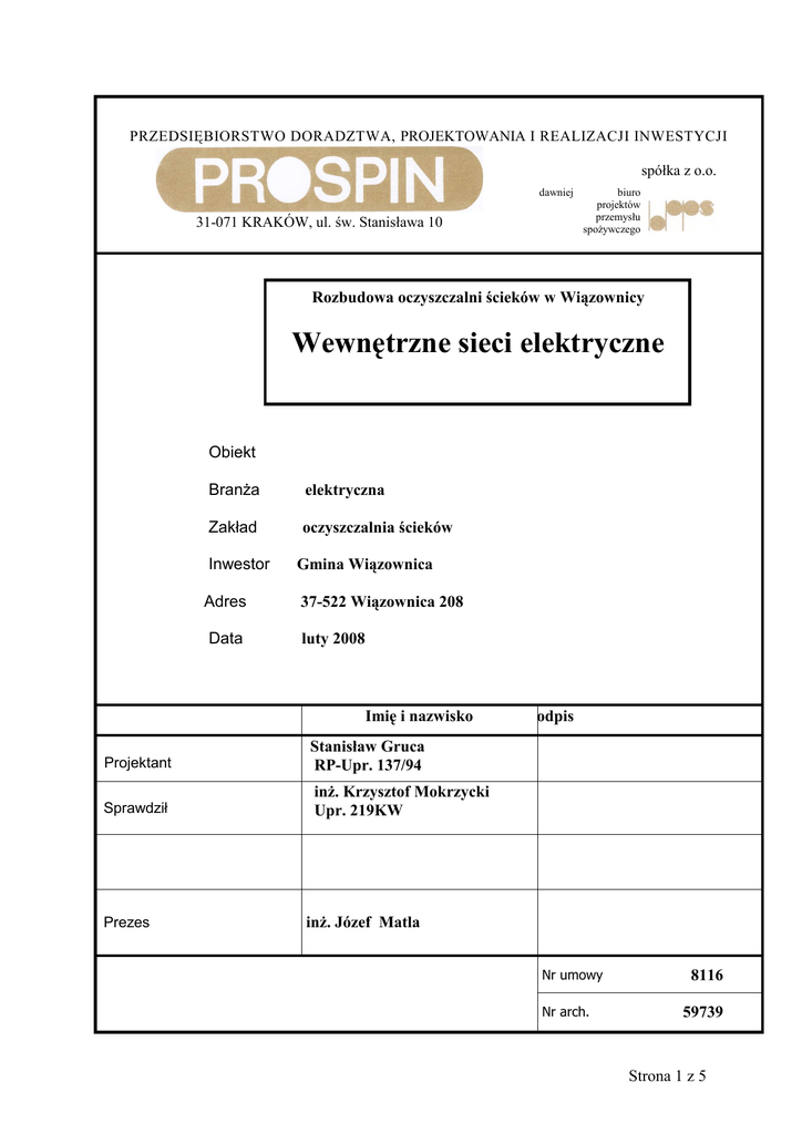 PRZEDSIĘBIORSTWO DORADZTWA, PROJEKTOWANIA I REALIZACJI INWESTYCJI spółka z o.o. dawniej 31-071 KRAKÓW, ul. św. Stanisława 10 biuro projektów przemysłu spoŜywczego Rozbudowa oczyszczalni ścieków w Wiązownicy Wewnętrzne sieci elektryczne Obiekt BranŜa elektryczna Zakład oczyszczalnia ścieków Inwestor Gmina Wiązownica Adres 37-522 Wiązownica 208 Data luty 2008 Imię i nazwisko Po Projektant Stanisław Gruca RP-Upr. 137/94 Sprawdził inŜ. Krzysztof Mokrzycki Upr. 219KW Prezes Podpis inŜ. Józef Matla Nr umowy Nr arch. 8116 59739 Strona 1 z 5 SPIS ZAWARTOŚCI PROJEKTU Nr umowy: Nazwa inwestycji: 8116 Strona: Faza: Rozbudowa oczyszczalni ścieków w Wiązownicy PB 1 Format Uwagi Wewnętrzne sieci elektryczne BranŜa: elektryczna Lp. I. II - Wyszczególnienie Opis techniczny Załączniki Rysunki Plan zagospodarowania Schemat ideowy zasilania rozdzielnicy R Schemat kanalizacji Numer rysunku Nr rys. adaptow. 59739 - 1 59739 - 2 59739 - 3 Nr arch. 59739 Strona 2 z 5 Opis techniczny 1. Podstawa opracowania - Umowa zawarta z Inwestorem Zagospodarowanie terenu w skali 1:500 Wytyczne technologiczne Normy i przepisy 2. Przedmiot opracowania Przedmiotem niniejszego opracowania jest Projekt wewnętrznych sieci elektrycznych kablowych niskiego Napięcia, oraz wykonania kanalizacji kablowej z rur PVCø110 dla oczyszczalni ścieków w. Wiązownicy. 3. Zakres opracowania W zakres niniejszego opracowania wchodzi: - Wykonanie kanalizacji kablowej z rur PVCø110 oraz studni kablowych szczelnych typu ROMOLD - UłoŜenie kabli – zakres projektowania PROSPIN - Zasilanie istniejącego oświetlenia terenu - Wykonanie skrzynek do wprowadzenia rur kanalizacji kablowej 4. System dodatkowej ochrony przeciwporaŜeniowej Jako system dodatkowej ochrony przeciwporaŜeniowej naleŜy wykonać przez szybkie samoczynne wyłączenie zasilania. Układ zasilania TN-C Układ sieci kablowych TN-S Układ oświetlenia terenu TN-S 5. Kanalizacja kablowa Zgodnie z ustaleniami technologa projektuje się kanalizację kablową dla prowadzenia w niej kabli zasilających obiekty, oraz kabli siły i sterowania. W związku z zapotrzebowaniem na wolne otwory dla strony technologicznej oraz ułoŜenia kabli zasilających obiekt, zaprojektowano kanalizację kablową w oparciu o typowe studnie typu ROMOLD oraz studnię indywidualną (SK10) według projektu konstrukcyjnego. Pomiędzy studniami naleŜy zastosować rury PVC ø110 i rury SRS-AROT ø110 pod drogami. Rury w terenie zakończyć skrzynkami z tworzywa termoutwardzalnego o JP43 ustawionymi na fundamentach betonowych. 6. Wciąganie kabli do kanalizacji W niniejszym projekcie ujęto tylko kable zasilające obiekty według schematu głównego. W oddzielnych rurach prowadzić kable zasilające, a w oddzielnych sterownicze. W studniach kablowych, na kable naleŜy nakładać trwałe oznaczniki kablowe. Oznaczniki kablowe powinny zawierać opisy: - Symbol kabla - Typy i przekrój kabla - Relacja skąd – dokąd - Rok ułoŜenia Strona 3 z 5 Do wolnych otworów będą wciągane kable siły i sterowania oraz AKP, które po ich ułoŜeniu będą musiały być naniesione na dokumentację powykonawczą sporządzoną przez wykonawcę. Kable wciągane przez wykonawcę technologii muszą być oznakowane jak kable zasilające obiekty. 7. Oświetlenie terenu Oświetlenie zewnętrzne pozostaje bez zmian. W niniejszym projekcie ujęto układ sterowania oświetleniem zainstalowany w nowej rozdzielni istniejącej stacji transformatorowej. 8. Obliczenia Wewnętrzne linie zasilające obw.13 Zasilanie budynku technicznegoI • • • Moc obliczeniowa Prąd obliczeniowy Długość Po = 3 kW Io = 4,3 A l = 40 m Dobrano kabel YKY 5x16mm2 Długotrwała obciąŜalność Id = 82 A Zabezpieczenie In = 20A Spadek napięcia ∆U = 0,1% obw.14 Zasilanie budynku technicznegoII • Moc obliczeniowa • • Po = 12 kW Prąd obliczeniowy Io = 17,3 A Długość l = 50 m Dobrano kabel YKY 5x16mm2 Długotrwała obciąŜalność Id = 82 A Zabezpieczenie In = 25A Spadek napięcia ∆U = 0,4% obw.16 Zasilanie szafy technologii RM • • • Moc obliczeniowa Po = 98 kW Prąd obliczeniowy Io = 152 A Długość l=5m Dobrano kabel YKY 5x70mm2 Długotrwała obciąŜalność Id = 211 A Zabezpieczenie In = 160A Spadek napięcia ∆U = 0,1% Strona 4 z 5 Rozbudowa oczyszczalni ścieków w Wiązownicy – wewnętrzne sieci elektryczne Nr arch. 59739 ZESTAWIENIE MATERIAŁÓW L.p . Nazwa materiałów Jedn. Ilość Uwagi miar y 1 2 3 4 5 I. Kanalizacja kablowa wg rys. nr 1 i 3 - Studnia kablowa typu KS100.63/90 ROMOLD – rozgałęźna (SK2) kpl. 1 Właz szczelny – LDB 63BDR Dystrybutor L&L P.H.U – Eksport – Import s.c. 43-600 Jaworzno, ul. Szczakowska 35 - Studnia kablowa typu KS100.63/90 ROMOLD – naroŜna (SK3) kpl. 1 Właz szczelny – LDB 63BDR - Studnia betonowa istniejąca (SK1) szt. 1 - Konstrukcje wsporcze w studniach betonowych - przewiduje się kpl. 2 6 kpl. na jedną studnię - prowadnica PWS500-BAKS - 2 x wysięgnik WWT400-BAKS (w studniach SK2, SK3) - Uzupełniające konstrukcje wsporcze w studniach w miarę potrzeb kg 20 - Skrzynka do wprowadzenia rur z tworzywa termoutwardzalnego szt. 1 JP-43 Skrzynka o wym. 400x400x150 - Rury do kanalizacji PVCø110 m 165 - Rury do kanalizacji SRS ø110 (pod drogami) m 60 - Długość trasy wykopu o szer. 1000 i gł. 1000 m 38 - Długość trasy wykopu o szer. 400 i gł. 800 m 19 - Pianka poliuretanowa do uszczelniania rur w budynkach kg 15 i studzienkach kablowych - Piasek nienormowany m3 18 II Kable niskiego napięcia wg rys. 1,2 i 3 - Kabel typu YKY 5x16mm2 (dwa odcinki do RI i RII) m 90 Strona 5 z 5