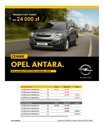 PROMOCYJNY RABAT DO 24 000 zł CENNIK OPEL ANTARA. Rok produkcji 2013 / Rok modelowy 2013. Ceny promocyjne* Active Enjoy Plus Cosmo 2.2 CDTI Ecotec (163 KM) 2x4 M6 85 900 96 700 – 2.2 CDTI Ecotec (163 KM) 4x4 M6 – 101 000 – 2.2 CDTI Ecotec (184 KM) 4x4 M6 – 104 000 114 900 2.2 CDTI Ecotec (184 KM) 4x4 A6 – – 118 700 Active Enjoy Plus Cosmo * Promocja dotyczy samochodów z roku modelowego 2013. Liczba modeli w promocji ograniczona. Ceny katalogowe 2.2 CDTI Ecotec (163 KM) 2x4 M6 109 900 120 700 – 2.2 CDTI Ecotec (163 KM) 4x4 M6 – 125 000 – 2.2 CDTI Ecotec (184 KM) 4x4 M6 – 128 000 138 900 2.2 CDTI Ecotec (184 KM) 4x4 A6 – – 142 700 Oferta specjalna przygotowana przez General Motors Poland oraz Dystrybutorów Opla. www.opel.pl Cennik nr 04/2013 z dnia 2 stycznia 2014, GMPL Wyposaż enie standardowe Active Tapicerka, tkanina, czarna. Wewnętrzne elementy ozdobne. Układ stabilizacji toru jazdy ESP® Przednie, boczne i kurtynowe poduszki powietrzne kierowcy i pasażera Klimatyzacja sterowana manualnie Radioodtwarzacz CD 40 MP3 USB Przyciski sterowania na kierownicy Portal telefonu komórkowego Bluetooth® Zdalnie sterowany zamek centralny Elektrycznie sterowane szyby przednie i tylne Elektrycznie sterowane i podgrzewane lusterka zewnętrzne Reflektory przeciwmgielne Alarm Obręcze kół ze stopów lekkich 17”, z oponami 235/65 R17 Relingi dachowe srebrne Fotel kierowcy z regulacją wysokości Uchwyty na napoje z przodu i z tyłu oraz szuflada pod fotelem kierowcy Tylna kanapa dzielona w proporcji 60:40 Kolumna kierownicy regulowana w pionie i poziomie Mocowania ISOFIX na tylnej kanapie TAEX F45/F86 AY0 C60 2GB W1Y UPF ATG A31 DL6 T3U UTJ RSB V3E SVC+D63 N37 T2Y Tapicerka, tkanina/skóra ekologiczna, czarna lub beżowa. System stabilizacji przyczepy (funkcjonalność u kładu stabilizacji toru jazdy ESP®) Klimatyzacja dwustrefowa sterowana elektronicznie Automatyczny obieg zamknięty z kontrolą jakości powietrza Podgrzewane fotele przednie Kierownica trójramienna pokryta skórą Przyciemniane szyby boczne tylne oraz szyba drzwi baga żnika Automatyczne włączanie świateł mijania TAEY/TAEZ Tapicerka, skóra ekologiczna, czarna, szara lub brązowa. Zawiera: regulowany elektrycznie fotel kierowcy. Komputer pokładowy Tempomat Czujniki parkowania, przód i tył Czujnik deszczu Obręcze kół ze stopów lekkich 18”, z oponami 235/55 R18 Przednia szyba odbijająca promieniowanie słoneczne Klamki chromowane Chromowane końcówka rury wydechowej TAFH/TAFi/ F86 CJ2 KDo C37+C38 N34 AKo T83 TAFK UF9 K34 UFR CE1 RSX AKX E20 NBR Wyposaż enie dodatkowe S S S S S S S S S S S S S S S S S S S – S S – S S S S S S S S S S S S S S S – S S – S S S S S S S S – S S S S S S – – – – – – – – S S S S S S S S – S S S S S S S – 4 900 S – – – – – – – – P P P – 1 000/P – – – S S S S S S S S Active NADWOZIE Lakier metaliczny/perłowy Światła do jazdy dziennej Reflektory ksenonowe ze spryskiwaczami Okno dachowe sterowane elektrycznie. Zawiera: schowek na okulary. Bagażnik FlexFix (wymaga dodatkowej tablicy rejestracyjnej) Hak holowniczy – składany Aluminiowe belki dachowe (do systemów transportu bagażu na dachu pojazdu) Zapasowe koło dojazdowe, z oponą155/90 R16 WNĘ TRZE Tapicerka, skóra ekologiczna, bordowa. Wewnętrzne elementy ozdobne bodo. Zawiera: podświetlane listwy progowe oraz spojler dachowy. Radioodtwarzacz CD/MP3 z nawigacją „Touch&Connect”. Zawiera: wyświetlacz dotykowy. Siatka zabezpieczająca bagażnika Enjoy Plus Cosmo Enjoy Plus Cosmo RVZ 2 800 – – – – 3 000 500 200 2 800 100 4 000 3 400 7 000 3 000 500 200 2 800 100 P 3 400 7 000 3 000 500 200 TALC – – 2 500 UFY AWW – 200 3 900 200 3 000 200 oBZ – 3 500 – oIV – – 3900 oLV – – 3 200 T3X T4F CF5 XZRV XZRX XZRY PAKIETY WYPOSA Ż ENIA DODATKOWEGO Pakiet Enjoy Komfort Czujniki parkowania, przód/tył. Komputer pokładowy. Tempomat. Obręcze kół ze stopów lekkich 18”. Pakiet Cosmo Komfort Reflektory ksenonowe ze spryskiwaczami. Czujnik ciśnienia w oponach. Elektrycznie składane lusterka zewnętrzne. Lusterko wewnętrzne elektrochromatyczne. Składany przedni fotel pasażera. Obręcze kół ze stopów lekkich 19”. Pakiet Cosmo Komfort 2 Reflektory ksenonowe ze spryskiwaczami. Czujnik ciśnienia w oponach. Elektrycznie składane lusterka zewnętrzne. Lusterko wewnętrzne elektrochromatyczne. Składany przedni fotel pasażera. S – wyposażenie standardowe wersji P – opcja wyposażenia dostępna w pakietach lub w ramach innych elementów wyposażenia Cennik Opla Antary, rok produkcji 2013, rok modelowy 2013, nr 04/2013 z dnia 2 stycznia 2014 1/2 Dane techniczne silników Typ silnika Skrzynie biegów 2.2 CDTI Ecotec 2x4 2.2 CDTI Ecotec 4x4 2.2 CDTI Ecotec 4x4 turbodiesel turbodiesel turbodiesel 6-biegowa manualna 6-biegowa manualna 6-biegowa manualna / 6-biegowa automatyczna Pojemność skokowa, cm3 2 231 2 231 2 231 Moc maksymalna, kW/KM przy obr./min 120 / 163 przy 3 800 120 / 163 przy 3 800 135 / 184 przy 3 800 Maks. moment obrotowy, Nm przy obr./min 350 przy 2 000 350 przy 2 000 400 przy 1 750 – 2 750 Prędkość maksymalna, km/h 189 188 200 / 191 Przyspieszenie 0-100 km/h, s 10,4 11,0 9,7 / 11,0 Zużycie paliwa, cykl mieszany, l/100 km* 6,1 6,4 6,4 / 8,0 Emisja CO2, cykl mieszany, g/km* 160 170 170 / 211 Norma emisji spalin Euro 5 Euro 5 Euro 5 * zgodnie z normą 2007/715/EC Wymiary, masy, pojemności Nadwozie Długość całkowita: 4 596 mm Wysokość całkowita bez/z relingami: 1 717/1 761 mm Szerokość ze złożonymi/rozłożonymi lusterkami: 1 850/2 085 mm Rozstaw osi: 2 707 mm Rozstaw kół przód/tył: 1 569/1 576 mm Bagażnik (wg ECIE) Pojemność bagażnika: 420 litrów Pojemność po złożeniu siedzeń tylnych do wysokości górnej krawędzi oparć przednich siedzeń: 865 litrów Pojemność po złożeniu siedzeń tylnych do linii dachu: 1 420 litrów Długość podłogi bez składania siedzeń tylnych: 9