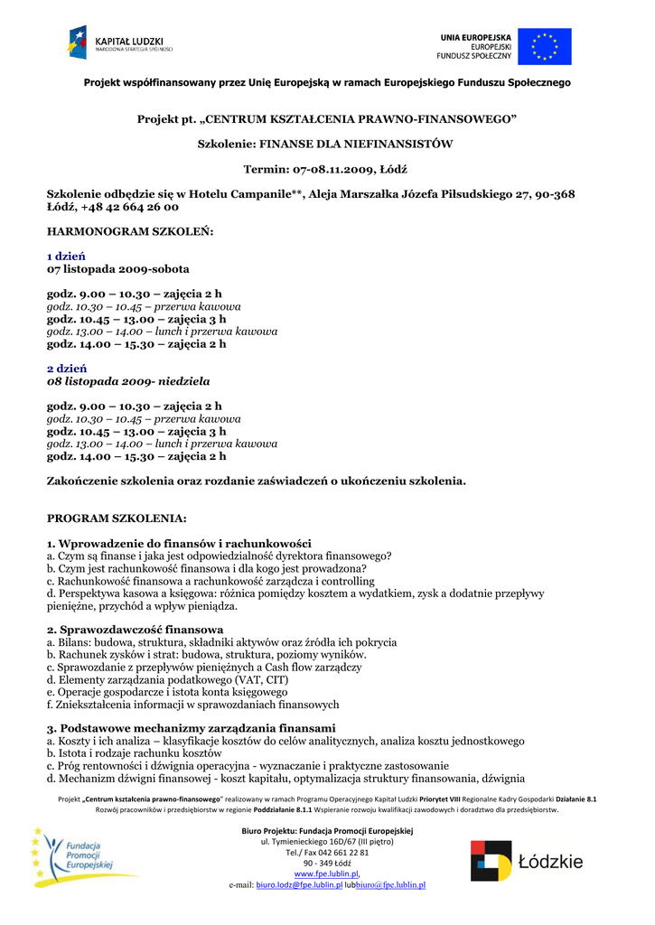 Projekt współfinansowany przez Unię Europejską w ramach Europejskiego Funduszu Społecznego Projekt pt. „CENTRUM KSZTAŁCENIA PRAWNO-FINANSOWEGO” Szkolenie: FINANSE DLA NIEFINANSISTÓW Termin: 07-08.11.2009, Łódź Szkolenie odbędzie się w Hotelu Campanile**, Aleja Marszałka Józefa Piłsudskiego 27, 90-368 Łódź, +48 42 664 26 00 HARMONOGRAM SZKOLEŃ: 1 dzień 07 listopada 2009-sobota godz. 9.00 – 10.30 – zajęcia 2 h godz. 10.30 – 10.45 – przerwa kawowa godz. 10.45 – 13.00 – zajęcia 3 h godz. 13.00 – 14.00 – lunch i przerwa kawowa godz. 14.00 – 15.30 – zajęcia 2 h 2 dzień 08 listopada 2009- niedziela godz. 9.00 – 10.30 – zajęcia 2 h godz. 10.30 – 10.45 – przerwa kawowa godz. 10.45 – 13.00 – zajęcia 3 h godz. 13.00 – 14.00 – lunch i przerwa kawowa godz. 14.00 – 15.30 – zajęcia 2 h Zakończenie szkolenia oraz rozdanie zaświadczeń o ukończeniu szkolenia. PROGRAM SZKOLENIA: 1. Wprowadzenie do finansów i rachunkowości a. Czym są finanse i jaka jest odpowiedzialność dyrektora finansowego? b. Czym jest rachunkowość finansowa i dla kogo jest prowadzona? c. Rachunkowość finansowa a rachunkowość zarządcza i controlling d. Perspektywa kasowa a księgowa: różnica pomiędzy kosztem a wydatkiem, zysk a dodatnie przepływy pieniężne, przychód a wpływ pieniądza. 2. Sprawozdawczość finansowa a. Bilans: budowa, struktura, składniki aktywów oraz źródła ich pokrycia b. Rachunek zysków i strat: budowa, struktura, poziomy wyników. c. Sprawozdanie z przepływów pieniężnych a Cash flow zarządczy d. Elementy zarządzania podatkowego (VAT, CIT) e. Operacje gospodarcze i istota konta księgowego f. Zniekształcenia informacji w sprawozdaniach finansowych 3. Podstawowe mechanizmy zarządzania finansami a. Koszty i ich analiza – klasyfikacje kosztów do celów analitycznych, analiza kosztu jednostkowego b. Istota i rodzaje rachunku kosztów c. Próg rentowności i dźwignia operacyjna - wyznaczanie i praktyczne zastosowanie d. Mechanizm dźwigni finansowej - koszt kapitału, optymalizacja struktury finansowania, dźwignia Projekt „Centrum kształcenia prawno-finansowego” realizowany w ramach Programu Operacyjnego Kapitał Ludzki Priorytet VIII Regionalne Kadry Gospodarki Działanie 8.1 Rozwój pracowników i przedsiębiorstw w regionie Poddziałanie 8.1.1 Wspieranie rozwoju kwalifikacji zawodowych i doradztwo dla przedsiębiorstw. Biuro Projektu: Fundacja Promocji Europejskiej ul. Tymienieckiego 16D/67 (III piętro) Tel./ Fax 042 661 22 81 90 - 349 Łódź www.fpe.lublin.pl, e-mail: [email protected] [email protected] Projekt współfinansowany przez Unię Europejską w ramach Europejskiego Funduszu Społecznego połączona e. Mierniki wzrostu wartości przedsiębiorstwa - istota zysku rezydualnego f. Zmienna wartość pieniądza w czasie (przyszła i obecna wartość przepływów pieniężnych, istota dyskonta) 4. Ocena efektywności projektów inwestycyjnych a. Definicja i rodzaje inwestycji b. Statyczne metody oceny projektów inwestycyjnych - okres zwrotu c. Dynamiczne metody oceny projektów inwestycyjnych (NPV, IRR) d. Metody wyceny wartości przedsiębiorstwa (majątkowe, współczynnikowe, DCF) 5. Elementy analizy finansowej przedsiębiorstwa a. Przyczynowa analiza rentowności przedsiębiorstwa - wskaźniki rentowności sprzedaży, aktywów, kapitałów własnych, piramida wskaźników Du Ponta b. Ocena sprawności działania – wskaźniki aktywności gospodarczej, rotacji, gospodarowania zasobami c. Pojęcie i ocena płynności - czynniki kształtujące, przyczyny problemów z płynnością, wskaźniki oceny płynności, kapitał obrotowy, cykl pieniądza w czasie d. Analiza struktury finansowania – ocena zadłużenia i zdolności do obsługi długu. Zajęcia prowadzi: Dr inż. MICHAŁ KOWALSKI – specjalista z zakresu finansów przedsiębiorstw, doktor nauk ekonomicznych w specjalności zarządzanie, dyrektor ekonomiczny. Doświadczony analityk i doradca finansowy, posiada praktykę jako konsultant wdrożeniowy systemów zarządzania finansami oraz kontroler finansowy. W swoim dorobku zawodowym ma między innymi: opracowywanie biznes planów, planów finansowych, studiów wykonalności, oceny projektów inwestycyjnych, wdrożenia koncepcji zarządzania wartością przedsiębiorstwa (VBM), systemów controllingu i budżetowania (w tym opartych na działaniach), projektowanie systemów motywacyjnych, doradztwo przy wdrażaniu systemów SAP, wyceny przedsiębiorstw. pracownik Zakładu Zarządzania Finansami Politechniki Wrocławskiej, wykładowca w Wyższej Szkole Bankowej i Wyższej Szkole Handlowej. Prowadzi zajęcia dydaktyczne z zakresu rachunkowości finansowej i menadżerskiej, controlingu, finansów, zarządzania wartością przedsiębiorstw i inwestycji kapitałowych. Trener szkoleń biznesowych. Autor licznych publikacji naukowych z obszaru zarządzania finansami, wykonawca projektów badawczych finansowanych ze środków UE i Ministerstwa Nauki. Zapraszam na szkolenie Z poważaniem Kierownik Projektu Beata Momot Projekt „Centrum kształcenia prawno-finansowego” realizowany w ramach Programu Operacyjnego Kapitał Ludzki Priorytet VIII Regionalne Kadry Gospodarki Działanie 8.1 Rozwój pracowników i przedsiębiorstw w regionie Poddziałanie 8.1.1 Wspieranie rozwoju kwalifikacji zawodowych i doradztwo dla przedsiębiorstw. Biuro Projektu: Fundacja Promocji Europejskiej ul. Tymienieckiego 16D/67 (III piętro) Tel./ Fax 042 661 22 81 90 - 349 Łódź www.fpe.lublin.pl, e-mail: [email protected] [email protected]