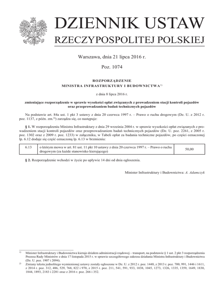 DZIENNIK USTAW RZECZYPOSPOLITEJ POLSKIEJ Warszawa, dnia 21 lipca 2016 r. Poz. 1074 ROZPORZĄDZENIE MINISTRA INFRASTRUKTURY I Budownictwa 1) z dnia 8 lipca 2016 r. zmieniające rozporządzenie w sprawie wysokości opłat związanych z prowadzeniem stacji kontroli pojazdów oraz przeprowadzaniem badań technicznych pojazdów Na podstawie art. 84a ust. 1 pkt 3 ustawy z dnia 20 czerwca 1997 r. – Prawo o ruchu drogowym (Dz. U. z 2012 r. poz. 1137, z późn. zm.2)) zarządza się, co następuje: § 1. W rozporządzeniu Ministra Infrastruktury z dnia 29 września 2004 r. w sprawie wysokości opłat związanych z prowadzeniem stacji kontroli pojazdów oraz przeprowadzaniem badań technicznych pojazdów (Dz. U. poz. 2261, z 2005 r. poz. 1302 oraz z 2009 r. poz. 1233) w załączniku, w Tabeli opłat za badania techniczne pojazdów, po części oznaczonej lp. 6.12 dodaje się część oznaczoną lp. 6.13 w brzmieniu: 6.13 o którym mowa w art. 81 ust. 11 pkt 10 ustawy z dnia 20 czerwca 1997 r. – Prawo o ruchu drogowym (za każde stanowisko kierującego) 50,00 § 2. Rozporządzenie wchodzi w życie po upływie 14 dni od dnia ogłoszenia. Minister Infrastruktury i Budownictwa: A. Adamczyk 1) Minister Infrastruktury i Budownictwa kieruje działem administracji rządowej – transport, na podstawie § 1 ust. 2 pkt 3 rozporządzenia Prezesa Rady Ministrów z dnia 17 listopada 2015 r. w sprawie szczegółowego zakresu działania Ministra Infrastruktury i Budownictwa (Dz. U. poz. 1907 i 2094). 2) Zmiany tekstu jednolitego wymienionej ustawy zostały ogłoszone w Dz. U. z 2012 r. poz. 1448, z 2013 r. poz. 700, 991, 1446 i 1611, z 2014 r. poz. 312, 486, 529, 768, 822 i 970, z 2015 r. poz. 211, 541, 591, 933, 1038, 1045, 1273, 1326, 1335, 1359, 1649, 1830, 1844, 1893, 2183 i 2281 oraz z 2016 r. poz. 266 i 352.