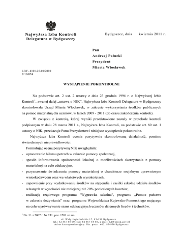 Bydgoszcz, dnia NajwyŜsza Izba Kontroli kwietnia 2011 r. Delegatura w Bydgoszczy Pan Andrzej Pałucki Prezydent Miasta Włocławek LBY- 4101-25-01/2010 P/10/074 WYSTĄPIENIE POKONTROLNE Na podstawie art. 2 ust. 2 ustawy z dnia 23 grudnia 1994 r. o NajwyŜszej Izbie Kontroli1, zwanej dalej „ustawą o NIK”, NajwyŜsza Izba Kontroli Delegatura w Bydgoszczy skontrolowała Urząd Miasta Włocławek, w zakresie wykorzystania środków publicznych na pomoc materialną dla uczniów, w latach 2009 - 2011 (do czasu zakończenia kontroli). W związku z kontrolą, której wyniki przedstawione zostały w protokole kontroli podpisanym w dniu 28 marca 2011 r., NajwyŜsza Izba Kontroli, na podstawie art. 60 ust. 1 ustawy o NIK, przekazuje Panu Prezydentowi niniejsze wystąpienie pokontrolne. NajwyŜsza Izba Kontroli ocenia pozytywnie skontrolowaną działalność, pomimo stwierdzonych nieprawidłowości. Formułując ocenę pozytywną NIK uwzględniła: - opracowanie bilansu potrzeb w zakresie pomocy społecznej, - sposób informowania społeczności lokalnej o moŜliwościach skorzystania z pomocy materialnej na cele edukacyjne, - przyznawanie świadczenia pomocy materialnej o charakterze socjalnym uprawnionym wnioskodawcom oraz we właściwych wysokościach, - zapewnienie przy wydatkowaniu środków na stypendia i zasiłki szkolne udziału środków własnych w wysokości nie mniejszej niŜ 20% poniesionych kosztów, - realizację rządowego programu "Wyprawka szkolna", programu „Pomoc państwa w zakresie doŜywiania” oraz programu Województwa Kujawsko-Pomorskiego mającego na celu wyrównywanie szans edukacyjnych uczniów dziennych liceów i techników. 1 Dz. U. z 2007 r. Nr 231, poz. 1701 ze zm. u l. Wa ły Ja gi elloń ski e 12 , 85 -131 B yd gos zc z t el. : 52 567 58 00, fa x: 52 567 58 60, e- mai l: LB Y@nik. gov.p l Ad r es k or esp ond enc yjn y: S k r. p oc zt. 612 , 85 -950 B yd gos zc z 2 Bilans potrzeb w zakresie pomocy społecznej, opracowano stosownie do art. 17 ust 1 pkt 2 ustawy z dnia 12 marca 2004 r. o pomocy społecznej2. W latach 2009-2010 liczba rodzin dotkniętych problemami określonymi w art. 90d ust. 1 ustawy z dnia 7 września 1991 r. o systemie oświaty3 zwanej dalej „ustawą o systemie oświaty” wynosiła odpowiednio 2200 i 2199, Społeczność lokalną informowano o moŜliwościach skorzystania z pomocy materialnej na cele edukacyjne w sposób, który umoŜliwiał dotarcie z informacją do zainteresowanych osób. Informacje te zamieszczano na stronach internetowych, w prasie lokalnej, a takŜe przekazywano je zainteresowanym osobom współpracując ze Szkołami oraz Miejskim Ośrodkiem Pomocy Społecznej we Włocławku. Świadczenia pomocy materialnej o charakterze socjalnym, tj. stypendia szkolne i zasiłki szkolne, w 2009 r. i 2010 r. przyznawano na podstawie Regulaminu udzielania pomocy materialnej o charakterze socjalnym uczniom zamieszkałym na terenie Gminy Miasto Włocławek, zwanego dalej Regulaminem pomocy materialnej, przyjętego Uchwałą Nr 48/IX/2007 Rady Miasta Włocławek z dnia 18 czerwca 2007 roku. Stypendia i zasiłki przyznano uprawnionym wnioskodawcom spełniającym kryteria otrzymania pomocy określone w art. 90d ust. 1 i ust. 7 ustawy o systemie oświaty. Wysokość przyznanych świadczeń była zgodna z zasadami ustalonymi w Regulaminie pomocy materialnej oraz z postanowieniami art. 90d ust. 9 ustawy o systemie oświaty. Wypłaty stypendiów dokonywano w ustalonych w Regulaminie terminach. W 2009 r. i 2010 r. stypendia szkolne przyznano odpowiednio 1938 i 1942 uczniom, zasiłki szkolne przyznano odpowiednio 20 i 29 uczniom. W latach 2009 – 2010 przestrzegano określonego w art. 90 r. ustawy o systemie oświaty wymogu przeznaczenia na zasiłki szkolne nie więcej niŜ 5% dotacji celowej otrzymanej z przeznaczeniem na stypendia i zasiłki szkolne. W 2009 r. na stypendia i zasiłki szkolne wykorzystano kwotę 1.870.592,00 zł., z czego na zasiłki szkolne 6.620,00 zł, co stanowi 0,35 % wykorzystanych środków, a w 2010 r. odpowiednio 1.323.057,60 zł. i 10.920,00 zł, czyli 0,83 % wykorzystanych środków. Wydatkując środki na stypendia i zasiłki szkolne zapewniono udział środków własnych w wysokości nie mniejszej niŜ 20% poniesionych kosztów, stosownie 2 3 Dz. U. z 2009 r. Nr 175, poz. 1362, ze zm. Dz. U. z 2004 r. Nr 256, poz. 2572 ze zm. 3 do art. 128 ust. 2 ustawy z dnia 27 sierpnia 2009 r. o finansach publicznych4 w związku z art. 90p ust. 1 ustawy o systemie oświaty. W 2010 r. wydatkowano 1.653.822 zł., z czego udział własny wyniósł 330.764,40 zł., co stanowi 20% wydatków. W 2009 r. i 2010 r. Urząd prawidłowo zrealizował rządowy program pomocy uczniom "Wyprawka szkolna", dotyczący udzielania pomocy finansowej uczniom na zakup podręczników. W 2009 r. dofinansowanie w łącznej kwocie 124.770,00 zł. otrzymało 671 uczniów, a w 2010 r. dofinansowanie wynosiło 167.680,00 zł. I otrzymało je 698 uczniów. Liczba uczniów niespełniających kryterium dochodowego, którym udzielono pomocy nie przekroczyła 10 % ogólnej liczby uczniów rozpoczynających naukę w danym roku szkolnym i w 2009 r. stanowiła 1,7% , a w 2010 r. - 2,3% uczniów. Ponadto w 2010 r. 16 uczniom przyznano zasiłki powodziowe na cele edukacyjne w łącznej wysokości 16.000,00 zł. Pomocą w zakresie doŜywiania w latach 2009-2010, na podstawie ustawy z dnia 29 grudnia 2005 r. o ustanowieniu programu wieloletniego „Pomoc państwa w zakresie doŜywiania”5, objęto wszystkich uczniów spełniających kryteria, tj. w 2009 r. - 3131 uczniów szkół podstawowych i 503 uczniów gimnazjów, w 2010 r. - 1221 uczniów szkół podstawowych i 292 uczniów gimnazjów. NIK pozytywnie ocenia przystąpienie do realizowanego przez Województwo Kujawsko-Pomorskie programu mającego na celu wyrównywanie szans edukacyjnych, przyjętego Uchwałą nr XLIV/664/06 Sejmiku Województwa Kujawsko-Pomorskiego z dnia 13 marca 2006 r. w sprawie zasad udziela