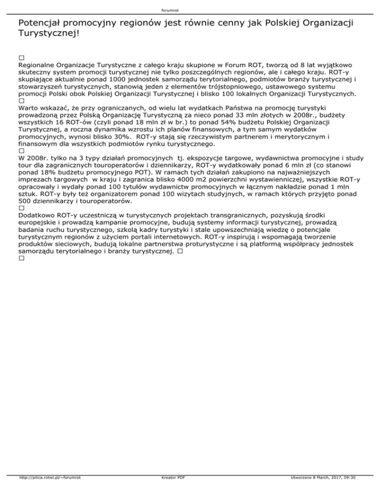forumrot Potencjał promocyjny regionów jest równie cenny jak Polskiej Organizacji Turystycznej! Regionalne Organizacje Turystyczne z całego kraju skupione w Forum ROT, tworzą od 8 lat wyjątkowo skuteczny system promocji turystycznej nie tylko poszczególnych regionów, ale i całego kraju. ROT-y skupiające aktualnie ponad 1000 jednostek samorządu terytorialnego, podmiotów branży turystycznej i stowarzyszeń turystycznych, stanowią jeden z elementów trójstopniowego, ustawowego systemu promocji Polski obok Polskiej Organizacji Turystycznej i blisko 100 lokalnych Organizacji Turystycznych. Warto wskazać, że przy ograniczanych, od wielu lat wydatkach Państwa na promocję turystyki prowadzoną przez Polską Organizację Turystyczną za nieco ponad 33 mln złotych w 2008r., budżety wszystkich 16 ROT-ów (czyli ponad 18 mln zł w br.) to ponad 54% budżetu Polskiej Organizacji Turystycznej, a roczna dynamika wzrostu ich planów finansowych, a tym samym wydatków promocyjnych, wynosi blisko 30%. ROT-y stają się rzeczywistym partnerem i merytorycznym i finansowym dla wszystkich podmiotów rynku turystycznego. W 2008r. tylko na 3 typy działań promocyjnych tj. ekspozycje targowe, wydawnictwa promocyjne i study tour dla zagranicznych touroperatorów i dziennikarzy, ROT-y wydatkowały ponad 6 mln zł (co stanowi ponad 18% budżetu promocyjnego POT). W ramach tych działań zakupiono na najważniejszych imprezach targowych w kraju i zagranica blisko 4000 m2 powierzchni wystawienniczej, wszystkie ROT-y opracowały i wydały ponad 100 tytułów wydawnictw promocyjnych w łącznym nakładzie ponad 1 mln sztuk. ROT-y były też organizatorem ponad 100 wizytach studyjnych, w ramach których przyjęto ponad 500 dziennikarzy i touroperatorów. Dodatkowo ROT-y uczestniczą w turystycznych projektach transgranicznych, pozyskują środki europejskie i prowadzą kampanie promocyjne, budują systemy informacji turystycznej, prowadzą badania ruchu turystycznego, szkolą kadry turystyki i stale upowszechniają wiedzę o potencjale turystycznym regionów z użyciem portali internetowych. ROT-y inspirują i wspomagają tworzenie produktów sieciowych, budują lokalne partnerstwa proturystyczne i są platformą współpracy jednostek samorządu terytorialnego i branży turystycznej. http://pilica.rotwl.pl/~forumrot Kreator PDF Utworzono 8 March, 2017, 09:30