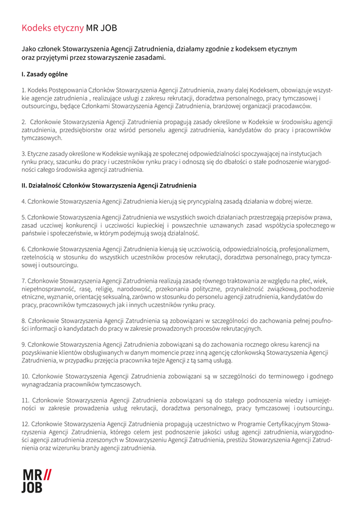 Kodeks etyczny MR JOB Jako członek Stowarzyszenia Agencji Zatrudnienia, działamy zgodnie z kodeksem etycznym oraz przyjętymi przez stowarzyszenie zasadami. I. Zasady ogólne 1. Kodeks Postępowania Członków Stowarzyszenia Agencji Zatrudnienia, zwany dalej Kodeksem, obowiązuje wszystkie agencje zatrudnienia , realizujące usługi z zakresu rekrutacji, doradztwa personalnego, pracy tymczasowej i outsourcingu, będące Członkami Stowarzyszenia Agencji Zatrudnienia, branżowej organizacji pracodawców. 2. Członkowie Stowarzyszenia Agencji Zatrudnienia propagują zasady określone w Kodeksie w środowisku agencji zatrudnienia, przedsiębiorstw oraz wśród personelu agencji zatrudnienia, kandydatów do pracy i pracowników tymczasowych. 3. Etyczne zasady określone w Kodeksie wynikają ze społecznej odpowiedzialności spoczywającej na instytucjach rynku pracy, szacunku do pracy i uczestników rynku pracy i odnoszą się do dbałości o stałe podnoszenie wiarygodności całego środowiska agencji zatrudnienia. II. Działalność Członków Stowarzyszenia Agencji Zatrudnienia 4. Członkowie Stowarzyszenia Agencji Zatrudnienia kierują się pryncypialną zasadą działania w dobrej wierze. 5. Członkowie Stowarzyszenia Agencji Zatrudnienia we wszystkich swoich działaniach przestrzegają przepisów prawa, zasad uczciwej konkurencji i uczciwości kupieckiej i powszechnie uznawanych zasad współżycia społecznego w państwie i społeczeństwie, w którym podejmują swoją działalność. 6. Członkowie Stowarzyszenia Agencji Zatrudnienia kierują się uczciwością, odpowiedzialnością, profesjonalizmem, rzetelnością w stosunku do wszystkich uczestników procesów rekrutacji, doradztwa personalnego, pracy tymczasowej i outsourcingu. 7. Członkowie Stowarzyszenia Agencji Zatrudnienia realizują zasadę równego traktowania ze względu na płeć, wiek, niepełnosprawność, rasę, religię, narodowość, przekonania polityczne, przynależność związkową, pochodzenie etniczne, wyznanie, orientację seksualną, zarówno w stosunku do personelu agencji zatrudnienia, kandydatów do pracy, pracowników tymczasowych jak i innych uczestników rynku pracy. 8. Członkowie Stowarzyszenia Agencji Zatrudnienia są zobowiązani w szczególności do zachowania pełnej poufności informacji o kandydatach do pracy w zakresie prowadzonych procesów rekrutacyjnych. 9. Członkowie Stowarzyszenia Agencji Zatrudnienia zobowiązani są do zachowania rocznego okresu karencji na pozyskiwanie klientów obsługiwanych w danym momencie przez inną agencję członkowską Stowarzyszenia Agencji Zatrudnienia, w przypadku przejęcia pracownika tejże Agencji z tą samą usługą. 10. Członkowie Stowarzyszenia Agencji Zatrudnienia zobowiązani są w szczególności do terminowego i godnego wynagradzania pracowników tymczasowych. 11. Członkowie Stowarzyszenia Agencji Zatrudnienia zobowiązani są do stałego podnoszenia wiedzy i umiejętności w zakresie prowadzenia usług rekrutacji, doradztwa personalnego, pracy tymczasowej i outsourcingu. 12. Członkowie Stowarzyszenia Agencji Zatrudnienia propagują uczestnictwo w Programie Certyfikacyjnym Stowarzyszenia Agencji Zatrudnienia, którego celem jest podnoszenie jakości usług agencji zatrudnienia, wiarygodności agencji zatrudnienia zrzeszonych w Stowarzyszeniu Agencji Zatrudnienia, prestiżu Stowarzyszenia Agencji Zatrudnienia oraz wizerunku branży agencji zatrudnienia. III. Nadzór nad przestrzeganiem zasad Kodeksu 13. Za nadzór nad przestrzeganiem zasad etycznych przez Członków Stowarzyszenia Agencji Zatrudnienia odpowiada Komisja Etyki, która jest organem powołanym przez Zgromadzenie Ogólne Stowarzyszenia Agencji Zatrudnienia, uprawnionym w szczególności do rozpoznawania i rozstrzygania spraw z zakresu określonego Kodeksem, formułowania opinii i wniosków do Zarządu Stowarzyszenia Agencji Zatrudnienia oraz w sprawach przekazanych przez inne organy statutowe Stowarzyszenia Agencji Zatrudnienia lub ciała powołane przez nie. 14. Zasady działania Komisji Etyki określa Regulamin Komisji Etyki przyjęty uchwałą Zgromadzenia Ogólnego Stowarzyszenia Agencji Zatrudnienia. 15. Zażalenia i wnioski kandydatów do pracy, pracowników tymczasowych, przedsiębiorstw będących klientami agencji zatrudnienia lub pozostałych uczestników rynku skierowane w stronę któregokolwiek z Członków Stowarzyszenia Agencji Zatrudnienia są rozpatrywane przez Komisję Etyki Stowarzyszenia Agencji Zatrudnienia. 16. Sankcją za nieprzestrzeganie zasad etyki w działalności Członka Stowarzyszenia Agencji Zatrudnienia jest: a) nagana i wezwanie do natychmiastowego zaniechania naruszeń, b) zawieszenie w prawach Członka Stowarzyszenia Agencji Zatrudnienia na czas określony, niezbędny do usunięcia naruszeń, c) wykreślenie z listy Członków Stowarzyszenia Agencji Zatrudnienia. IV. Zapisy końcowe 17. Każdy Członek Stowarzyszenia Agencji Zatrudnienia obowiązany jest sygnować Kodeks na znak potwierdzenia pełnej akceptacji na realizację jego zapisów. 18. Podmioty niezależne, współpracujące ze Stowarzyszeniem Agencji Zatrudnienia lub podejmujące działania w imieniu Stowarzyszenia Agencji Zatrudnienia, winny zapoznać się z zasadami wynikającymi z Kodeksu i zobowiązać się do ich przestrzegania w obszarach realizacji zadań zleconych przez Stowarzyszenie Agencji Zatrudnienia. 19. Członkom Stowarzyszenia Agencji Zatrudnienia organizacja zapewnia wsparcie prawne i informacyjne, integrację środowiskową i odpowiedni zasób wiedzy mający na celu osiąganie i utrzymanie najwyższych standardów funkcjonowania agencji zatrudnienia. 20. Członkowie Stowarzyszenia Agencji Zatrudnienia zobowiązani są dbać o wizerunek i reputację Stowarzyszenia Agencji Zatrudnienia. Za agencje zatrudnienia zgodnie z art. 6 pkt.4) ustawy o promocji zatrudnienia i instytucjach rynku pracy (Dz.U.2004 Nr 99 poz.1001 z późn.zm.) uważa się niepubliczne jednostki orga