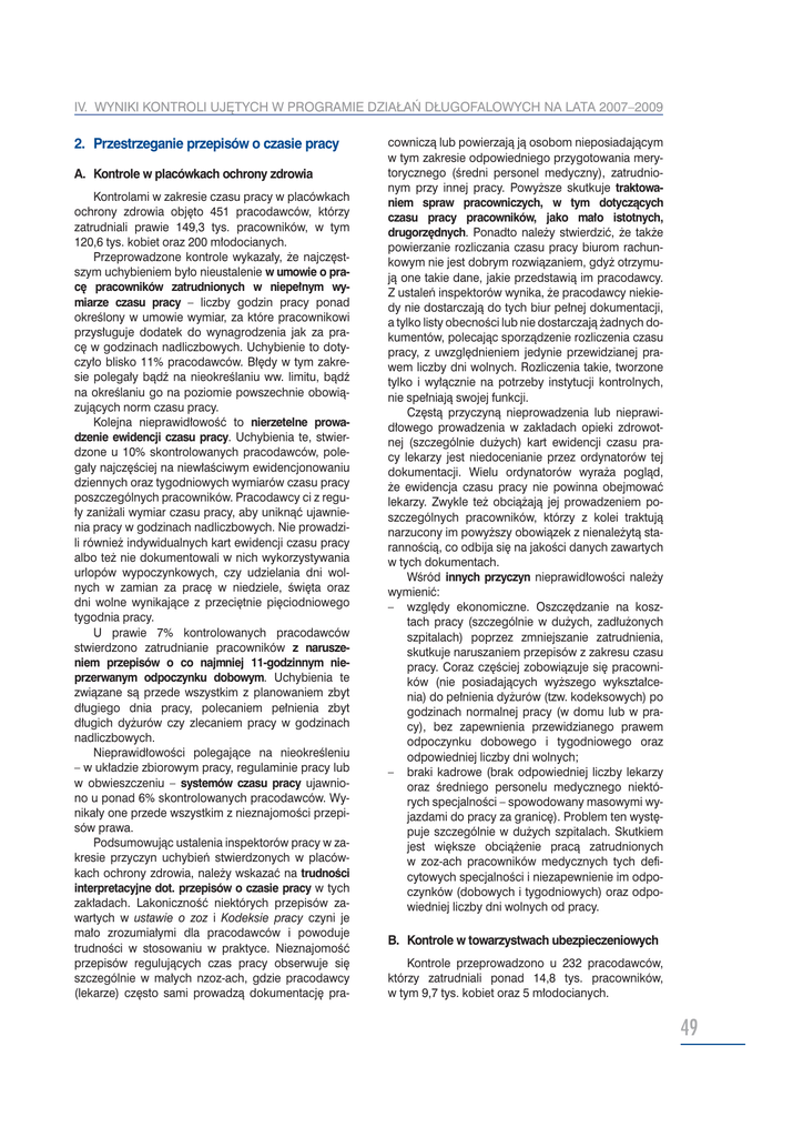 IV. WYNIKI KONTROLI UJĘTYCH W PROGRAMIE DZIAŁAŃ DŁUGOFALOWYCH NA LATA 2007–2009 2. Przestrzeganie przepisów o czasie pracy A. Kontrole w placówkach ochrony zdrowia Kontrolami w zakresie czasu pracy w placówkach ochrony zdrowia objęto 451 pracodawców, którzy zatrudniali prawie 149,3 tys. pracowników, w tym 120,6 tys. kobiet oraz 200 młodocianych. Przeprowadzone kontrole wykazały, że najczęstszym uchybieniem było nieustalenie w umowie o pracę pracowników zatrudnionych w niepełnym wymiarze czasu pracy – liczby godzin pracy ponad określony w umowie wymiar, za które pracownikowi przysługuje dodatek do wynagrodzenia jak za pracę w godzinach nadliczbowych. Uchybienie to dotyczyło blisko 11% pracodawców. Błędy w tym zakresie polegały bądź na nieokreślaniu ww. limitu, bądź na określaniu go na poziomie powszechnie obowiązujących norm czasu pracy. Kolejna nieprawidłowość to nierzetelne prowadzenie ewidencji czasu pracy. Uchybienia te, stwierdzone u 10% skontrolowanych pracodawców, polegały najczęściej na niewłaściwym ewidencjonowaniu dziennych oraz tygodniowych wymiarów czasu pracy poszczególnych pracowników. Pracodawcy ci z reguły zaniżali wymiar czasu pracy, aby uniknąć ujawnienia pracy w godzinach nadliczbowych. Nie prowadzili również indywidualnych kart ewidencji czasu pracy albo też nie dokumentowali w nich wykorzystywania urlopów wypoczynkowych, czy udzielania dni wolnych w zamian za pracę w niedziele, święta oraz dni wolne wynikające z przeciętnie pięciodniowego tygodnia pracy. U prawie 7% kontrolowanych pracodawców stwierdzono zatrudnianie pracowników z naruszeniem przepisów o co najmniej 11-godzinnym nieprzerwanym odpoczynku dobowym. Uchybienia te związane są przede wszystkim z planowaniem zbyt długiego dnia pracy, polecaniem pełnienia zbyt długich dyżurów czy zlecaniem pracy w godzinach nadliczbowych. Nieprawidłowości polegające na nieokreśleniu – w układzie zbiorowym pracy, regulaminie pracy lub w obwieszczeniu – systemów czasu pracy ujawniono u ponad 6% skontrolowanych pracodawców. Wynikały one przede wszystkim z nieznajomości przepisów prawa. Podsumowując ustalenia inspektorów pracy w zakresie przyczyn uchybień stwierdzonych w placówkach ochrony zdrowia, należy wskazać na trudności interpretacyjne dot. przepisów o czasie pracy w tych zakładach. Lakoniczność niektórych przepisów zawartych w ustawie o zoz i Kodeksie pracy czyni je mało zrozumiałymi dla pracodawców i powoduje trudności w stosowaniu w praktyce. Nieznajomość przepisów regulujących czas pracy obserwuje się szczególnie w małych nzoz-ach, gdzie pracodawcy (lekarze) często sami prowadzą dokumentację pra- cowniczą lub powierzają ją osobom nieposiadającym w tym zakresie odpowiedniego przygotowania merytorycznego (średni personel medyczny), zatrudnionym przy innej pracy. Powyższe skutkuje traktowaniem spraw pracowniczych, w tym dotyczących czasu pracy pracowników, jako mało istotnych, drugorzędnych. Ponadto należy stwierdzić, że także powierzanie rozliczania czasu pracy biurom rachunkowym nie jest dobrym rozwiązaniem, gdyż otrzymują one takie dane, jakie przedstawią im pracodawcy. Z ustaleń inspektorów wynika, że pracodawcy niekiedy nie dostarczają do tych biur pełnej dokumentacji, a tylko listy obecności lub nie dostarczają żadnych dokumentów, polecając sporządzenie rozliczenia czasu pracy, z uwzględnieniem jedynie przewidzianej prawem liczby dni wolnych. Rozliczenia takie, tworzone tylko i wyłącznie na potrzeby instytucji kontrolnych, nie spełniają swojej funkcji. Częstą przyczyną nieprowadzenia lub nieprawidłowego prowadzenia w zakładach opieki zdrowotnej (szczególnie dużych) kart ewidencji czasu pracy lekarzy jest niedocenianie przez ordynatorów tej dokumentacji. Wielu ordynatorów wyraża pogląd, że ewidencja czasu pracy nie powinna obejmować lekarzy. Zwykle też obciążają jej prowadzeniem poszczególnych pracowników, którzy z kolei traktują narzucony im powyższy obowiązek z nienależytą starannością, co odbija się na jakości danych zawartych w tych dokumentach. Wśród innych przyczyn nieprawidłowości należy wymienić: – względy ekonomiczne. Oszczędzanie na kosztach pracy (szczególnie w dużych, zadłużonych szpitalach) poprzez zmniejszanie zatrudnienia, skutkuje naruszaniem przepisów z zakresu czasu pracy. Coraz częściej zobowiązuje się pracowników (nie posiadających wyższego wykształcenia) do pełnienia dyżurów (tzw. kodeksowych) po godzinach normalnej pracy (w domu lub w pracy), bez zapewnienia przewidzianego prawem odpoczynku dobowego i tygodniowego oraz odpowiedniej liczby dni wolnych; – braki kadrowe (brak odpowiedniej liczby lekarzy oraz średniego personelu medycznego niektórych specjalności – spowodowany masowymi wyjazdami do pracy za granicę). Problem ten występuje szczególnie w dużych szpitalach. Skutkiem jest większe obciążenie pracą zatrudnionych w zoz-ach pracowników medycznych tych deficytowych specjalności i niezapewnienie im odpoczynków (dobowych i tygodniowych) oraz odpowiedniej liczby dni wolnych od pracy. B. Kontrole w towarzystwach ubezpieczeniowych Kontrole przeprowadzono u 232 pracodawców, którzy zatrudniali ponad 14,8 tys. pracowników, w tym 9,7 tys. kobiet oraz 5 młodocianych. 49