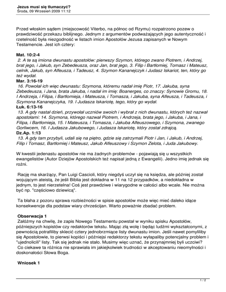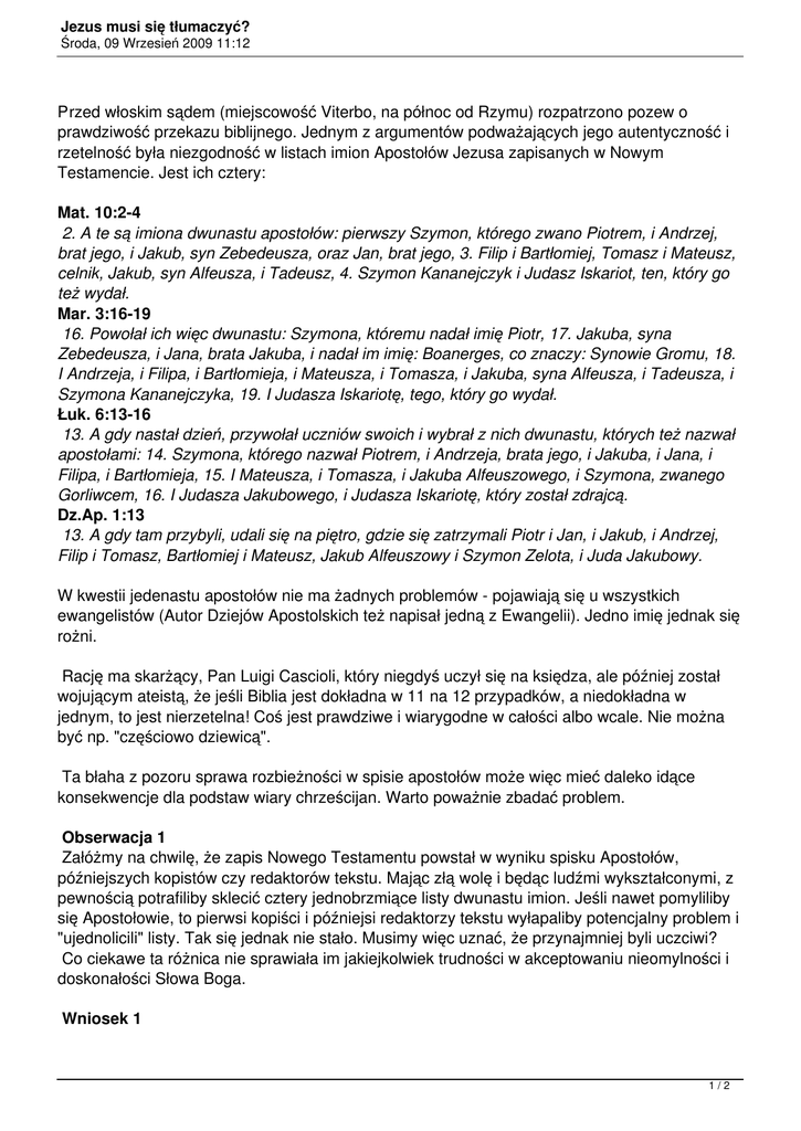 Jezus musi się tłumaczyć? Środa, 09 Wrzesień 2009 11:12 Przed włoskim sądem (miejscowość Viterbo, na północ od Rzymu) rozpatrzono pozew o prawdziwość przekazu biblijnego. Jednym z argumentów podważających jego autentyczność i rzetelność była niezgodność w listach imion Apostołów Jezusa zapisanych w Nowym Testamencie. Jest ich cztery: Mat. 10:2-4 2. A te są imiona dwunastu apostołów: pierwszy Szymon, którego zwano Piotrem, i Andrzej, brat jego, i Jakub, syn Zebedeusza, oraz Jan, brat jego, 3. Filip i Bartłomiej, Tomasz i Mateusz, celnik, Jakub, syn Alfeusza, i Tadeusz, 4. Szymon Kananejczyk i Judasz Iskariot, ten, który go też wydał. Mar. 3:16-19 16. Powołał ich więc dwunastu: Szymona, któremu nadał imię Piotr, 17. Jakuba, syna Zebedeusza, i Jana, brata Jakuba, i nadał im imię: Boanerges, co znaczy: Synowie Gromu, 18. I Andrzeja, i Filipa, i Bartłomieja, i Mateusza, i Tomasza, i Jakuba, syna Alfeusza, i Tadeusza, i Szymona Kananejczyka, 19. I Judasza Iskariotę, tego, który go wydał. Łuk. 6:13-16 13. A gdy nastał dzień, przywołał uczniów swoich i wybrał z nich dwunastu, których też nazwał apostołami: 14. Szymona, którego nazwał Piotrem, i Andrzeja, brata jego, i Jakuba, i Jana, i Filipa, i Bartłomieja, 15. I Mateusza, i Tomasza, i Jakuba Alfeuszowego, i Szymona, zwanego Gorliwcem, 16. I Judasza Jakubowego, i Judasza Iskariotę, który został zdrajcą. Dz.Ap. 1:13 13. A gdy tam przybyli, udali się na piętro, gdzie się zatrzymali Piotr i Jan, i Jakub, i Andrzej, Filip i Tomasz, Bartłomiej i Mateusz, Jakub Alfeuszowy i Szymon Zelota, i Juda Jakubowy. W kwestii jedenastu apostołów nie ma żadnych problemów - pojawiają się u wszystkich ewangelistów (Autor Dziejów Apostolskich też napisał jedną z Ewangelii). Jedno imię jednak się rożni. Rację ma skarżący, Pan Luigi Cascioli, który niegdyś uczył się na księdza, ale później został wojującym ateistą, że jeśli Biblia jest dokładna w 11 na 12 przypadków, a niedokładna w jednym, to jest nierzetelna! Coś jest prawdziwe i wiarygodne w całości albo wcale. Nie można być np. "częściowo dziewicą". Ta błaha z pozoru sprawa rozbieżności w spisie apostołów może więc mieć daleko idące konsekwencje dla podstaw wiary chrześcijan. Warto poważnie zbadać problem. Obserwacja 1 Załóżmy na chwilę, że zapis Nowego Testamentu powstał w wyniku spisku Apostołów, późniejszych kopistów czy redaktorów tekstu. Mając złą wolę i będąc ludźmi wykształconymi, z pewnością potrafiliby sklecić cztery jednobrzmiące listy dwunastu imion. Jeśli nawet pomyliliby się Apostołowie, to pierwsi kopiści i późniejsi redaktorzy tekstu wyłapaliby potencjalny problem i "ujednolicili" listy. Tak się jednak nie stało. Musimy więc uznać, że przynajmniej byli uczciwi? Co ciekawe ta różnica nie sprawiała im jakiejkolwiek trudności w akceptowaniu nieomylności i doskonałości Słowa Boga. Wniosek 1 1/2 Jezus musi się tłumaczyć? Środa, 09 Wrzesień 2009 11:12 Autorzy Nowego Testamentu nie widzieli żadnego problemu w rozbieżności powyższych list ani ich nie poprawili (jeśli byliby oszustami) ani nie przestali wierzyć w ich poprawność (a kładli wielokrotnie nacisk na sprawdzenie i możliwą weryfikację podawanych przez siebie informacji, np.: Łuk. 1:1-4 Skoro już wielu podjęło się sporządzenia opisu wydarzeń, które wśród nas się dokonały, Jak nam to przekazali naoczni od samego początku świadkowie i słudzy Słowa, postanowiłem i ja, który wszystko od początku przebadałem , dokładnie kolejno ci to opisać, dostojny Teofilu, abyś upewnił się o prawdziwości nauki , jaką odebrałeś. 1 Kor. 15:3-6 Najpierw bowiem podałem wam to, co i ja przejąłem, że Chrystus umarł za grzechy nasze według Pism I że został pogrzebany, i że dnia trzeciego został z martwych wzbudzony według Pism, I że ukazał się Kefasowi, potem dwunastu; Potem ukazał się więcej niż pięciuset braciom naraz, z których większość dotychczas żyje, niektórzy zaś zasnęli; Dz.Ap. 2:22 Mężowie izraelscy! Posłuchajcie tych słów: Jezusa Nazareńskiego, męża, którego Bóg wśród was uwierzytelnił przez czyny niezwykłe, cuda i znaki, jakie Bóg przez niego między wami uczynił, jak to sami wiecie. (Piotr zwraca się tu do niewierzących Żydów) Wyróżnienia Autora. Obserwacja 2 Część Apostołów określana jest oprócz imion koligacjami rodzinnymi (brat, syn), cechami charakteru (Gorliwiec), zawodem (celnik) lub pochodzeniem (Kananejczyk). Daje się tu zauważyć pewna dowolność występowania bądź nie tych cech dodatkowych (celnik) a także ich zmienność (Szymon Kananejczyk, a dalej Szymon, zwany Gorliwcem). Wniosek 2: W tamtych czasach kwestia imion nie była tak jednoznaczna, jak dzisiaj, kiedy każdy ma w dowodzie wpisane imię (imiona) i nazwisko oraz PESEL - na chipa jeszcze musimy trochę poczekać. Nie budziło zdziwienia nazywanie tego samego człowieka za pomocą różnych, ale jednocześnie prawdziwych określeń. Obserwacja 3 W czasach Jezusa teren Izraela był areną przenikania się wielu wpływów i kultur. Oprócz tradycyjnej spuścizny żydowskiej wielką rolę odgrywała wtedy cywilizacja grecka i rzymska (Nawet Nowy Testament został spisany w uproszczonym języku greckim - koine, co stanowiło owoc podbojów Aleksandra Macedońskiego). Częstym zwyczajem było więc nadawanie podwójnych imion (żydowskiego i greckiego bądź rzymskiego - hebr. Kefas, gr. Szymon),) lub ich tłumaczenie na grekę (hebr. Kefas, gr. Petros -w obu językach pochodne słowa skała, kamień, hebr. Tabitha, gr. Dorcas - Dz. 9:36 - gazela). W naszym kontrowersyjnym przypadku mamy do czynienia w dwu opisach (Ew. Łukasza i Dzieje Ap., obydwa autorstwa Łukasza) z imieniem typowo hebrajskim Juda, a u Mateusza i Marka z greckim Tadeusz. Wniosek 3 pozostawiam Państwu? 2/2