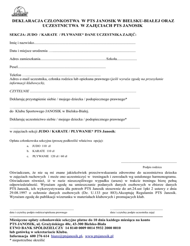 DEKLARACJA CZŁONKOSTWA W PTS JANOSIK W BIELSKU-BIAŁEJ ORAZ UCZESTNICTWA W ZAJĘCIACH PTS JANOSIK SEKCJA: JUDO / KARATE / PŁYWANIE* DANE UCZESTNIKA ZAJĘĆ: Imię i nazwisko.......................................................................................................... Data i miejsce urodzenia …....................................................................................... Adres zamieszkania.....................................................................Szkoła..................... Pesel............................................................................................ Telefon ….............................................................................. Adres e-mail uczestnika, członka rodzica lub opiekuna prawnego (jeśli wyraża zgodę na przesyłanie informacji klubowych), CZYTELNIE ............................................................................................................... Deklaruję przystąpienie siebie / mojego dziecka / podopiecznego prawnego* ….................................................................................................................................... do Klubu Sportowego JANOSIK w Bielsku-Białej. Deklaruję uczestnictwo siebie / mojego dziecka / podopiecznego prawnego* ….................................................................................................................................... w zajęciach sekcji JUDO / KARATE / PŁYWANIE* PTS Janosik: Opłata członkowska sekcyjna (proszę podkreślić właściwa opcję): a. JUDO 110 zł b. KARATE 110 zł c. PŁYWANIE 120 zł / 60 zł .......................................................... Podpis rodzica Oświadczam, że nie są mi znane jakiekolwiek przeciwwskazania zdrowotne do uczestnictwa dziecka w zajęciach ruchowych i może ono uczestniczyć w treningach i zawodach wg ustalonego harmonogramu. Oświadczam również, iż w razie nieszczęśliwego wypadku (urazu) w trakcie treningu biorę pełną odpowiedzialność. Wyrażam zgodę na umieszczanie podanych danych osobowych w zbiorze danych PTS Janosik, ich wykorzystywania dla potrzeb PTS Janosik stosownie do art.24.ust 1pkt 2 ustawy z dnia 29.08.1997 o ochronie danych osobowych (Dz. U.133 poz 883).Akceptuję Regulamin PTS Janosik. Wyrażam zgodę do publikacji wizerunku w materiałach klubowych i promujacych klub. …............................................................... …................................................... data i czytelny podpis rodzica/opiekuna prawnego data i czytelny podpis uczestnika zajęć …............................................................................................................................................................ Miesięczne opłaty członkowskie sekcyjne płatne do 10 dnia każdego miesiąca na konto PTS JANOSIK, ul. Grażyńskiego 40c, 43-300 Bielsko-Biała ETNO BANK SPÓŁDZIELCZY 14 8140 0009 0014 5932 2000 0010 lub gotówką w sekretariacie Klubu. Informacja 600 276 614 [email protected], www.ptsjanosik.pl * niepotrzebne skreślić OŚWIADCZENIE O STANIE ZDROWIA DZIECKA Ja, …...................................................................................................................................................... oświadczam, że moje dziecko* …....................................................................................................... nr PESEL ….................................................................... jest / jestem* w dobrym stanie zdrowia i nie posiada / m przeciwwskazań zdrowotnych do udziału w treningach ,zajęciach i imprezach sportowych organizowanych przez Podbeskidzkie Towarzystwo Sportowe ''JANOSIK'' w Bielsku- Białej. Wyrażam zgodę, aby moje dziecko uczestniczyło w treningach, zajęciach i imprezach sportowych organizowanych przez PTS ''JANOSIK'' w Bielsku-Białej.* Jestem świadomy/a ,że udział w treningach ,zajęciach, imprezach sportowych i zawodach wiąże się z niebezpieczeństwem ,akceptuję ryzyko ewentualnego wypadku i nie będę wnosił/a jakichkolwiek roszczeń z nim związanych wobec syowarzyszenia Podbeskidzkie Towarzystwo Sportowe ''JANOSIK'' w Bielsku-Białej. Jednoczenie wyrażam zgodę na udzielenie pierwszej pomocy mojemu dziecku, jeśli taka potrzeba zaistnieje.* Bielsko- Biała, dnia............................ Podpis............................................... Oświadczam, że moje dziecko........................................................................................ posiada/nie posiada ubezpieczenia w zakresie sportu.* 1. Jestem zainteresowany/a ubezpieczeniem mojego dziecka przez PTS Janosik w ramach grupowej polisy klubowej (ubezpieczenie NNW na kwotę 10 000zł) 2. Nie jestem zainteresowany/a ubezpieczeniem mojego dziecka przez PTS Janosik w ramach grupowej polisy klubowej (ubezpieczenie NNW na kwotę 10 000zł) Imię i nazwisko Rodzica/Opiekuna ….................................Data...............................Podpis...................................... *niepotrzebne skreślić / skreślić w przypadku wypełniania własnego zgłoszenia REGULAMIN OPŁACANIA SKŁADEK CZŁONKOWSKICH PTS JANOSIK 1. Opłacanie składek członkowskich jest statutowym obowiązkiem każdego członka klubu. Zgodnie z punktem 1 Regulaminu Klubu każdy członek klubu powinien opłacać składki członkowskie wg niżej ustalonych zasad. 2. Wysokość składki członkowskiej zależy od ilości treningów i sekcji SEKCJA JUDO – 110 zł / miesięcznie BO* od 1.09.2016 do 30.06.2017 SEKCJA KARATE – 110 zł / miesięcznie BO* od 1.09.2016 do 30.06.2017 SEKCJA PŁYWACKA – 120 zł / miesięcznie (2 x w tygodniu ) od 1.09.2016 do 30.06.2017 SEKCJA PŁYWACKA – 60 zł / miesięcznie (1 x w tygodniu ) od 1.09.2016 do 30.06.2017 3. SKŁADKA CZŁONKOWSKA30 zł dla osób nie trenujących w okresie 1.07.2017 do 31.08.2017 4. Istnieje możliwość obniżenia składki członkowskiej do kwoty 30 zł dla osób nie trenujących pod warunkiem zgłos