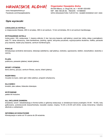 Organizator Hawajskie Aloha www.HawajskieAloha.pl Facebook.com/hawajskiealoha 06-500 Mława, ul. Długa 9A, tel. + 48 881-520-850 NIP: 566-169-28-36, REGON: 141986500 WPIS ORGANIZATORA TURYSTYKI - NUMER EWIDENCYJNY: 8300 Opis wycieczki LOKALIZACJA HOTELU w miejscowości Dassia, 200 m od plaży, 300 m od centrum, 13 km od lotniska, 50 m od centrum handlowego. WYPOSAŻENIE HOTELU liczba pokoi: 160, restauracje: 1, baseny odkryte: 2, bar, bar przy basenie, sejf (płatny), snack bar, lobby, sklep z pamiątkami, sala TV, taras słoneczny, sala bankietowa, parking, ogród, skrzynka pocztowa, wypożyczalnia skuterów, trafika, parasole przy basenie, leżaki przy basenie, centrum konferencyjne. POKOJE klimatyzacja centralnie sterowana, telewizja satelitarna, sejf (płatny), lodówka, ogrzewanie, telefon, taras/balkon, łazienka z wanną. PLAŻA publiczna, parasole (płatne), leżaki (płatne). SPORT I FITNESS tenis ziemny, jacuzzi, centrum fitness, sauna, bilard (płatny). ROZRYWKA muzyka na żywo, salon gier video (płatny), program artystyczny. DLA DZIECI brodzik, plac zabaw, łóżeczko dziecięce. WYŻYWIENIE pakiet All Inclusive. ALL INCLUSIVE ZAWIERA śniadanie, lunch i obiadokolację w formie bufetu w głównej restauracji; w określonym barze przekąski (10.00 - 18.00), lody gałkowane, podwieczorek (kawa/herbata, kawałek ciasta); między 10.30 a 23.00 soft drinki, wodę mineralną i lokalne alkohole w szklankach. INFORMACJE DODATKOWE Klimatyzacja w cenie od 15 czerca do 29 września. 1/2 Podane godziny serwowania posiłków oraz funkcjonowania poszczególnych elementów infrastruktury hotelowej mogą ulec nieznacznym zmianom, ze względu na sezonowość, siły wyższe i inne okoliczności, na które hotel nie ma wpływu. Biuro Podróży Hawajskie Aloha posiada pozwolenie Organizatora Imprez Turystycznych na cały świat, numer ewidencyjny 8300, zaświadczenie 1399 dokument wydany przez Urząd Marszałkowski woj. Mazowieckiego. Posiadamy również aktualną gwarancje ubezpieczeniową spełniająca rozporządzenie Ministra Finansów z dnia 16.12.2010r. w sprawie sumy gwarancji ubezpieczeniowej wymaganej w związku z prowadzoną działalnością gospodarczą jako Organizator Usług Turystycznych. Dokumenty firmy są dostępne na stronie internetowej www.hawajskiealoha.pl zakładka firma / dokumenty. 2/2