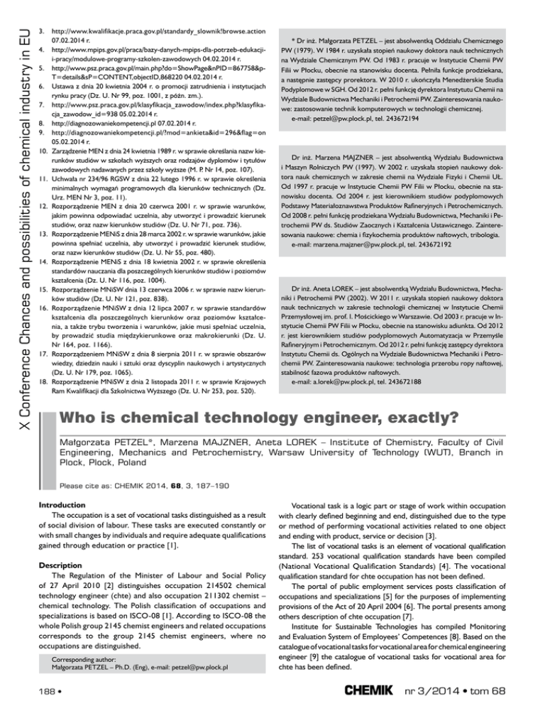 X Conference Chances and possibilities of chemical industry in EU 3. http://www.kwalifikacje.praca.gov.pl/standardy_slownik!browse.action 07.02.2014 r. 4. http://www.mpips.gov.pl/praca/bazy-danych-mpips-dla-potrzeb-edukacjii-pracy/modulowe-programy-szkolen-zawodowych 04.02.2014 r. 5. http://www.psz.praca.gov.pl/main.php?do=ShowPage&nPID=867758&pT=details&sP=CONTENT,objectID,868220 04.02.2014 r. 6. Ustawa z dnia 20 kwietnia 2004 r. o promocji zatrudnienia i instytucjach rynku pracy (Dz. U. Nr 99, poz. 1001, z późn. zm.). 7. http://www.psz.praca.gov.pl/klasyfikacja_zawodow/index.php?klasyfikacja_zawodow_id=938 05.02.2014 r. 8. http://diagnozowaniekompetencji.pl 07.02.2014 r. 9. http://diagnozowaniekompetencji.pl/?mod=ankieta&id=296&flag=on 05.02.2014 r. 10. Zarządzenie MEN z dnia 24 kwietnia 1989 r. w sprawie określania nazw kierunków studiów w szkołach wyższych oraz rodzajów dyplomów i tytułów zawodowych nadawanych przez szkoły wyższe (M. P. Nr 14, poz. 107). 11. Uchwała nr 234/96 RGSW z dnia 22 lutego 1996 r. w sprawie określenia minimalnych wymagań programowych dla kierunków technicznych (Dz. Urz. MEN Nr 3, poz. 11). 12. Rozporządzenie MEN z dnia 20 czerwca 2001 r. w sprawie warunków, jakim powinna odpowiadać uczelnia, aby utworzyć i prowadzić kierunek studiów, oraz nazw kierunków studiów (Dz. U. Nr 71, poz. 736). 13. Rozporządzenie MENiS z dnia 28 marca 2002 r. w sprawie warunków, jakie powinna spełniać uczelnia, aby utworzyć i prowadzić kierunek studiów, oraz nazw kierunków studiów (Dz. U. Nr 55, poz. 480). 14. Rozporządzenie MENiS z dnia 18 kwietnia 2002 r. w sprawie określenia standardów nauczania dla poszczególnych kierunków studiów i poziomów kształcenia (Dz. U. Nr 116, poz. 1004). 15. Rozporządzenie MNiSW dnia 13 czerwca 2006 r. w sprawie nazw kierunków studiów (Dz. U. Nr 121, poz. 838). 16. Rozporządzenie MNiSW z dnia 12 lipca 2007 r. w sprawie standardów kształcenia dla poszczególnych kierunków oraz poziomów kształcenia, a także trybu tworzenia i warunków, jakie musi spełniać uczelnia, by prowadzić studia międzykierunkowe oraz makrokierunki (Dz. U. Nr 164, poz. 1166). 17. Rozporządzeniem MNiSW z dnia 8 sierpnia 2011 r. w sprawie obszarów wiedzy, dziedzin nauki i sztuki oraz dyscyplin naukowych i artystycznych (Dz. U. Nr 179, poz. 1065). 18. Rozporządzenie MNiSW z dnia 2 listopada 2011 r. w sprawie Krajowych Ram Kwalifikacji dla Szkolnictwa Wyższego (Dz. U. Nr 253, poz. 520). * Dr inż. Małgorzata PETZEL – jest absolwentką Oddziału Chemicznego PW (1979). W 1984 r. uzyskała stopień naukowy doktora nauk technicznych na Wydziale Chemicznym PW. Od 1983 r. pracuje w Instytucie Chemii PW Filii w Płocku, obecnie na stanowisku docenta. Pełniła funkcje prodziekana, a następnie zastępcy prorektora. W 2010 r. ukończyła Menedżerskie Studia Podyplomowe w SGH. Od 2012 r. pełni funkcję dyrektora Instytutu Chemii na Wydziale Budownictwa Mechaniki i Petrochemii PW. Zainteresowania naukowe: zastosowanie technik komputerowych w technologii chemicznej. e-mail: [email protected], tel. 243672194 Dr inż. Marzena MAJZNER – jest absolwentką Wydziału Budownictwa i Maszyn Rolniczych PW (1997). W 2002 r. uzyskała stopień naukowy doktora nauk chemicznych w zakresie chemii na Wydziale Fizyki i Chemii UŁ. Od 1997 r. pracuje w Instytucie Chemii PW Filii w Płocku, obecnie na stanowisku docenta. Od 2004 r. jest kierownikiem studiów podyplomowych Podstawy Materiałoznawstwa Produktów Rafineryjnych i Petrochemicznych. Od 2008 r. pełni funkcję prodziekana Wydziału Budownictwa, Mechaniki i Petrochemii PW ds. Studiów Zaocznych i Kształcenia Ustawicznego. Zainteresowania naukowe: chemia i fizykochemia produktów naftowych, tribologia. e-mail: [email protected], tel. 243672192 Dr inż. Aneta LOREK – jest absolwentką Wydziału Budownictwa, Mechaniki i Petrochemii PW (2002). W 2011 r. uzyskała stopień naukowy doktora nauk technicznych w zakresie technologii chemicznej w Instytucie Chemii Przemysłowej im. prof. I. Mościckiego w Warszawie. Od 2003 r. pracuje w Instytucie Chemii PW Filii w Płocku, obecnie na stanowisku adiunkta. Od 2012 r. jest kierownikiem studiów podyplomowych Automatyzacja w Przemyśle Rafineryjnym i Petrochemicznym. Od 2012 r. pełni funkcję zastępcy dyrektora Instytutu Chemii ds. Ogólnych na Wydziale Budownictwa Mechaniki i Petrochemii PW. Zainteresowania naukowe: technologia przerobu ropy naftowej, stabilność fazowa produktów naftowych. e-mail: [email protected], tel. 243672188 Who is chemical technology engineer, exactly? Małgorzata PETZEL*, Marzena MAJZNER, Aneta LOREK – Institute of Chemistry, Faculty of Civil Engineering, Mechanics and Petrochemistry, Warsaw University of Technology (WUT), Branch in Plock, Plock, Poland Please cite as: CHEMIK 2014, 68, 3, 187–190 Introduction The occupation is a set of vocational tasks distinguished as a result of social division of labour. These tasks are executed constantly or with small changes by individuals and require adequate qualifications gained through education or practice [1]. Description The Regulation of the Minister of Labour and Social Policy of 27 April 2010 [2] distinguishes occupation 214502 chemical technology engineer (chte) and also occupation 211302 chemist – chemical technology. The Polish classification of occupations and specializations is based on ISCO-08 [1]. According to ISCO-08 the whole Polish group 2145 chemist engineers and related occupations corresponds to the group 2145 chemist engineers, where no occupations are distinguished. Corresponding author: Małgorzata PETZEL – Ph.D. (Eng), e-mail: [email protected] 188 • Vocational task is a logic part or stage of work within occupation with clearly defined beginning and end, distinguished due to the type or method of performing vocational activities related to one object and ending with product, service or decision [3]. The list of vocational tasks is an element of