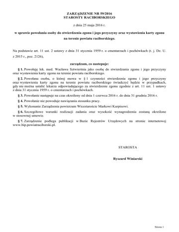 ZARZĄDZENIE NR 59/2016 STAROSTY RACIBORSKIEGO z dnia 25 maja 2016 r. w sprawie powołania osoby do stwierdzenia zgonu i jego przyczyny oraz wystawienia karty zgonu na terenie powiatu raciborskiego. Na podstawie art. 11 ust. 2 ustawy z dnia 31 stycznia 1959 r. o cmentarzach i pochówkach (t. j. Dz. U. z 2015 r., poz. 2126), zarządzam, co nastepuje: § 1. Powołuję lek. med. Wacława Sztwiertnia jako osobę do stwierdzania zgonu i jego przyczyny oraz wystawienia karty zgonu na terenie powiatu raciborskiego. § 2. Powołana osoba, o której mowa w § 1 czynności stwierdzenia zgonu i jego przyczyny oraz wystawienia karty zgonu na terenie powiatu raciborskiego świadczyć będzie w przypadkach, gdy nie można ustalić lekarza odpowiadającego za stwierdzenie zgonu zgodnie z art. 11 ust. 1 ustawy z dnia 31 stycznia 1959 r. o cmentarzach i pochówkach. § 3. Powołanie następuje na czas określony od dnia 1 czerwca 2016 r. do dnia 31 grudnia 2016 r. § 4. Powołanie nie powoduje nawiązania stosunku pracy. § 5. Wykonanie Zarządzenia powierzam Wicestaroście Markowi Kurpisowi. § 6. Szczegółowe warunki realizacji zadania oraz wysokość wynagrodzenia zostaną określone w stosownej umowie. § 7. Zarządzenie podlega publikacji w Bazie Rejestrów Urzędowych na stronie internetowej www.bip.powiatraciborski.pl. STAROSTA Ryszard Winiarski Strona 1