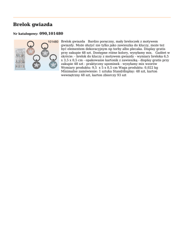 Brelok gwiazda Nr katalogowy: 090,101480 Brelok gwiazda Bardzo poręczny, mały breloczek z motywem gwiazdy. Może służyć nie tylko jako zawieszka do kluczy, może też być elementem dekoracyjnym np torby albo plecaka. Display gratis przy zakupie 48 szt. Dostępne różne kolory, wysyłamy mix. Gadżet w skrócie: - brelok do kluczy z motywem gwiazdy - wymiary breloka 6,5 x 3,5 x 0,5 cm - opakowanie kartonik z zawieszką - display gratis przy zakupie 48 szt - praktyczny upominek - wysyłamy mix wzorów Wymiary produktu: 9,5 x 5 x 0,5 cm Waga produktu: 0,022 kg Minimalne zamówienie: 1 sztuka Stand/display: 48 szt, karton wewnętrzny 48 szt, karton zbiorczy 93 szt