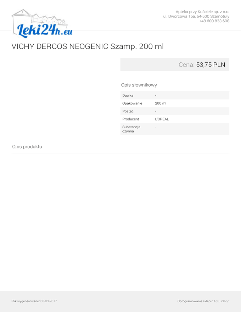 Apteka przy Kościele sp. z o.o. ul. Dworcowa 16a, 64-500 Szamotuły +48 600 823 608 VICHY DERCOS NEOGENIC Szamp. 200 ml Cena: 53,75 PLN Opis słownikowy Dawka - Opakowanie 200 ml Postać - Producent L'OREAL Substancja czynna - Opis produktu Plik wygenerowano: 08-03-2017 Powered by TCPDF (www.tcpdf.org) Oprogramowanie sklepu: AptusShop