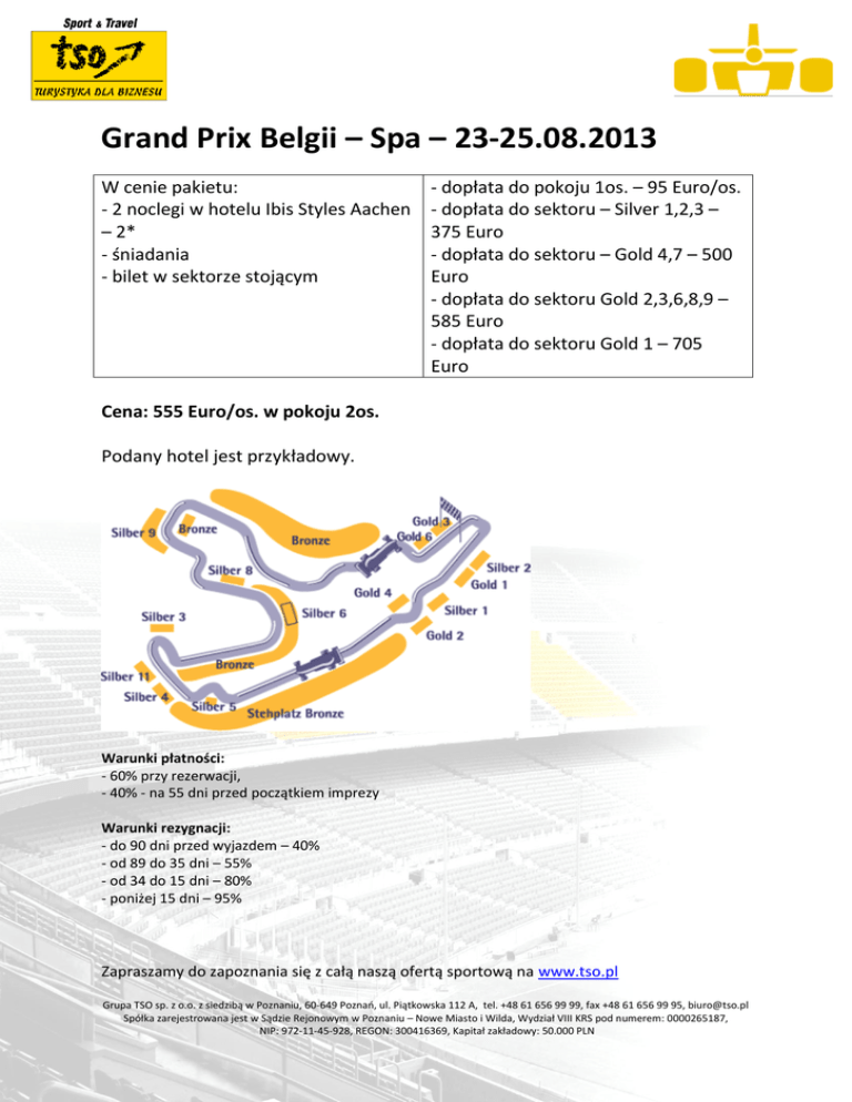 Grand Prix Belgii – Spa – 23-25.08.2013 W cenie pakietu: - 2 noclegi w hotelu Ibis Styles Aachen – 2* - śniadania - bilet w sektorze stojącym - dopłata do pokoju 1os. – 95 Euro/os. - dopłata do sektoru – Silver 1,2,3 – 375 Euro - dopłata do sektoru – Gold 4,7 – 500 Euro - dopłata do sektoru Gold 2,3,6,8,9 – 585 Euro - dopłata do sektoru Gold 1 – 705 Euro Cena: 555 Euro/os. w pokoju 2os. Podany hotel jest przykładowy. Warunki płatności: - 60% przy rezerwacji, - 40% - na 55 dni przed początkiem imprezy Warunki rezygnacji: - do 90 dni przed wyjazdem – 40% - od 89 do 35 dni – 55% - od 34 do 15 dni – 80% - poniżej 15 dni – 95% Zapraszamy do zapoznania się z całą naszą ofertą sportową na www.tso.pl Grupa TSO sp. z o.o. z siedzibą w Poznaniu, 60-649 Poznań, ul. Piątkowska 112 A, tel. +48 61 656 99 99, fax +48 61 656 99 95, [email protected] Spółka zarejestrowana jest w Sądzie Rejonowym w Poznaniu – Nowe Miasto i Wilda, Wydział VIII KRS pod numerem: 0000265187, NIP: 972-11-45-928, REGON: 300416369, Kapitał zakładowy: 50.000 PLN