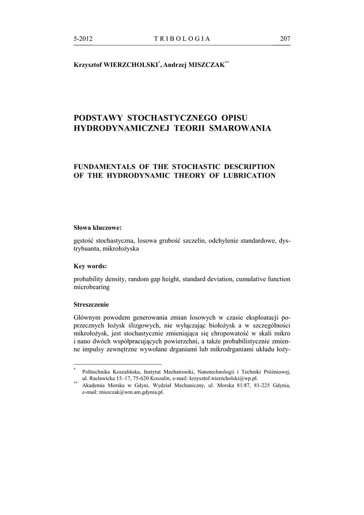 5-2012 TRIBOLOGIA 207 Krzysztof WIERZCHOLSKI*, Andrzej MISZCZAK** PODSTAWY STOCHASTYCZNEGO OPISU HYDRODYNAMICZNEJ TEORII SMAROWANIA FUNDAMENTALS OF THE STOCHASTIC DESCRIPTION OF THE HYDRODYNAMIC THEORY OF LUBRICATION Słowa kluczowe: gęstość stochastyczna, losowa grubość szczelin, odchylenie standardowe, dystrybuanta, mikrołożyska Key words: probability density, random gap height, standard deviation, cumulative function microbearing Streszczenie Głównym powodem generowania zmian losowych w czasie eksploatacji poprzecznych łożysk ślizgowych, nie wyłączając biołożysk a w szczególności mikrołożysk, jest stochastycznie zmieniająca się chropowatość w skali mikro i nano dwóch współpracujących powierzchni, a także probabilistycznie zmienne impulsy zewnętrzne wywołane drganiami lub mikrodrganiami układu łoży* ** Politechnika Koszalińska, Instytut Mechatroniki, Nanotechnologii i Techniki Próżniowej, ul. Racławicka 15–17, 75-620 Koszalin, e-mail: [email protected]. Akademia Morska w Gdyni, Wydział Mechaniczny, ul. Morska 81/87, 81-225 Gdynia, e-mail: [email protected]. 208 TRIBOLOGIA 5-2012 skowego oraz zewnętrznej jego obudowy. Oba wymienione czynniki powodują stochastyczną zmianę wysokości szczeliny łożyskowej w takim zakresie, że ma to wpływ na rozkłady prędkości czynnika smarującego, rozkłady ciśnienia hydrodynamicznego, wartości sił nośnych, wartości momentów tarcia, współczynniki tarcia oraz na końcowym etapie na zużycie. Celem badań w niniejszej pracy jest przedstawienie podstawowych zasad dotyczących wykorzystania metod stochastycznych przy rozwiązywaniu problemów hydrodynamicznej teorii smarowania poprzecznych łożysk ślizgowych z uwzględnieniem odchylenia standardowego. WPROWADZENIE Zmiany przestrzeni szczeliny łożyskowej w kierunku jej wysokości, powodowane są często przez drgania oraz nieustalone impulsy ruchowe [L. 1–6]. Nieustalony impuls, który zaczyna się na początku czasu objętego badaniem, zanika, gdy czas dąży do nieskończoności, a wtedy czop przyjmuje pozycję stacjonarną. Rozkłady prędkości cieczy oraz ciśnienia zależne są w znaczącym stopniu od czasu. Uwidocznione efekty stochastyczne występów chropowatości i ukształtowania falistości wywołane są przez losowe ścinanie trących się nierówności na powierzchniach białego metalu w łożyskach klasycznych, a także powodowane zwłóknieniami powierzchni chrząstki stawowej oraz stwardnieniem kości podchrzęstnej w biołożyskach. Bezwymiarowa wysokość szczeliny εT1 po kierunku osi y1 w układzie prostokątnym (x1,y1,z1) zależy od zmiennych x1, z1, położenia, a także od czasu t1 oraz składa się z dwóch części wskazanych poniższym wzorem [L. 5, 6]: εT1 = εT1s(x1,z1,t1) + δ1(x1,z1,ξ) (1) gdzie εT1s oznacza całkowitą bezwymiarową wysokość cienkiej warstwy cieczy z gładkimi współpracującymi powierzchniami. Ta część wysokości szczeliny zawiera bezwymiarowe korekty powodowane hiperelastycznymi deformacjami. Symbol δ1 oznacza bezwymiarową, losową część zmian wysokości szczeliny wywołanych drganiami, niestacjonarnym obciążeniem oraz występami chropowatości mierzonymi od umownego średniego poziomu. Symbol ξ opisuje zmienną losową, która charakteryzuje rozmieszczenie chropowatości. Tak więc opis rzeczywistych zmian wysokości szczeliny zależy od dokonujących się zmian nierówności powierzchni. Zmiany losowe nierówności współpracujących powierzchni są opisane funkcją gęstości prawdopodobieństwa na podstawie porównań pomiędzy rezultatami uzyskanymi na drodze eksperymentu autorów [L. 5, 6], a także badań doświadczalnych D. Dowsona oraz V.C. Mowa w zakresie biołożysk [L. 1]. 5-2012 TRIBOLOGIA 209 Funkcję, która każdej wartości zmiennej losowej przyporządkowuje pewne prawdopodobieństwa, nazywamy funkcją gęstości prawdopodobieństwa zmiennej losowej. Z racji wyboru skończonej ilości n punktów pomiarowych w obszarze smarowania z zakresu wartości δ1 oraz przyporządkowania im określonych prawdopodobieństw mamy do czynienia z dyskretnym rozkładem funkcji f(δ1k) gęstości prawdopodobieństwa dla k = 1, 2, …, n pokazanym na Rys. 1a dla n = 6. b) a) Rys. 1. Dyskretne wartości: a) funkcji gęstości prawdopodobieństwa, b) dystrybuanty Fig. 1. Discrete values: a) of density probability function, b) of cumulative values of function shown in a) Rys. 1b pokazuje dystrybuantę dyskretną, czyli funkcję kumulacji prawdopodobieństw dyskretnych pokazanych na Rys. 1a. W przypadku dużej ilości punktów pomiarowych [L. 7], funkcję gęstości możemy przedstawić jako funkcję ciągłą f(δ1) pokazaną na Rys. 2. Rys. 3 przedstawia dystrybuantę ciągłą dla rozkładu gęstości pokazanego na Rys. 2. Wartości dodatnie δ1 przedstawiają losowe bezwymiarowe wzrosty wysokości szczeliny, natomiast wartości ujemne to losowe zmniejszanie się wysokości szczeliny. Symetryczny rozkład wartości funkcji gęstości prawdopodobieństwa pokazanych na Rys. 2 względem dodatnich i ujemnych wartości bezwymiarowych zmian δ1 wysokości szczeliny wskazuje, że prawdopodobieństwa średnich spadków i wzrostów wysokości są jednakowe. Nie każdy zbiór wartości pomiarowych prawdopodobieństw oraz nie każda funkcja ciągła może być funkcją gęstości prawdopodobieństwa. W każdym z tych przypadków żadna z rzędnych funkcji gęstości prawdopodobieństwa nie może przekroczyć wartości 1, bo taka jest największa wartość prawdopodobieństwa oraz jednocześnie w obu przypadkach dystrybuanta Fk, Fx musi dążyć do jedności, gdy k dąży do n lub x dąży do nieskończoności. Własność rozkładów stochastycznych prezentują następujące wzory [L. 7]: Fk = k<n n ∑f (δ ), F = ∑f (δ ) = 1, F 1k k =1 n 1k k =1 x x<∞ = ∞ ∫ f (δ )dδ , F = ∫ f (δ )dδ 1 −∞ 1 ∞ 1 −∞ 1 = 1 (2) 210 TRIBOLOGIA 5-2012 Rys. 2. Ciągłe wartości bezwymiaro