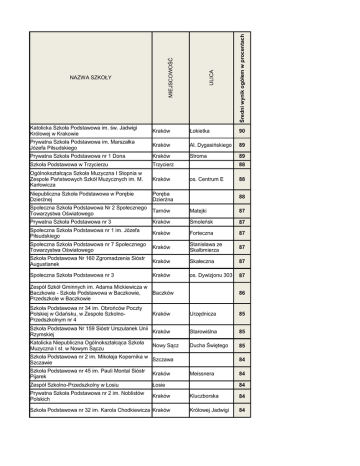 Średni wynik ogółem w procentach ULICA MIEJSCOWOŚĆ NAZWA SZKOŁY Katolicka Szkoła Podstawowa im. św. Jadwigi Królowej w Krakowie Kraków Łokietka 90 Prywatna Szkoła Podstawowa im. Marszałka Józefa Piłsudskiego Kraków Al. Dygasińskiego 89 Prywatna Szkoła Podstawowa nr 1 Dona Kraków Stroma 89 Szkoła Podstawowa w Trzycierzu Trzycierz Ogólnokształcąca Szkoła Muzyczna I Stopnia w Zespole Państwowych Szkół Muzycznych im. M. Karłowicza Kraków Niepubliczna Szkoła Podstawowa w Porębie Dzierżnej Poręba Dzierżna Społeczna Szkoła Podstawowa Nr 2 Społecznego Towarzystwa Oświatowego Tarnów Matejki 87 Prywatna Szkoła Podstawowa nr 3 Kraków Smoleńsk 87 Społeczna Szkoła Podstawowa nr 1 im. Józefa Piłsudskiego Kraków Forteczna 87 Społeczna Szkoła Podstawowa nr 7 Społecznego Towarzystwa Oświatowego Kraków Stanisława ze Skalbmierza 87 Szkoła Podstawowa Nr 160 Zgromadzenia Sióstr Augustianek Kraków Skałeczna 87 Społeczna Szkoła Podstawowa nr 3 Kraków os. Dywizjonu 303 87 88 os. Centrum E 88 Zespół Szkół Gminnych im. Adama Mickiewicza w Baczkowie - Szkoła Podstawowa w Baczkowie, Baczków Przedszkole w Baczkowie Szkoła Podstawowa nr 34 im. Obrońców Poczty Polskiej w Gdańsku, w Zespole SzkolnoPrzedszkolnym nr 4 88 86 Kraków Urzędnicza 85 Szkoła Podstawowa Nr 159 Sióstr Urszulanek Unii Kraków Rzymskiej Starowiślna 85 Katolicka Niepubliczna Ogólnokształcąca Szkoła Muzyczna I st. w Nowym Sączu Ducha Świętego 85 Nowy Sącz Szkoła Podstawowa nr 2 im. Mikołaja Kopernika w Szczawa Szczawie Szkoła Podstawowa nr 45 im. Pauli Montal Sióstr Pijarek Kraków Zespół Szkolno-Przedszkolny w Łosiu Łosie Prywatna Szkoła Podstawowa nr 2 im. Noblistów Polskich Kraków Szkoła Podstawowa nr 32 im. Karola Chodkiewicza Kraków 84 Meissnera 84 84 Kluczborska 84 Królowej Jadwigi 84 Społeczna Szkoła Podstawowa Nr 4 im. Juliusza Słowackiego Społecznego Towarzystwa Oświatowego Kraków Szkoła Podstawowa w Zawadzie Zawada Prywatna Szkoła Podstawowa Salwator Kraków Senatorska 83 Szkoła Podstawowa Nr 31 w Krakowie im. dra Henryka Jordana Kraków Bolesława Prusa 83 Prywatna Szkoła Podstawowa Academos im. Edmunda Niziurskiego Kraków Karmelicka 83 Katolicka Szkoła Podstawowa im. Świętej Rodziny Kraków z Nazaretu Pędzichów 83 Szkoła Podstawowa im. Janusza Korczaka w Biertowicach Krowoderska 83 83 Biertowice 83 Szkoła Podstawowa im. kapitana pilota Władysława Żurada III Gnysia w Żuradzie 83 Szkoła Podstawowa im. Piotra Michałowskiego TSSP Kraków P. Michałowskiego 82 Publiczna Szkoła Podstawowa Sióstr Salezjanek im. Bł. Laury Vicuna Kraków os. Kościuszkowskie 82 Fr. Nullo 82 Szkoła Podstawowa nr 38 im. Bractwa Kurkowego Kraków w Krakowie Zespół Szkół w Librantowej - Szkoła Podstawowa im. Józefa Bieńka Librantowa 82 Zespół Szkolno - Przedszkolny, Publiczna Szkoła Podstawowa w Biesiadkach Biesiadki 82 Szkoła Podstawowa im. Marii Konopnickiej w Roztoce Roztoka 82 Szkoła Podstawowa nr 26 im. Andrzeja Struga w Krakowie Kraków Ignacego Krasickiego 81 Ogólnokształcąca Szkoła Muzyczna I st. im. I. J. Paderewskiego Kraków Basztowa 81 Szkoła Podstawowa im. Komisji Edukacji Narodowej w Zagórzanach Zagórzany Szkoła Podstawowa nr 4 Kraków Smoleńsk 81 Szkoła Podstawowa Nr 65 im. Czesława Janczarskiego Kraków Golikówka 81 Szkoła Podstawowa nr 114 im. Arkadego Fiedlera Kraków Łąkowa 81 Publiczna Szkoła Podstawowa im. Św. Wincentego Pallottiego w Krakowie przy Zespole Szkół Kraków Pallotyńskich os. Krakowiaków 81 Szkoła Podstawowa nr 62 im. kmdra por. Franciszka Dąbrowskiego Ćwikłowa 81 Kraków 81 Publiczna Szkoła Podstawowa im. M. Kopernika w Grabie Grabiu 81 Szkoła Podstawowa z Oddziałami Integracyjnymi w Szczytniki Szczytnikach 81 Szkoła Podstawowa im. Antoniego Kucharczyka Paszkówka 80 Szkoła Podstawowa im. T. Kościuszki w Chechle Chechło Kluczewska 80 Szkoła Podstawowa Nr 40 Kraków Pszczelna 80 Szkoła Podstawowa nr 95 w Krakowie Kraków Wileńska 80 Szkoła Podstawowa im. Jana Kochanowskiego Bęczarka 80 Szkoła Podstawowa im. św. Jadwigi Królowej w Białym Kościele Biały Kościół Szkoła Podstawowa im. Marii Konopnickiej w Wielkiej Wsi Wielka Wieś Prywatna Szkoła Podstawowa "Scherzo" Kraków Szkoła Podstawowa w Zespole Szkół im. Wincentego Witosa w Zadrożu Zadroże Szkoła Podstawowa nr 55 im. Jarosława Iwaszkiewicza Kraków Dobczycka 79 Szkoła Podstawowa nr 93 im. Lucjana Rydla w Krakowie Kraków Szlachtowskiego 79 Społeczna Szkoła Podstawowa nr 5 Kraków Kurczaba 79 Szkoła Podstawowa im. ks. Stanisława Konarskiego w Wielkiej Wsi Wielka Wieś Szkolna 79 Katolicka Szkoła Podstawowa Montessori Kraków Pawlickiego 79 Szkoła Podstawowa Nr 72 im. Teofila Lenartowicza Kraków Modrzewiowa 79 Szkoła Podstawowa nr 138 im. Polskich Wojsk Lotniczych Kraków Kazimierza Wierzyńskiego 79 Szkoła Podstawowa im. Stanisława Staszica w Dursztynie Dursztyn Pienińska 79 Szkoła Podstawowa w Rzepienniku Marciszewskim Rzepiennik Marciszewski 79 Szkoła Podstawowa w Morawczynie Morawczyna 78 Szkoła Podstawowa im. Janusza Korczaka w Wilczycach Wilczyce 78 Szkoła Podstawowa Nr 51 im. Stanisława Wyspiańskiego Kraków Szkoła Podstawowa im. gen. Władysława Sikorskiego w Zespole Szkół w Ropicy Polskiej Ropica Polska 78 Szkoła Podstawowa im. Jana Kochanowskiego w Świdniku Świdnik 78 Szkoła Podstawowa w Bańskiej Wyżnej Bańska Wyżna Szlak Papieski 78 Zespół Szkół Gminnych im. Mikołaja Kopernika w Dąbrowicy. Szkoła Podstawowa Dąbrowica 78 Szkoła Podstawowa im. Tadeusza Kościuszki w Zawadce Zawadka 78 Szkoła Podstawowa w Januszowej Januszowa 78 Królowej Jadwigi 80 80 Korzeniaka 80 80 Stawowa Szkoła Podstawowa im. Kornela Makuszyńskiego w Gorzków Gorzkowie 78 78 Szkoła Podstawowa im. ks. Stefana kard. Wyszyńskiego KSW w Libiążu Libiąż Szkoła Podstawowa im. Mikołaja Kopernika w Kościelcu Kościelec Szkoła Podstawowa nr 36 im. Henryka Sienkiewicza Krak