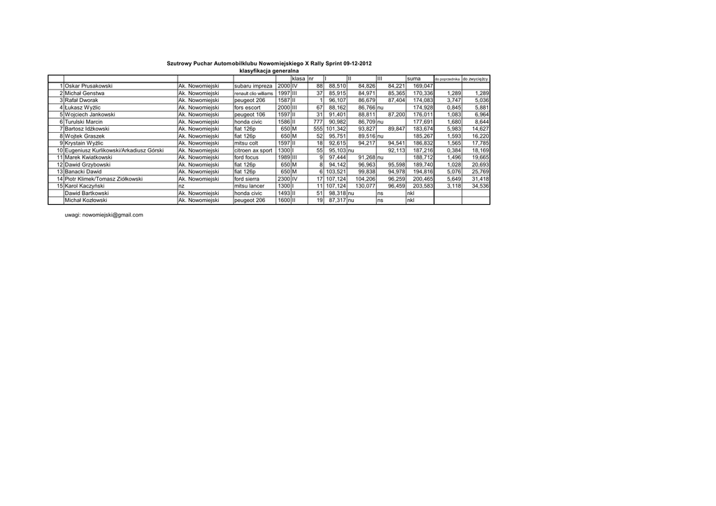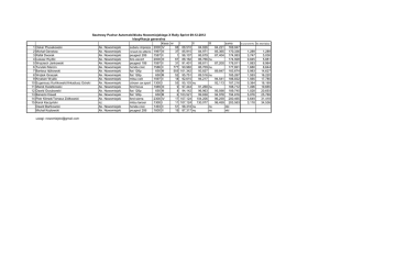1 2 3 4 5 6 7 8 9 10 11 12 13 14 15 Szutrowy Puchar Automobilklubu Nowomiejskiego X Rally Sprint 09-12-2012 klasyfikacja generalna klasa nr I II Oskar Prusakowski Ak. Nowomiejski subaru impreza 2000 IV 88 88,510 84,826 Michał Genstwa Ak. Nowomiejski renault clio williams 1997 III 37 85,915 84,971 Rafał Dworak Ak. Nowomiejski peugeot 206 1587 II 1 96,107 86,679 Łukasz WyŜlic Ak. Nowomiejski fors escort 2000 III 67 88,162 86,766 Wojciech Jankowski Ak. Nowomiejski peugeot 106 1597 II 31 91,401 88,811 Turulski Marcin Ak. Nowomiejski honda civic 1586 II 777 90,982 86,709 Bartosz Idźkowski Ak. Nowomiejski fiat 126p 650 M 555 101,342 93,827 Wojtek Graszek Ak. Nowomiejski fiat 126p 650 M 52 95,751 89,516 Krystain WyŜlic Ak. Nowomiejski mitsu colt 1597 II 18 92,615 94,217 Eugeniusz Kurlikowski/Arkadiusz Górski Ak. Nowomiejski citroen ax sport 1300 I 55 95,103 nu Marek Kwiatkowski Ak. Nowomiejski ford focus 1989 III 9 97,444 91,268 Dawid Grzybowski Ak. Nowomiejski fiat 126p 650 M 8 94,142 96,963 Banacki Dawid Ak. Nowomiejski fiat 126p 650 M 6 103,521 99,838 Piotr Klimek/Tomasz Ziółkowski Ak. Nowomiejski ford sierra 2300 IV 17 107,124 104,206 Karol Kaczyński nz mitsu lancer 1300 I 11 107,124 130,077 Dawid Bartkowski Ak. Nowomiejski honda civic 1493 II 51 98,318 nu Michał Kozłowski Ak. Nowomiejski peugeot 206 1600 II 19 87,317 nu uwagi: [email protected] III 84,221 85,365 87,404 nu 87,200 nu 89,847 nu 94,541 92,113 nu 95,598 94,978 96,259 96,459 ns ns suma 169,047 170,336 174,083 174,928 176,011 177,691 183,674 185,267 186,832 187,216 188,712 189,740 194,816 200,465 203,583 nkl nkl do poprzednika do zwycięŜcy 1,289 3,747 0,845 1,083 1,680 5,983 1,593 1,565 0,384 1,496 1,028 5,076 5,649 3,118 1,289 5,036 5,881 6,964 8,644 14,627 16,220 17,785 18,169 19,665 20,693 25,769 31,418 34,536