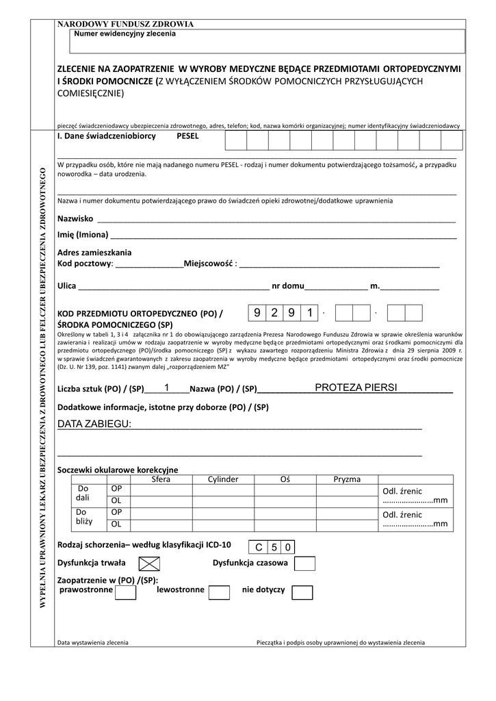 NARODOWY FUNDUSZ ZDROWIA Numer ewidencyjny zlecenia ZLECENIE NA ZAOPATRZENIE W WYROBY MEDYCZNE BĘDĄCE PRZEDMIOTAMI ORTOPEDYCZNYMI I ŚRODKI POMOCNICZE (Z WYŁĄCZENIEM ŚRODKÓW POMOCNICZYCH PRZYSŁUGUJĄCYCH COMIESIĘCZNIE) pieczęć świadczeniodawcy ubezpieczenia zdrowotnego, adres, telefon; kod, nazwa komórki organizacyjnej; numer identyfikacyjny świadczeniodawcy WYPEŁNIA UPRAWNIONY LEKARZ UBEZPIECZENIA Z DROWOTNEGO LUB FELCZER UBEZPIECZENIA ZDROWOTNEGO I. Dane świadczeniobiorcy PESEL ___________________________________________________________________________________________________________ W przypadku osób, które nie mają nadanego numeru PESEL ‐ rodzaj i numer dokumentu potwierdzającego tożsamość, a przypadku noworodka – data urodzenia. ___________________________________________________________________________________________________________ Nazwa i numer dokumentu potwierdzającego prawo do świadczeń opieki zdrowotnej/dodatkowe uprawnienia Nazwisko ________________________________________________________________________________________________ Imię (Imiona) ____________________________________________________________________________ Adres zamieszkania Kod pocztowy: _______________Miejscowość : ____________________________________________ Ulica __________________________________________ nr domu______________ m._____________ KOD PRZEDMIOTU ORTOPEDYCZNEO (PO) / ŚRODKA POMOCNICZEGO (SP) 9 2 9 1 . . Określony w tabeli 1, 3 i 4 załącznika nr 1 do obowiązującego zarządzenia Prezesa Narodowego Funduszu Zdrowia w sprawie określenia warunków zawierania i realizacji umów w rodzaju zaopatrzenie w wyroby medyczne będą ce przedmiotami ortopedycznymi oraz ś rodkami pomocniczymi dla przedmiotu ortopedycznego (PO)/środka pomocniczego (SP) z wykazu zawartego rozporządzeniu Ministra Zdrowia z dnia 29 sierpnia 2009 r. w sprawie świadczeń gwarantowanych z zakresu zaopatrzenia w wyroby medyczne będące przedmiotami ortopedycznymi oraz środki pomocnicze (Dz. U. Nr 139, poz. 1141) zwanym dalej „rozporządzeniem MZ” PROTEZA PIERSI 1 Liczba sztuk (PO) / (SP)__________Nazwa (PO) / (SP)___________________________________________ Dodatkowe informacje, istotne przy doborze (PO) / (SP) DATA ZABIEGU: ________________________________________________________________________________ ________________________________________________________________________________ Soczewki okularowe korekcyjne Sfera Do OP dali OL Do OP bliży OL Cylinder Zaopatrzenie w (PO) /(SP): prawostronne lewostronne Data wystawienia zlecenia Pryzma Odl. źrenic ……………………mm Odl. źrenic ……………………mm Rodzaj schorzenia– według klasyfikacji ICD‐10 Dysfunkcja trwała Oś C 5 0 Dysfunkcja czasowa nie dotyczy Pieczątka i podpis osoby uprawnionej do wystawienia zlecenia II. POTWIERDZENIE PRAWA DO PEŁNEJ LUB CZĘŚCIOWEJ REFUNDACJI (PO) / (SP) Kod tytułu uprawnienia _____________________________________ WYPEŁ NIA PRACOWNIK NFZ Kod tytułu uprawnienia dodatkowego ____________________________ Nazwa Oddziału Funduszu________________________________________ Nr Oddziału Funduszu:____________________ KOD (PO)/(SP) . . . . Limit cenowy ________________________________ Refundacja NFZ w % _________________________________________ Przyczyna odmowy potwierdzenia prawa do refundacji_________________________________________________________ _______________________________________________________________________________________________________ Data potwierdzenia zlecenia _____________________ Data ważności zlecenia _____________________________________ _____________________________________________________ Podpis i pieczątka pracownika NFZ III. POTWIERDZENIE WYDANIA (PO) / (SP) ________________________________ ____________________________ WYPEŁ NIA OSOBA REALIZUJĄCA ŚWIADCZENIE ORAZ OSOBA ODBIERAJĄCA Pieczątka świadczeniodawcy Numer umowy ________________________________ Pieczątka podwykonawcy _____________________________________________________ Data przyjęcia do realizacji Liczba sztuk (PO) / (SP) _______________Dane dotyczące (PO) / (SP) (producent, model, nazwa handlowa) ______________ ______________________________________________________________________________________________________ Całkowita kwota refundacji NFZ *_________________ Całkowita kwota zapłacona przez świadczeniobiorcę* _______________________________________ *Jeżeli cena nabycia (PO) / (SP) jest niższa niż limit ceny, określony w rozporządzeniu MZ, NFZ należy obciążyć kwotą stanowiącą 100 % ceny nabycia w przypadku refundacji pełnej lub kwotą stanowiącą 50 %, 70 % ceny nabycia w przypadku refundacji częściowej. Świadczeniobiorca przypadku refundacji pełnej otrzymuje (PO) / (SP) bezpłatnie, a w przypadku refundacji częściowej pokrywa 50%, 30 % ceny nabycia (PO) / (SP). ‐Jeżeli cena nabycia (PO) / (SP) jest równa limitowi ceny, określonemu w rozporządzeniu MZ, NFZ należy obciążyć kwotą stanowiącą 100 % limitu ceny w przypadku refundacji pełnej lub kwotą stanowiącą 50 %, 70 % limitu ceny w przypadku refundacji częściowej. Świadczeniobiorca przypadku refundacji pełnej otrzymuje (PO) / (SP) bezpłatnie, a w przypadku refundacji częściowej pokrywa 50%, 30 % limitu ceny. ‐Jeżeli cena nabycia (PO) / (SP) jest wyższa niż limit ceny określony w rozporządzeniu MZ, NFZ należy obciążyć kwotą stanowiącą 100 % limitu ceny w przypadku refundacji pełnej lub kwotą stanowiącą 50%, 70 % limitu ceny w przypadku refundacji częściowej ceny. Świadczeniobiorca, w przypadku refundacji pełnej, pokrywa kwotę ponad limit ceny a w przypadku refundacji częściowej 50 %, 30 % limitu ceny oraz kwotę ponad limit. POTWIERDZAM WYDANIE ZGODNIE ZE ZLECENIEM PRAWIDŁOWO WYKONANEGO (PO) / (SP) _________________________________________________ Data, pieczątka i podpis osoby realizującej świadczenie IV. POTWIERDZENIE ODBIORU (PO)/(SP) – WYPEŁNIA OSOBA ODBIERAJĄCA