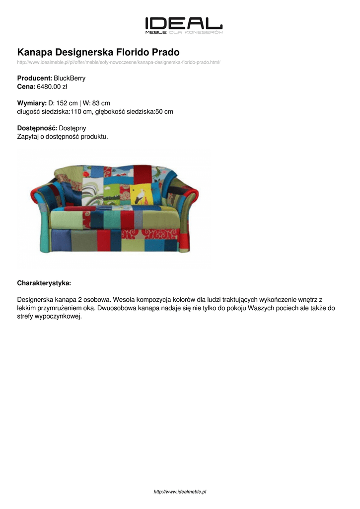 Kanapa Designerska Florido Prado http://www.idealmeble.pl/pl/offer/meble/sofy-nowoczesne/kanapa-designerska-florido-prado.html/ Producent: BluckBerry Cena: 6480.00 zł Wymiary: D: 152 cm | W: 83 cm długość siedziska:110 cm, głębokość siedziska:50 cm Dostępność: Dostępny Zapytaj o dostępność produktu. Charakterystyka: Designerska kanapa 2 osobowa. Wesoła kompozycja kolorów dla ludzi traktujących wykończenie wnętrz z lekkim przymrużeniem oka. Dwuosobowa kanapa nadaje się nie tylko do pokoju Waszych pociech ale także do strefy wypoczynkowej. http://www.idealmeble.pl http://www.idealmeble.pl Zdjęcia produktu: http://www.idealmeble.pl Powered by TCPDF (www.tcpdf.org)