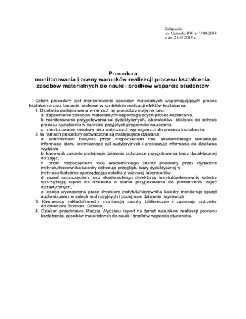 Załącznik do Uchwały RW nr V/09/2015 z dn. 21.05.2015 r. Procedura monitorowania i oceny warunków realizacji procesu kształcenia, zasobów materialnych do nauki i środków wsparcia studentów Celem procedury jest monitorowanie zasobów materialnych wspomagających proces kształcenia oraz badania naukowe w kontekście realizacji efektów kształcenia. 1. Działania podejmowana w ramach tej procedury mają na celu: a. zapewnienie zasobów materialnych wspomagających proces kształcenia, b. monitorowanie przygotowania sal dydaktycznych, laboratoriów i biblioteki do potrzeb procesu kształcenia w zakresie przyjętych programów nauczania, c. monitorowanie zasobów informatycznych wymaganych do procesu kształcenia. 2. W ramach procedury prowadzone są następujące działania: a. administrator budynku przed rozpoczęciem roku akademickiego aktualizuje informacje stanu technicznego sal audytoryjnych i przekazuje informacje do dziekana wydziału, b. kierownik zakładu podejmuje działania dotyczące przygotowania bazy dydaktycznej do zajęć, c. przed rozpoczęciem roku akademickiego zespół powołany przez dyrektora instytutu/kierownika katedry dokonuje przeglądu bazy dydaktycznej w instytucie/katedrze sporządzając notatkę z wizytacji laboratoriów d. przed rozpoczęciem roku akademickiego dyrektorzy instytutów/kierownik katedry sporządzają raport do dziekana o stanie przygotowania do prowadzenia zajęć dydaktycznych, e. osoba wyznaczona przez dyrektora instytutu/kierownika katedry monitoruje sprzęt audiowizualny w salach audytoryjnych i podejmuje działania naprawcze 3. Kierownicy zakładu/katedry monitorują zasoby biblioteczne i zgłaszają potrzeby do dyrektora Biblioteki Głównej. 4. Dziekan przedstawia Radzie Wydziału raport na temat warunków realizacji procesu kształcenia, zasobów materialnych do nauki i środków wsparcia studentów.
