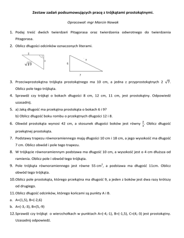 Zestaw zadao podsumowujących pracę z trójkątami prostokątnymi. Opracował: mgr Marcin Nowak 1. Podaj treśd dwóch twierdzeo Pitagorasa oraz twierdzenia odwrotnego do twierdzenia Pitagorasa. 2. Oblicz długości odcinków oznaczonych literami. 3. Przeciwprostokątna trójkąta prostokątnego ma 10 cm, a jedna z przyprostokątnych 2 . Oblicz pole tego trójkąta. 4. Sprawdź czy trójkąt o bokach długości 8 cm, 12 cm, 11 cm, jest prostokątny. Odpowiedź uzasadnij. 5. a) Jaką długośd ma przekątna prostokąta o bokach 6 i 9? b) Oblicz długośd boku rombu o przekątnych długości 12 i 8. 6. Obwód prostokąta wynosi 42 cm, a stosunek długości boków jest równy . Oblicz długośd przekątnej prostokąta. 7. Podstawy trapezu równoramiennego mają długości 10 cm i 18 cm, a jego wysokośd ma długośd 7 cm. Oblicz obwód i pole tego trapezu. 8. W trójkącie równoramiennym podstawa ma długośd 10 cm, a wysokośd jest o 4 cm dłuższa od ramienia. Oblicz pole i obwód tego trójkąta. 9. Pole trójkąta równoramiennego jest równe 55 cm2, a podstawa ma długośd 11cm. Oblicz obwód tego trójkąta. 10.Oblicz pole prostokąta, którego przekątna ma długośd 9, a jeden z boków jest dwa razy krótszy od drugiego. 11.Oblicz długośd odcinków, którego koocami są punkty A i B. a. A=(1,5), B=(-2,6) b. A=(-3,-3), B=(5,-9) 12.Sprawdź czy trójkąt o wierzchołkach w punktach A=(-4,-1), B=(-1,5), C=(4,-3) jest prostokątny. Uzasadnij odpowiedź. 13. Oblicz odległośd punktu E od odcinka AB, wiedząc, że trójkąty ABS, DCE, DSC są równoboczne oraz lABl = 6m i lDCl = 4m. 14.Oblicz wysokośd i pole trójkąta równobocznego o boku 6 cm. 15.Oblicz długośd boku trójkąta równobocznego o wysokości 6. 16. Oblicz długośd boku oraz wysokośd trójkąta równobocznego o polu . 17.Krótsza podstawa trapezu równoramiennego ma długośd 8 cm. Ramię ma długośd 7 cm i jest nachylone do podstawy pod kątem 30o. Oblicz pole i obwód tego trapezu. 18.Oblicz obwody i pola narysowanych trójkątów: 19.Przekątna kwadratu jest o 3 cm dłuższa od jego boku. Oblicz pole tego kwadratu. 20.Wewnątrz kwadratowego pokoju o boku długości 8m leży aromatyczny czekoladowy cukierek odległy od dwóch sąsiednich narożników tego pokoju o 5m. Oblicz odległośd tego cukierka od dwóch pozostałych narożników pokoju.