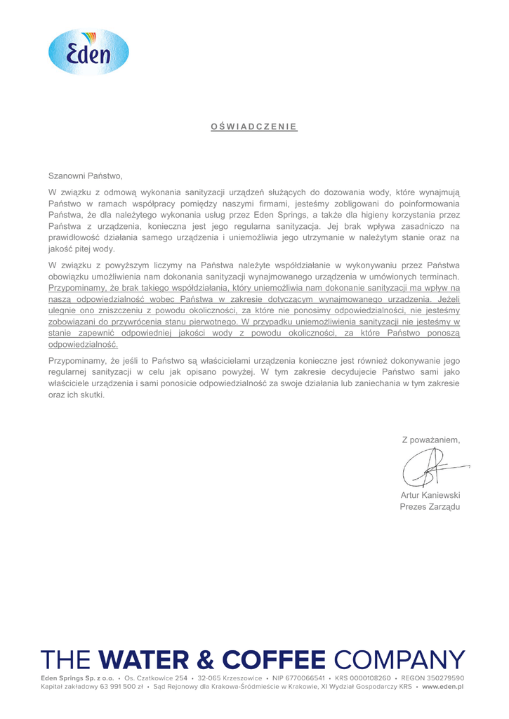 OŚWIADCZENIE Szanowni Państwo, W związku z odmową wykonania sanityzacji urządzeń służących do dozowania wody, które wynajmują Państwo w ramach współpracy pomiędzy naszymi firmami, jesteśmy zobligowani do poinformowania Państwa, że dla należytego wykonania usług przez Eden Springs, a także dla higieny korzystania przez Państwa z urządzenia, konieczna jest jego regularna sanityzacja. Jej brak wpływa zasadniczo na prawidłowość działania samego urządzenia i uniemożliwia jego utrzymanie w należytym stanie oraz na jakość pitej wody. W związku z powyższym liczymy na Państwa należyte współdziałanie w wykonywaniu przez Państwa obowiązku umożliwienia nam dokonania sanityzacji wynajmowanego urządzenia w umówionych terminach. Przypominamy, że brak takiego współdziałania, który uniemożliwia nam dokonanie sanityzacji ma wpływ na naszą odpowiedzialność wobec Państwa w zakresie dotyczącym wynajmowanego urządzenia. Jeżeli ulegnie ono zniszczeniu z powodu okoliczności, za które nie ponosimy odpowiedzialności, nie jesteśmy zobowiązani do przywrócenia stanu pierwotnego. W przypadku uniemożliwienia sanityzacji nie jesteśmy w stanie zapewnić odpowiedniej jakości wody z powodu okoliczności, za które Państwo ponoszą odpowiedzialność. Przypominamy, że jeśli to Państwo są właścicielami urządzenia konieczne jest również dokonywanie jego regularnej sanityzacji w celu jak opisano powyżej. W tym zakresie decydujecie Państwo sami jako właściciele urządzenia i sami ponosicie odpowiedzialność za swoje działania lub zaniechania w tym zakresie oraz ich skutki. Z poważaniem, Artur Kaniewski Prezes Zarządu