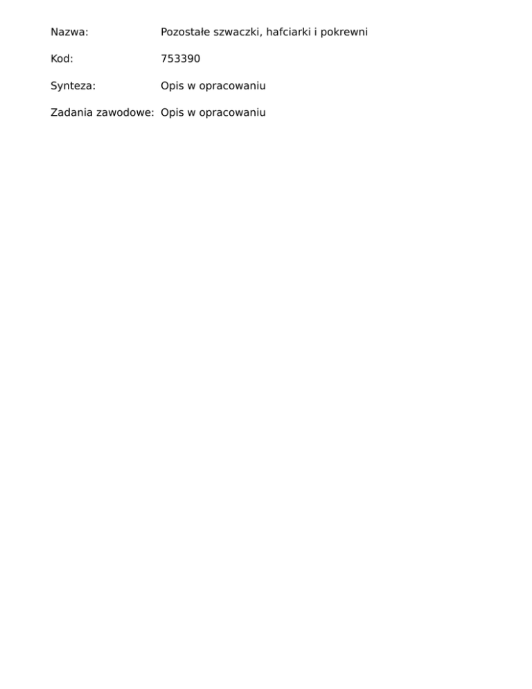 Nazwa: Pozostałe szwaczki, hafciarki i pokrewni Kod: 753390 Synteza: Opis w opracowaniu Zadania zawodowe: Opis w opracowaniu
