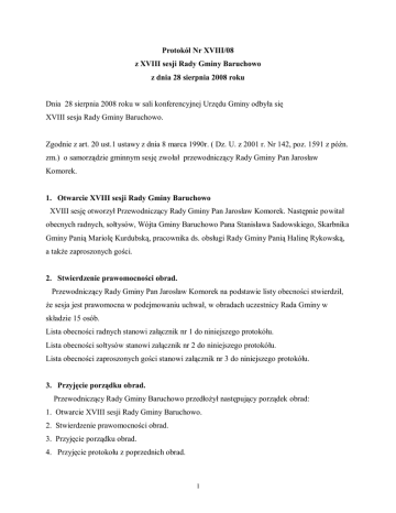 Protokół Nr XVIII/08 z XVIII sesji Rady Gminy Baruchowo z dnia 28 sierpnia 2008 roku Dnia 28 sierpnia 2008 roku w sali konferencyjnej Urzędu Gminy odbyła się XVIII sesja Rady Gminy Baruchowo. Zgodnie z art. 20 ust.1 ustawy z dnia 8 marca 1990r. ( Dz. U. z 2001 r. Nr 142, poz. 1591 z późn. zm.) o samorządzie gminnym sesję zwołał przewodniczący Rady Gminy Pan Jarosław Komorek. 1. Otwarcie XVIII sesji Rady Gminy Baruchowo XVIII sesję otworzył Przewodniczący Rady Gminy Pan Jarosław Komorek. Następnie powitał obecnych radnych, sołtysów, Wójta Gminy Baruchowo Pana Stanisława Sadowskiego, Skarbnika Gminy Panią Mariolę Kurdubską, pracownika ds. obsługi Rady Gminy Panią Halinę Rykowską, a także zaproszonych gości. 2. Stwierdzenie prawomocności obrad. Przewodniczący Rady Gminy Pan Jarosław Komorek na podstawie listy obecności stwierdził, że sesja jest prawomocna w podejmowaniu uchwał, w obradach uczestnicy Rada Gminy w składzie 15 osób. Lista obecności radnych stanowi załącznik nr 1 do niniejszego protokółu. Lista obecności sołtysów stanowi załącznik nr 2 do niniejszego protokółu. Lista obecności zaproszonych gości stanowi załącznik nr 3 do niniejszego protokółu. 3. Przyjęcie porządku obrad. Przewodniczący Rady Gminy Baruchowo przedłożył następujący porządek obrad: 1. Otwarcie XVIII sesji Rady Gminy Baruchowo. 2. Stwierdzenie prawomocności obrad. 3. Przyjęcie porządku obrad. 4. Przyjęcie protokołu z poprzednich obrad. 1 5. Sprawozdanie Wójta Gminy z wykonania budżetu gminy Baruchowo za pierwsze półrocze 2008 roku. 6. Sprawozdanie z wykonania budżetu Samodzielnego Publicznego Zakładu Opieki Zdrowotnej Kłótno za okres od 01.01.2008 r. do 30.06.2008 r. 7. Rozpatrzenie projektu Uchwały nr XVIII/125/08 w sprawie zmian w budżecie gminy na 2008 r. 8. Rozpatrzenie projektu Uchwały nr XVIII/126/08 w sprawie rozszerzenia działalności Gminnego Ośrodka Kultury w Baruchowie i zmiany statutu Gminnego Ośrodka Kultury. 9. Rozpatrzenie projektu Uchwały nr XVIII/127/08 w sprawie zaciągnięcia długoterminowego zobowiązania w zakresie podejmowania inwestycji przekraczających granicę ustaloną przez Radę Gminy Baruchowo. 10. Składanie interpelacji. 11. Wolne wnioski i zapytania. 12. Odpowiedzi na interpelacje składane na poprzedniej sesji. 13. Zakończenie obrad. Do pkt.4. Przyjęcie protokołu z poprzednich obrad. Protokół z poprzednich obrad przyjęty został jednogłośnie. Do pkt.5. 2 Pan Wójt Stanisław Sadowski przedstawił sprawozdanie z wykonania budżetu Gminy Baruchowo za pierwsze półrocze 2008r. Na chwilę obecną zakończono budowę drogi w miejscowości Grodno oraz Lubaty. Z Urzędu Marszałkowskiego z Funduszu Wsparcia otrzymaliśmy kwotę w wysokości 200.000 złotych w ramach dofinansowania budowy boiska do piłki nożne, natomiast 300.000,00 ma budowę hali sportowej. Budowa hali sportowej przebiega zgodnie z harmonogramem, od września będą zakładane okna. Nie ma jeszcze dokładnej daty otwarcia boiska wielofunkcyjnego „Orlik 2012”, ale najprawdopodobniej na otwarcie przyjedzie na ziemię kujawską wojewoda, Marszałek Województwa Kujawsko-Pomorskiego, minister sportu, przedstawiciele kancelarii premiera. Pojawia się jednak problem związany z brakiem ludzi chętnych do pracy, i z kosztami jakie ponosi urząd, jak chociażby usuwanie korzeni drzew znajdujących się na terenie budowanego boiska. Został złożony wniosek do Urzędu Marszałkowskiego Departamentu Wdrażania RPO w sprawie budowy drogi Kłótno – Kurowo. Rozstrzygnięcie nastąpi w tym roku. Jest to droga strategiczna łącząca dwie drogi ponad gminne, towarzyszy jednak temu przedsięwzięciu długa procedura. Sprawozdanie z wykonania budżetu gminy Baruchowo za pierwsze półrocze stanowi załącznik nr 4 do niniejszego protokółu. Radny Pan Rutkowski spytał się o kamień, który był przywieziony na budowane boisko. Pan Wójt wyjaśnił, że nieodpowiednia była frakcja kruszywa. Kruszywo to zostało zebrane i przeznaczone na bieżące utrzymanie dróg. Budowany kompleks sportowy w ramach programu „Moje Boisko –Orlik 2012” kosztować będzie 1.100.000,00 zł. Boisko wybudowane zostanie przy współudziale środków finansowych Ministra Sportu w wysokości 330.000,00 zł, Samorządu Województwa w wysokości 333.000,00 zł., a także Samorządu Gminy Baruchowo w wysokości 434.000,00 zł. Pan Wójt Stanisław Sadowski wspomniał o Zakładzie Gospodarki Komunalnej z siedzibą w Baruchowie, który cały czas podupada. Poinformował o zakupionym kombajnie z sieczkarnią z 1992 roku. Istnieje także propozycja, by zakupić nowy sprzęt. Do pkt .6. Sprawozdanie z wykonania budżetu Samodzielnego Publicznego Zakładu Opieki Zdrowotnej Kłótno za okres od.01.01.2008r. do 30.06.2008r. przedstawiła księgowa Pani Anna Wróblewska. Sytuacja ośrodka jest adekwatna do poprzedniego roku. Zarówno wydatki jak i 3 dochody przedstawiają się podobnie jak w ubiegłym roku. Budżet SP ZOZ Kłótno na 2008 rok zaplanowany został w ramach dochodów na kwotę 633,242 zł. Zaplanowane dochody uległy jednak zmianie, mianowicie zwiększono dochody o kwotę 5.216 zł. Otrzymane środki z Narodowego Funduszu Zdrowia to kwota 294.597 zł. Z zaplanowanych wydatków budżetowych na kwotę 638.458 zł, wydatkowano kwotę 327.225 zł., co stanowi 51% planu rocznego. W ramach wynagrodzeń wydatki zostały wykonane w 48%. W dziale delegacje służbowe wydatki zostały wykonane w 50%. W dziale opłaty badań i usług medycznych wydatki zostały zwiększone na badania dla pacjentów, bez których nie można diagnozować pacjenta, a zachorowalność wiosenna była bardzo wysoka. W ramach opłat i ubezpieczeń planowane wydatki zostały wykonane w 100% . Taki duży procent spowodowany jest tym, że ubezpieczenia i podatek od nieruchomości zostały uregulowane zgodnie z wytycznymi w całości w pierwszym półroczu 2008r. W dziale zwiększenia z