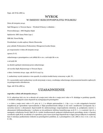 Sygn. akt II Ka 288/14 WYROK W IMIENIU RZECZYPOSPOLITEJ POLSKIEJ Dnia 28 sierpnia 2014r. Sąd Okręgowy w Nowym Sączu – Wydział II Karny w składzie : Przewodniczący : SSO Bogdan Kijak Sędziowie: SSO Anna Pater (spr.) SSR del. Paweł Kulig Protokolant: st.sekr.sądowy Maria Olszowska przy udziale Prokuratora Prokuratury Okręgowej Leszka Karpa po rozpoznaniu w dniu 28 sierpnia 2014r. sprawy D. K. oskarżonego o przestępstwa z art.286§1 kk w zw. z art.64§1 kk w zw. z art.91§1 kk na skutek apelacji wniesionej przez oskarżonego od wyroku Sądu Rejonowego w Nowym Sączu z dnia 1 kwietnia 2014r. sygn. akt II1 K 1247/13 I. zaskarżony wyrok zmienia w ten sposób, że uchyla środek karny orzeczony w pkt. IV, II. w pozostałej części zaskarżony wyrok utrzymuje w mocy, zwalniając oskarżonego od ponoszenia kosztów sądowych za postępowanie odwoławcze. Sygn. akt II Ka 288/14 UZASADNIENIE wyroku z dnia 28 sierpnia 2014 r. D. K. oskarżony był o to, że w okresie od 4 maja 2007 roku do 11 maja 2007 roku w N. działając w podobny sposób, w krótkich odstępach czasu dopuścił się następujących przestępstw: 1. w dniu 4 maja 2007 roku w N. przy ul. (...) w sklepie patronackim (...) Sp. z o.o. w celu osiągnięcia korzyści majątkowej po uprzednim wprowadzeniu w błąd przedstawiciela sklepu co do woli i możliwości wywiązania się z zawartej umowy o abonament doprowadził do niekorzystnego rozporządzenia mieniem, tj. podpisania umowy o abonament telekomunikacyjny i wydania na tej podstawie telefonu komórkowego m-ki N. (...) o wartości 750 zł, a następnie wyłudzenia kwoty 848,78 zł z tytułu zrealizowanych połączeń telefonicznych powodując straty w łącznej wysokości 1598,78 zł, na szkodę w/w operatora, przy czym czynu tego dopuścił się w ciągu 5 lat po odbyciu co najmniej kary 6 miesięcy pozbawienia wolności za przestępstwo podobne, tj. o przestępstwo z art. 286 § 1 k.k. w zw. z art. 64 § 1 kk, 2. w dniu 11 maja 2007 roku w N. przy ul. (...) w sklepie patronackim (...) Sp. z o.o. w celu osiągnięcia korzyści majątkowej po uprzednim wprowadzeniu w błąd przedstawiciela sklepu co do woli i możliwości wywiązania się z zawartej umowy o abonament doprowadził do niekorzystnego rozporządzenia mieniem, tj. podpisania umowy o abonament telekomunikacyjny i wydania na tej podstawie telefonu komórkowego m-ki S. (...) o wartości 750 zł, a następnie wyłudzenia kwoty 973,72 zł., z tytułu zrealizowanych połączeń telefonicznych powodując straty w łącznej wysokości 1723,72 zł., na szkodę ww. operatora, przy czym czynu tego dopuścił się w ciągu 5 lat po odbyciu co najmniej kary 6 miesięcy pozbawienia wolności za przestępstwo podobne, tj. o przestępstwo z art. 286 § 1 k.k. w zw. z art. 64 § 1 kk, tj. o przestępstwo z art. 286 § 1 kk w zw. z art. 64 § 1 kk w zw. art. 91 § 1 kk. Wyrokiem z dnia 1 kwietnia 2014 r., sygn. akt II 1 K 1247/13 Sąd Rejonowy w Nowym Sączu uznał oskarżonego D. K. za winnego popełnienia czynów zarzucanych mu aktem oskarżenia, stanowiących przestępstwa z art. 286 § 1 kk w zw. z art. 64 § 1 kk w zw. art. 91 § 1 kk i wymierzył oskarżonemu karę 1 roku i 6 miesięcy pozbawienia wolności z warunkowym zawieszeniem wykonanie tej kary na okres próby wynoszący 5 lat oraz oddał oskarżonego pod dozór kuratora sądowego, orzekł wobec oskarżonego karę grzywny w wysokości 30 stawek dziennych ustalając wysokość jednej stawki dziennej na kwotę 10 złotych, tj. karę grzywny w kwocie 300 złotych. Na mocy art. 46 § 1 kk Sąd Rejonowy orzekł wobec oskarżonego środek karny w postaci obowiązku naprawienia wyrządzonej przestępstwem szkody przyjmując, że pokrzywdzonym w sprawie jest Firma (...) S.A. ul. (...) we W. i zasądził od oskarżonego na rzecz wskazanej firmy kwotę 3.322,50 zł. Sąd Rejonowy zwolnił oskarżonego w całości od uiszczenia kosztów sądowych. Powyższy wyrok zaskarżył apelacją oskarżony, który zarzucił stronniczość, błędy proceduralne i nieprawdziwość domniemań, na podstawie których wydane zostało „postanowienie”. W związku z powyższym oskarżonym wniósł o całkowite uchylenie tego „postanowienia”. W uzasadnieniu apelacji oskarżony podał, że podpisał umowę z (...) na usługi telekomunikacyjne, ale nie prowadził rozmów, a zadłużenie to suma abonamentów, lecz nie może tego udowodnić gdyż minęło 7 lat od podpisania umów. Oskarżony podał, że aparaty telefoniczne otrzymał z paragonem, więc był ich właścicielem, a sprzedał je dlatego, aby zakupić żywność dla dzieci. Oskarżony zaznaczył, że nigdy nie uchylał się od spłacania długów, jego sytuacja materialna i rodzinna nie pozwalała jego rodzinie na normalne funkcjonowanie, a poza tym jako rodzina wielodzietna byli dyskryminowani. Podniósł również, że nigdy nie podpisywał żadnych umów z firmą (...) i nie rozumie jak ta firma może domagać się spłaty zadłużenia, natomiast jeśli pozwoli na to jego sytuacja materialna i rodzinna to zadośćuczyni firmie (...) sp. z o.o. Oskarżony zarzucił wreszcie, że sąd podszedł do sprawy rutynowo uznając z góry jego winę, nie miał możliwości obrony, stwierdził również, że wstydzi się, iż jest Polakiem i jak tylko będzie miał sposobność to zrezygnuje z obywatelstwa tego kraju. Sąd Okręgowy zważył, co następuje. Apelacja okazała się częściowo skuteczna doprowadzając do zmiany zaskarżonego wyroku w zakresie orzeczenia o środku karnym. Sąd Rejonowy poprawnie przeprowadził postępowanie dążąc do wyjaśnienia wszystkich okoliczności faktycznych sprawy, a zgromadzone w toku postępowania dowody ocenił w sposób zgodny z zasadami prawidłowego rozumowania, wiedzy i doświadczenia życiowego dokonując w konsekwencji prawidłowe ustalenia faktyczne. Podniesione w apelacji zarzuty braku obiektywizmu, błędów proceduralnych oraz wydania orzeczenia na podstawie domniemań są oczyw