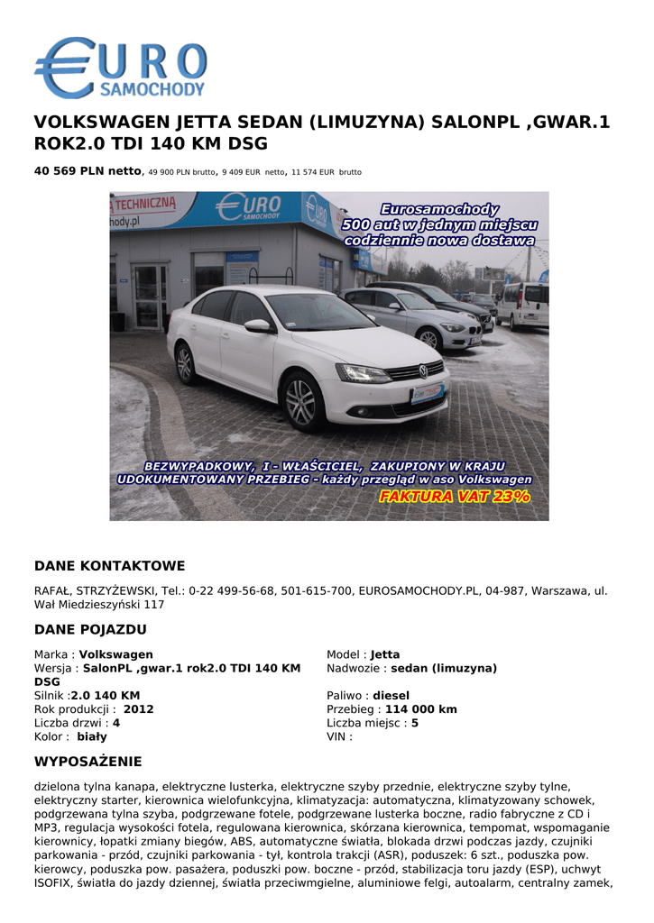 VOLKSWAGEN JETTA SEDAN (LIMUZYNA) SALONPL ,GWAR.1 ROK2.0 TDI 140 KM DSG 40 569 PLN netto, 49 900 PLN brutto, 9 409 EUR netto, 11 574 EUR brutto DANE KONTAKTOWE RAFAŁ, STRZYŻEWSKI, Tel.: 0-22 499-56-68, 501-615-700, EUROSAMOCHODY.PL, 04-987, Warszawa, ul. Wał Miedzieszyński 117 DANE POJAZDU Marka : Volkswagen Wersja : SalonPL ,gwar.1 rok2.0 TDI 140 KM DSG Silnik :2.0 140 KM Rok produkcji : 2012 Liczba drzwi : 4 Kolor : biały Model : Jetta Nadwozie : sedan (limuzyna) Paliwo : diesel Przebieg : 114 000 km Liczba miejsc : 5 VIN : WYPOSAŻENIE dzielona tylna kanapa, elektryczne lusterka, elektryczne szyby przednie, elektryczne szyby tylne, elektryczny starter, kierownica wielofunkcyjna, klimatyzacja: automatyczna, klimatyzowany schowek, podgrzewana tylna szyba, podgrzewane fotele, podgrzewane lusterka boczne, radio fabryczne z CD i MP3, regulacja wysokości fotela, regulowana kierownica, skórzana kierownica, tempomat, wspomaganie kierownicy, łopatki zmiany biegów, ABS, automatyczne światła, blokada drzwi podczas jazdy, czujniki parkowania - przód, czujniki parkowania - tył, kontrola trakcji (ASR), poduszek: 6 szt., poduszka pow. kierowcy, poduszka pow. pasażera, poduszki pow. boczne - przód, stabilizacja toru jazdy (ESP), uchwyt ISOFIX, światła do jazdy dziennej, światła przeciwmgielne, aluminiowe felgi, autoalarm, centralny zamek, immobiliser, komputer pokładowy, nawigacja satelitarna, reflektory halogenowe, reflektory ksenonowe, światła LED WYPOSAŻENIE DODATKOWE bezwypadkowy, gwarancja, książka serwisowa, możliwa zamiana, serwisowany w ASO, stan bardzo dobry OPIS POJAZDU Salon Polska WITAMY W NAJWIĘKSZYM W POLSCE SALONIE SAMOCHODÓW UŻYWANYCH SUPER PROMOCJA GWARANCJA TECHNICZNA NA 12 MIESIĘCY lub KOMPLET OPON ZIMOWYCH lub LETNICH GRATIS*(do wyczerpania zapasów, możliwość rozszerzenia gwarancji do 36 miesięcy) - 500 AUT Z GWARANCJĄ w jednym miejscu / różne marki , modele , wersje wyposażenia/ - 8 dni na zamianę auta - Sprawdzone pochodzenie pojazdów - bezwypadkowe - Gwarancja przebiegu - Gwarancja pełnej historii serwisowej - Samochody od I właściciela - dla klientów zamiejscowych rezerwacja auta do czasu przyjazdu - udzielamy 12-miesięcznej gwarancji technicznej, możliwość przedłużenia do 36-miesięcy /bez limitu kilometrów, ważna na terenie całej Polski + assistance- darmowe holowanie , potwierdzenie certyfikatem / Kupującemu oferujemy: 1. Jazdę próbną 2. Bezpłatny przegląd przedsprzedażowy obejmujący: - kontrolę amortyzatorów - hamulców - podwozia samochodu - pomiar geometrii - diagnoza komputerowa - pomiar grubości powłoki lakierniczej - możliwość sprawdzenia przed zakupem w serwisie lub stacji diagnostycznej lub za pośrednictwem niezależnego rzeczoznawcy na zlecenie kupującego /dla klientów zamiejscowych bez konieczności przyjazdu/. - wszystkie nasze samochody posiadają komplet dokumentów wymaganych do zarejestrowania bądź przerejestrowania samochodu - przyjmujemy auta w rozliczeniu oraz kupujemy /bez ograniczeń wiekowych/ - Zajmujemy się sprzedażą detaliczną oraz hurtową / zapraszamy do współpracy osoby prywatne, firmy również z branży i instytucje / -Kupujący otrzymuje fakturę VAT 23% /nie ponosi opłaty PCC w wysokości 2%/ -kredyt 0% wpłaty własnej,raty dopasowane do własnych potrzeb -leasing bez zaświadczeń ,również dla widniejących w BIK szybka obsługa na miejscu "Niniejsze ogłoszenia są wyłącznie informacją handlową i nie stanowią oferty w myśl art. 66, § 1. Kodeksu Cywilnego. Sprzedający nie odpowiada za ewentualne błędy lub nieaktualność ogłoszenia." Zapis ten został zamieszczony ze względu na możliwość niezamierzonych pomyłek. Jeżeli zauważysz nieścisłość napisz do nas. Szukasz pewnego używanego auta ? Tylko u nas sprawdzone samochody z polskich salonów To nie komis to salon aut używanych z wieloletnim doświadczeniem Więcej informacji na eurosamochody . pl ZADZWOŃ TERAZ!!! Rafał 501 615 700 Tomasz 512 345 150 Marcin 505 416 300 Piotr 501 087 038 Mariusz 500 130 727 QR CODE DLA OGŁOSZENIA Powered by TCPDF (www.tcpdf.org)